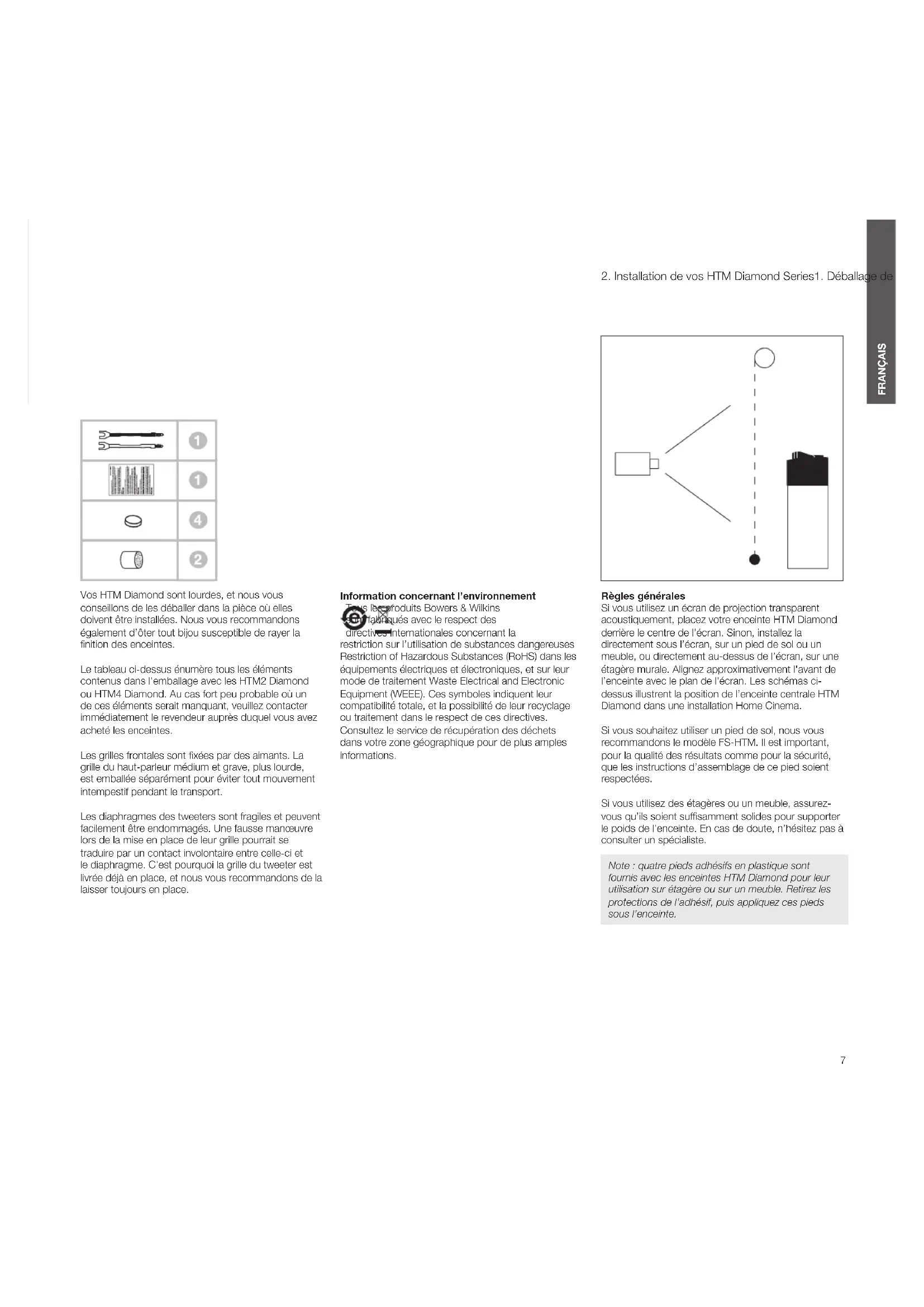 Vos HTM Diamond sont lourdes, et nous vous conseillons de les déballer dans la pièce où elles doivent être installées. Nous vous recommandons également d’ôter tout bijou susceptible de rayer la nition des enceintes. Le tableau ci-dessus énumère tous les éléments contenus dans l’emballage avec les HTM2 Diamond ou HTM4 Diamond. Au cas fort peu probable où un de ces éléments serait manquant, veuillez contacter immédiatement le revendeur auprès duquel vous avez acheté les enceintes. Les grilles frontales sont xées par des aimants. La grille du haut-parleur médium et grave, plus lourde, est emballée séparément pour éviter tout mouvement intempestif pendant le transport. Les diaphragmes des tweeters sont fragiles et peuvent facilement être endommagés. Une fausse manœuvre lors de la mise en place de leur grille pourrait se traduire par un contact involontaire entre celle-ci et le diaphragme. C’est pourquoi la grille du tweeter est livrée déjà en place, et nous vous recommandons de la laisser toujours en place. Information concernant l’environnement Tous les produits Bowers & Wilkins sont fabriqués avec le respect des directives internationales concernant la restriction sur l’utilisation de substances dangereuses Restriction of Hazardous Substances (RoHS) dans les équipements électriques et électroniques, et sur leur mode de traitement Waste Electrical and Electronic Equipment (WEEE). Ces symboles indiquent leur compatibilité totale, et la possibilité de leur recyclage ou traitement dans le respect de ces directives. Consultez le service de récupération des déchets dans votre zone géographique pour de plus amples informations. Règles générales Si vous utilisez un écran de projection transparent acoustiquement, placez votre enceinte HTM Diamond derrière le centre de l’écran. Sinon, installez la directement sous l’écran, sur un pied de sol ou un meuble, ou directement au-dessus de l’écran, sur une étagère murale. Alignez approximativement l'avant de l’enceinte avec le plan de l’écran. Les schémas ci- dessus illustrent la position de l’enceinte centrale HTM Diamond dans une installation Home Cinema. Si vous souhaitez utiliser un pied de sol, nous vous recommandons le modèle FS-HTM. Il est important, pour la qualité des résultats comme pour la sécurité, que les instructions d’assemblage de ce pied soient respectées. Si vous utilisez des étagères ou un meuble, assurez- vous qu’ils soient sufsamment solides pour supporter le poids de l’enceinte. En cas de doute, n’hésitez pas à consulter un spécialiste. Note : quatre pieds adhésifs en plastique sont fournis avec les enceintes HTM Diamond pour leur utilisation sur étagère ou sur un meuble. Retirez les protections de l’adhésif, puis appliquez ces pieds sous l’enceinte.8 FRANÇAIS