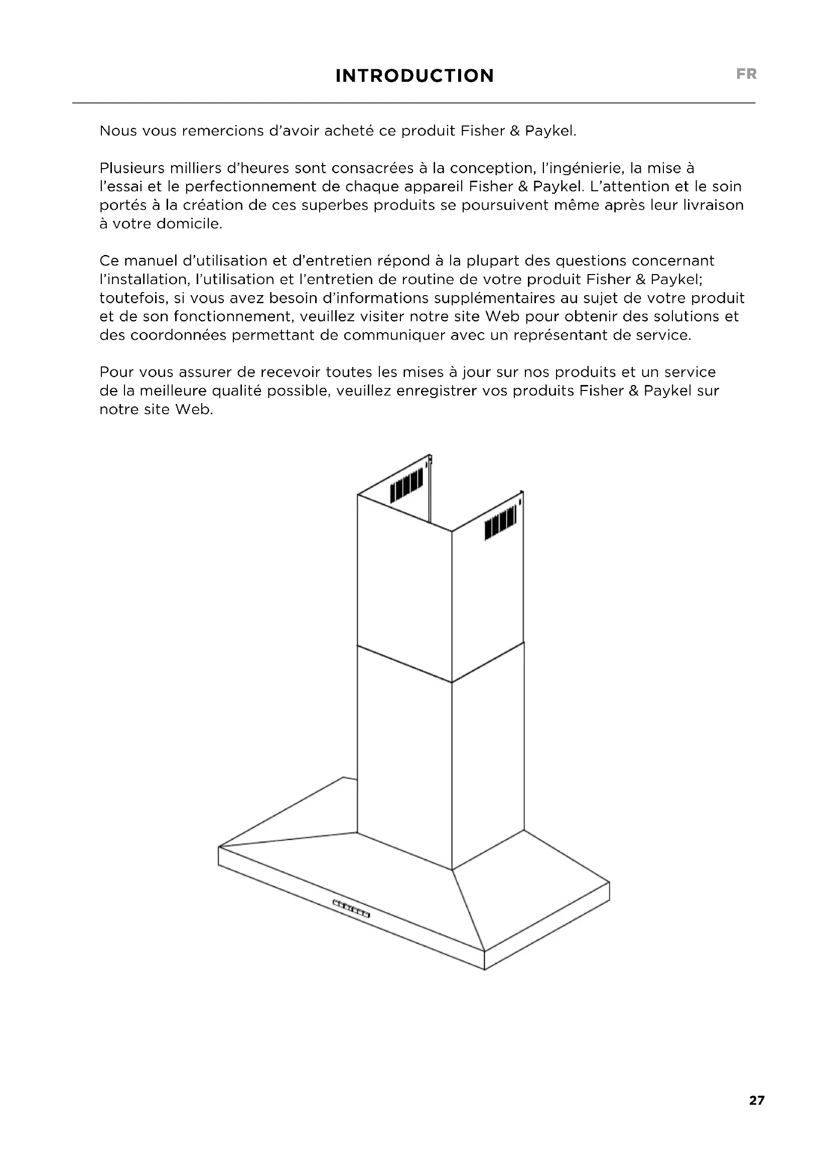 Introduction 27 Consignes de sécurité et mises en garde 28 Instructions d’installation 30 Instructions d’utilisation 42 Nettoyage et entretien 43 Pièces et accessoires 45 Service et garantie 4627 INTRODUCTION Nous vous remercions d’avoir acheté ce produit Fisher&Paykel. Plusieurs milliers d’heures sont consacrées à la conception, l’ingénierie, la mise à l’essaiet le perfectionnement de chaque appareil Fisher&Paykel. L’attention et le soin portés à la création de ces superbes produits se poursuivent même après leur livraison àvotre domicile. Ce manuel d’utilisation et d’entretien répond à la plupart des questions concernant l’installation, l’utilisation et l’entretien de routine de votre produit Fisher&Paykel; toutefois, si vous avez besoin d’informations supplémentaires au sujet de votre produit et de son fonctionnement, veuillez visiter notre site Web pour obtenir des solutions et des coordonnées permettant de communiquer avec un représentant deservice. Pour vous assurer de recevoir toutes les mises à jour sur nos produits et un service delameilleure qualité possible, veuillez enregistrer vos produits Fisher&Paykel sur notre site Web. FR28 CONSIGNES DE SÉCURITÉ ET MISES EN GARDE