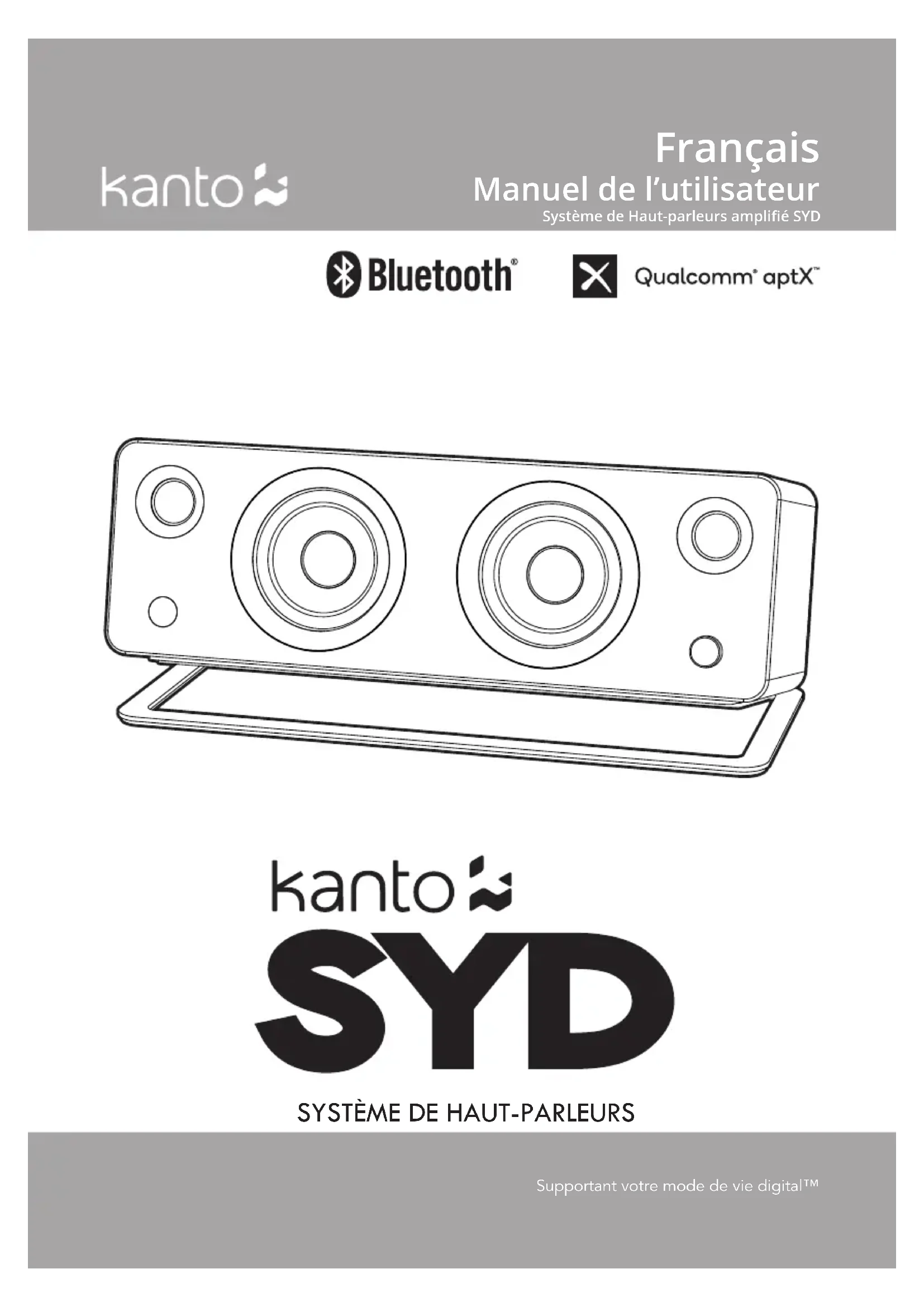 AVIS: Qualcomm aptX est un produit de Qualcomm Technologies International, Ltd. Qualcomm est une marque déposée de Qualcomm Incorporated, enregistrée aux États-Unis et dans d’autres pays, utilisée avec la permission. AptX est une marque déposée de Qualcomm Technologies International, Ltd., enregistrée aux États-Unis et dans d’autres pays, utilisée avec l’autorisation. AVIS: Cet appareil est étiqueté conformément à la directive européenne 2002/96 /EC qui concerne les déchets d’équipements électriques et électroniques (WEEE). Cette étiquette indique que ce produit ne doit pas être éliminé avec les déchets ménagers. Il devrait être déposé dans une installation appropriée pour permettre la récupération et le recyclage. SYSTÈME DE HAUT-PARLEURS AMPLIFIÉ SYDwww.kantoaudio.comsupport@kantoliving.com Sans–Frais: US & Canada: 1-888-848-2643 | UK: +44 800086999 Garantie limitée à l’acheteur initial Kanto Living Inc. (Kanto) garantit l’ensemble des produits qu’il fabrique contre tout défaut materiel pendant toute la période de garantie limitée de 2 ans.En cas de panne du matériel résultant de tels défauts et si Kanto en est informé avant 2 ans suivant la date d’envoi avec présentation de la facture originale délivrée par un revendeur agréé, Kanto s’engage, à sa discrétion, à fournir des pièces de remplacement ou à substituer le matériel, à condition que le système mécanique ou électrique du matériel en question n’ait été soumis à aucune modication et aucun abus. Toute pièce de remplacement ou tout appareil de substitution sera garanti pendant 90 jours à partir de la date d’envoi vers l’acheteur d’origine.Les clients seront chargés d’obtenir un numéro d’autorisation de renvoi et de payer les frais de retour du produit à un entrepôt de Kanto ou un centre agréé. Si le matériel est couvert en vertu de la garantie énoncée précédemment, Kanto s’engage à fournir des pièces de remplacement ou substituer le matériel et à assumer les frais d’envoi vers le client. Veillez à conserver l’emballage d’origine an d’éviter tout dommage au cours du transport. Il est également recommandé d’assurer votre colis.Les renseignements du manuel ont été soigneusement contrôlés et sont considérés comme exacts. Kanto décline toutefois toute responsabilité pour toute erreur contenue dans le manuel. Kanto ne pourra en aucun cas être tenu responsable de tout dommage direct, indirect, spécial, accidentel ou consécutif résultant d’un défaut quelconque de l’équipement, même si l’éventualité de tels dommages a été prévenu. Cette garantie remplace toutes les autres garanties explicites ou implicites, y compris, sans limitation, toute garantie implicite, y compris toute garantie de qualité marchande et d’adéquation à un usage particulier, toutes expressément exclues. 19-D Kanto Audio @kantoaudio kantoaudio