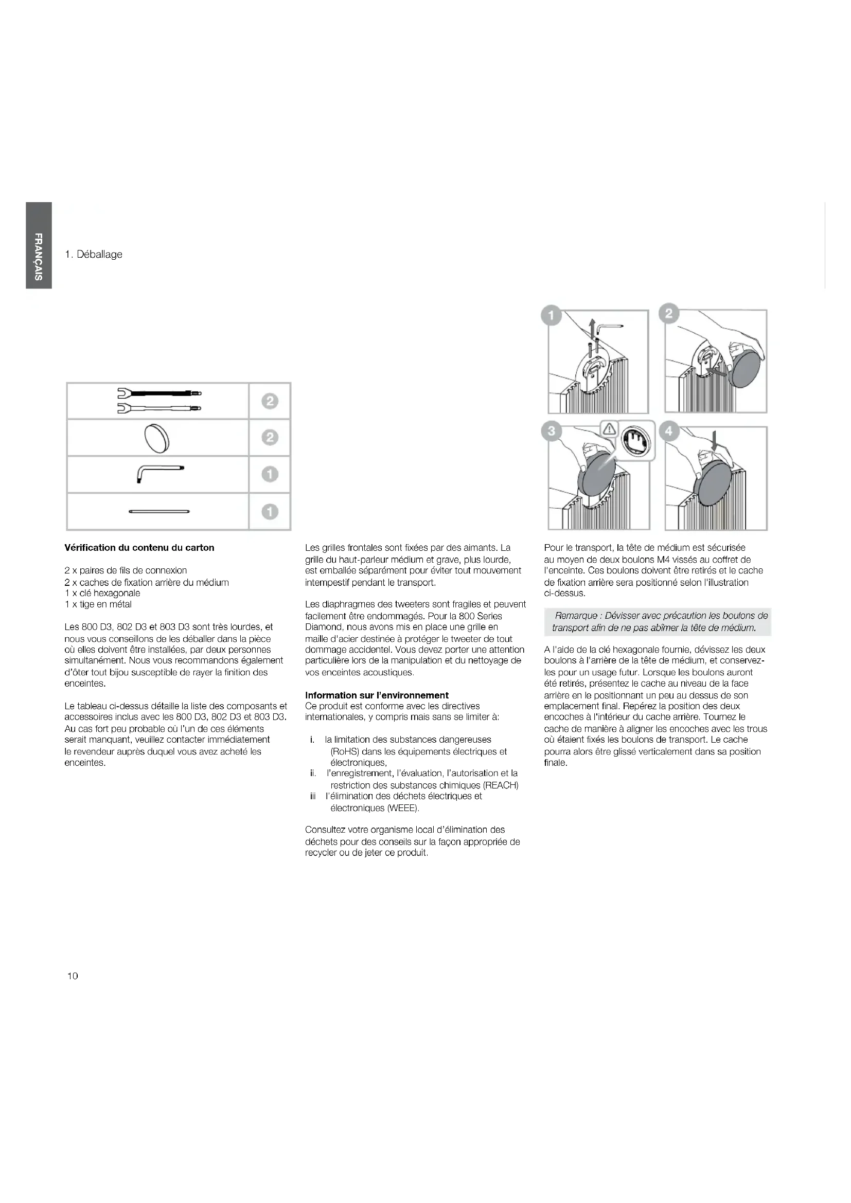 Vérication du contenu du carton 2 x paires de ls de connexion 2 x caches de xation arrière du médium 1 x clé hexagonale 1 x tige en métal Les 800 D3, 802 D3 et 803 D3 sont très lourdes, et nous vous conseillons de les déballer dans la pièce où elles doivent être installées, par deux personnes simultanément. Nous vous recommandons également d’ôter tout bijou susceptible de rayer la nition des enceintes. Le tableau ci-dessus détaille la liste des composants et accessoires inclus avec les 800 D3, 802 D3 et 803D3. Au cas fort peu probable où l’un de ces éléments serait manquant, veuillez contacter immédiatement le revendeur auprès duquel vous avez acheté les enceintes. Les grilles frontales sont xées par des aimants. La grille du haut-parleur médium et grave, plus lourde, est emballée séparément pour éviter tout mouvement intempestif pendant le transport. Les diaphragmes des tweeters sont fragiles et peuvent facilement être endommagés. Pour la 800 Series Diamond, nous avons mis en place une grille en maille d'acier destinée à protéger le tweeter de tout dommage accidentel. Vous devez porter une attention particulière lors de la manipulation et du nettoyage de vos enceintes acoustiques. Information sur l’environnement Ce produit est conforme avec les directives internationales, y compris mais sans se limiter à:
