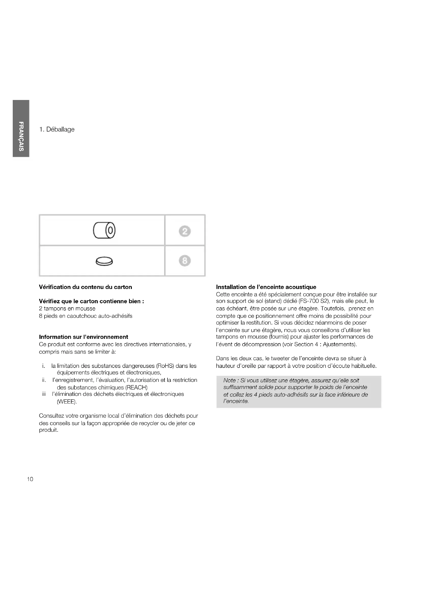 Vérication du contenu du carton Vériez que le carton contienne bien : 2 tampons en mousse 8 pieds en caoutchouc auto-adhésifs Information sur l’environnement Ce produit est conforme avec les directives internationales, y compris mais sans se limiter à: