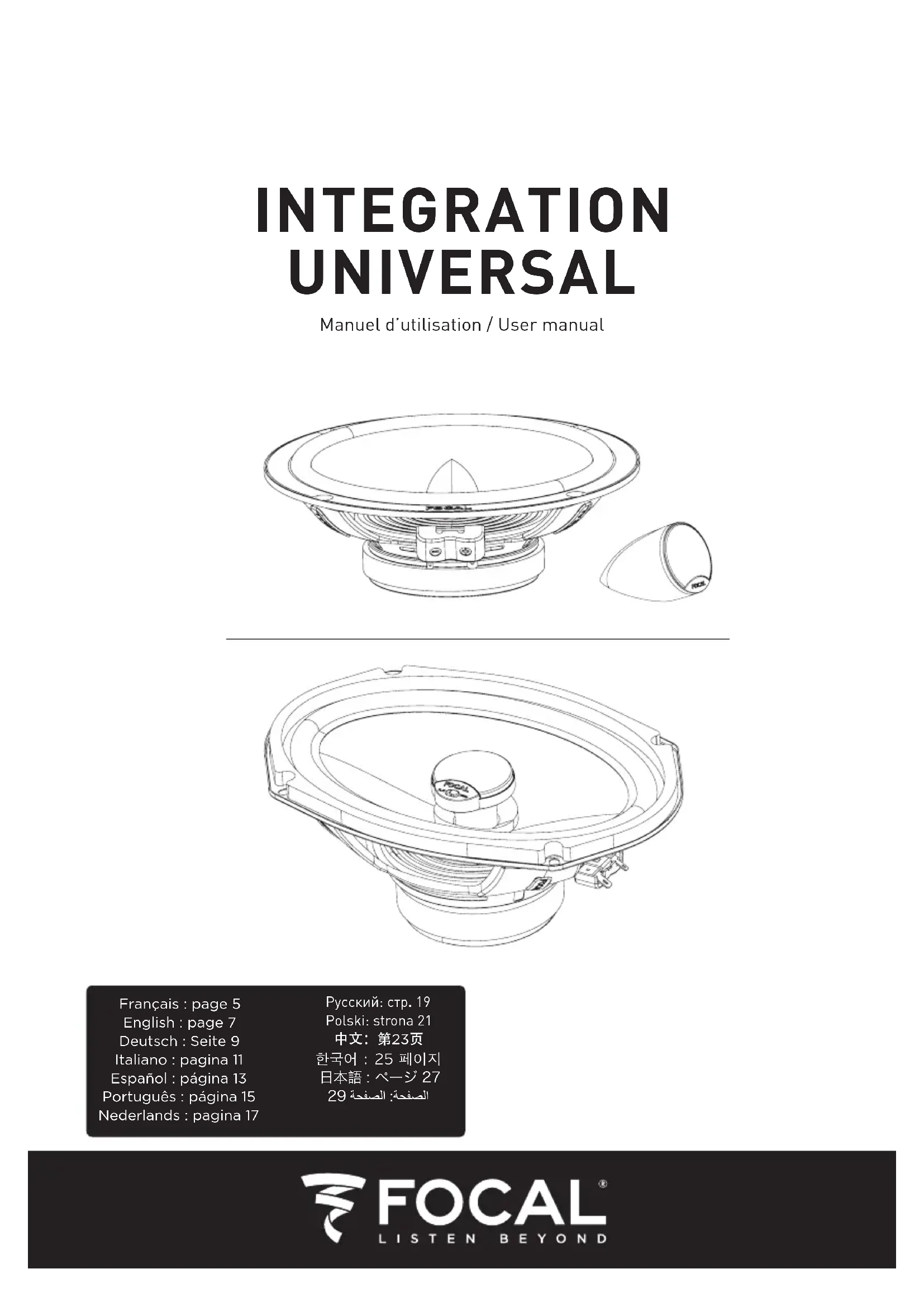 - Procédez à un nettoyage soigneux avant de monter les haut-parleurs. Condition de garantie En cas de problème, adressez-vous à votre revendeur Focal. La garantie pour la France sur tout matériel Focal est de 2 ans non transmissible en cas de revente, à partir de la date d’achat. En cas de matériel défectueux, celui-ci doit être expédié à vos frais, dans son emballage d’origine auprès du revendeur, lequel analysera le matériel et déterminera la nature de la panne. Si celui- ci est sous garantie, le matériel vous sera rendu ou remplacé en “franco de port”. Dans le cas contraire, un devis de réparation vous sera proposé. La garantie ne couvre pas les dommages résultant d’une mauvaise utilisation ou d’un branchement incorrect (bobines mobiles brûlées par exemple...) Information sur l’environnement Votre produit Focal-JMlab a été conçu et fabriqué avec des matériaux et composants de haute qualité, susceptibles d’être recyclés et réutilisés. Ce symbole signifie que les appareils électriques et électroniques, lorsqu’ils sont arrivés en fin de vie, doivent être éliminés séparément des ordures ménagères. Veuillez rapporter cet appareil à la déchetterie communale ou à un centre de recyclage. Vous contribuez ainsi à la préservation de l’environnement. Installation du tweeter ISU130, ISU165, ISU200, ISU570, ISU690 Il existe 3 possibilités de montage : Montage dans le support incliné : (Fig. A1) Faire un trou à l’endroit souhaité pour le passage des câbles et des vis, fixer le support à l’aide des vis fournies dans le kit, passer les 2 fils puis monter le tweeter dans son logement (montage ajusté). Ces opérations sont réalisables avec la grille du tweeter montée. Montage encastré (Flush) : (Fig. A2) Découper un trou au diamètre du tweeter à l’endroit souhaité. Insérer ensuite le tweeter. Montage dans un emplacement d’origine : (Fig. B) Dévisser le cache plastique à l’arrière du tweeter, en le tournant vers la gauche (vers le symbole ‘’unlocked’’ / Fig.B). Vous pouvez maintenant monter le tweeter seul dans un emplacement d’origine. NB : le “+” est repéré par la ligne rouge. Attention lors des manipulations de celui-ci, de ne pas toucher le dôme, ni de le mettre en contact avec la partie arrière de la grille d’origine du véhicule. Enregistrez votre produit en ligne sur www.focal.com/garantie et obtenez votre certificat de garantie.6 Connexion du tweeter : (Fig. C) Pour une installation sur un présentoir de démonstration : brancher le fil ‘’display’’. Pour le branchement dans un véhicule : brancher le fil ‘’car’’. Le fil repéré ‘’-‘’ reste le pôle négatif dans les 2 cas de branchement. Connexion du tweeter / woofer au connecteur filtre intégré : (Fig. D) Pour le tweeter: connecter directement les deux fils (Fig.D1) aux cosses du filtre intégré. Pour le woofer: Connecter directement les deux cosses du filtre intégré (Fig.D2) aux deux bornes du saladier du woofer. NB : le “+” est repéré par la ligne rouge. Attention : le filtre tweeter est intégré au connecteur. Veuillez respecter le branchement à l’aide des cosses (tweeter/ connecteur filtre) afin d’assurer les performances optimales des kits. Les woofers des kits ISU130, ISU165, ISU200, ISU570 et ISU690 sont également équipés d’un filtre intégré à la connectique (pour conserver un saladier le plus compact et le plus simple à intégrer dans les emplacements d’origine). Veillez à connecter OBLIGATOIREMENT ces connecteurs (livrés dans la boite). Installation des différents woofers (Fig.E) représente l’installation type des haut-parleurs ISU130, ISU165, ISU200, ISU570, ISU690. (Fig.E1) Fixer le haut parleur à l’aide des vis fournies. (Fig.E2) représente le haut parleur une fois vissé. (Fig.F) représente l’installation type des haut-parleurs ICU100, ICU130, ICU165, ICU570. (Fig.F1) Fixer le haut parleur à l’aide des vis fournies. (Fig.F2) représente le haut parleur une fois vissé. (Fig.G) représente l’installation type du haut parleur ICU690 et de sa grille. (Fig.G1) Insérer le support plastique de la grille au dos du haut-parleur, fixer le haut parleur à l’aide des vis fournies, puis clipser la grille fournie sur l’ensemble. (Fig. G2) représente le haut parleur une fois vissé et recouvert par sa grille de protection. Réglage du niveau tweeter (ICU100, ICU130, ICU165, ICU570, ICU690) Le tweeter intégré dans les haut-parleurs coaxiaux est équipé d’un réglage de niveau permettant de choisir entre deux niveaux d’émissions de fréquences aigues (Fig.H): Vue de l’installation complète dans le véhicule (Fig.I) représente un exemple de l’installation complète d’un kit éclaté (ISU130, ISU165, ISU200, ISU570, ISU690) (Fig.J) représente un exemple de l’installation complète d’un kit coaxial (ICU100, ICU130, ICU165, ICU570, ICU690) Si les haut-parleurs sont situés dans la partie inférieure de la porte, nous préconisons de régler le tweeter sur ‘’HIGH’’ pour remonter les aigus. Si les haut-parleurs sont situés dans la partie supérieure de la porte, nous préconisons de régler le tweeter sur ‘’FLAT’’. NB: vous avez bien sûr la possibilité de faire ces réglages de niveaux selon vos préférences personnelles INTEGRATION UNIVERSAL Manuel d’utilisation / User manual7English Warning Listening for a prolonged period at a high volume level over 110 dB may result in hearing loss. Exposure, even brief, to sound at over 130 dB may result in irreparable hearing loss. Important recommendations First of all, check the space available for the loudspeakers (see the plans on the packaging) and then start cutting. If the loudspeakers are to be mounted in their original place, check whether there is enough space between the loudspeaker and the protective grating.