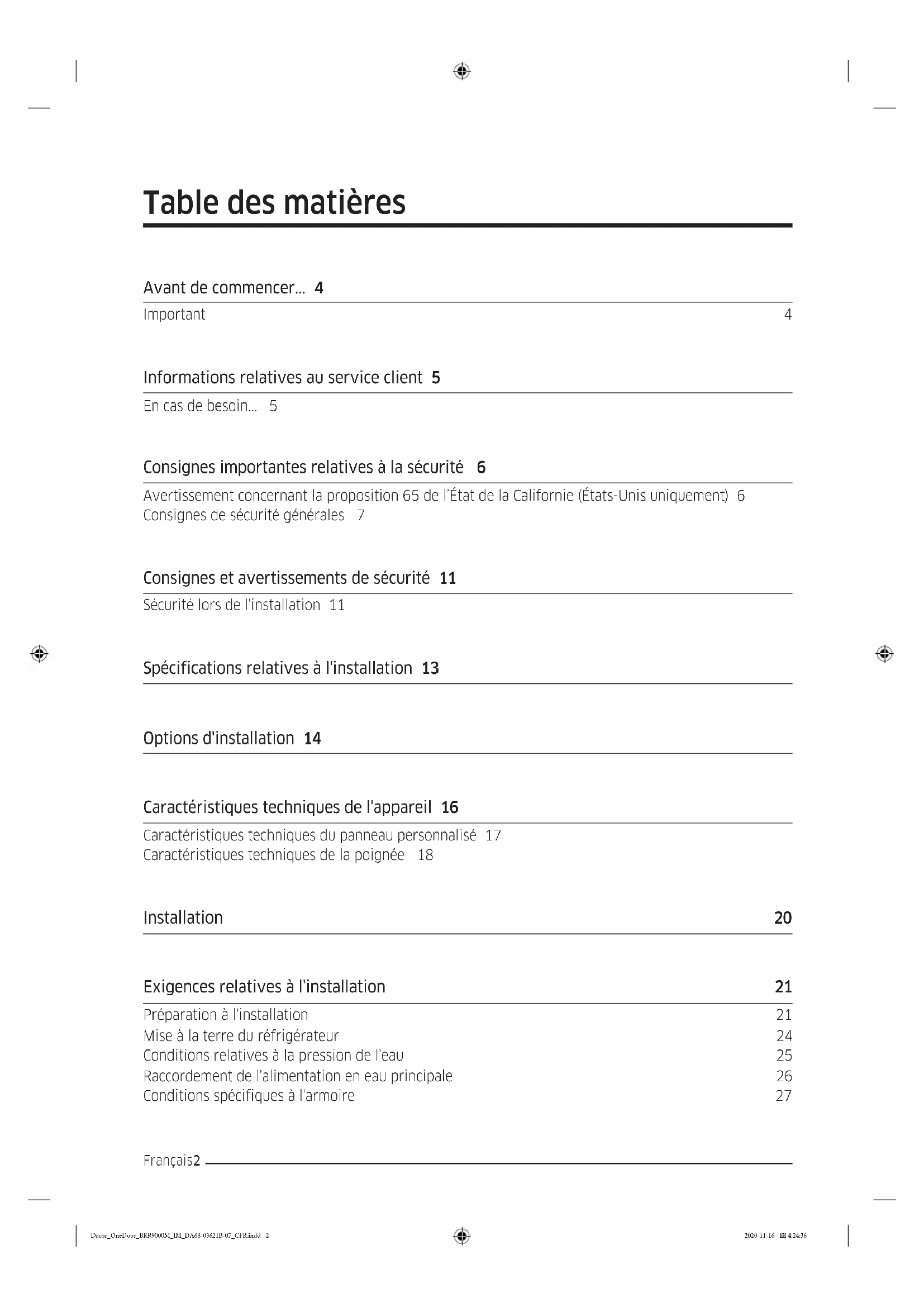 - Conservez ce manuel afin vous puissiez vous y référer ultérieurement, tout comme les techniciens, le personnel de service, etc. Dacor_OneDoor_BRR9000M_IM_DA68-03621B-07_CFR.indd 4 2020-11-16 4:24:37CONSERVEZ CES INSTRUCTIONS Français 5 Informations relatives au service client En cas de besoin... Pour toute question ou tout problème relatif à l'installation, contactez votre revendeur Dacor® ou l'équipe du service client Dacor. Si votre appareil Dacor est sous garantie, appelez le service différencié Dacor. Préparez les numéros de série/modèle de votre appareil avant d'appeler. (Ces numéros figurent sur l'étiquette de données du montant droit de la porte à l'intérieur du réfrigérateur.) Service différencié Dacor (réparations sous garantie uniquement) Téléphone : (833) 353-5483 (États-Unis et Canada) du lundi au vendredi, de 05 h 00 à 17 h 00 (heure du Pacifique) Service client Dacor Téléphone : (833) 353-5483 ex. 2813 (États-Unis et Canada) du lundi au vendredi, de 05 h 00 à 17 h 00 (heure du Pacifique) Site Web : www.dacor.com Toutes les spécifications peuvent être modifiées sans préavis. Dacor n'est pas responsable des changements apportés aux spécifications. © 2017 Dacor, tous droits réservés. Dacor_OneDoor_BRR9000M_IM_DA68-03621B-07_CFR.indd 5 2020-11-16 4:24:37CONSERVEZ CES INSTRUCTIONS Français6 Consignes importantes relatives à la sécurité Les Consignes importantes relatives à la sécurité et les avertissements fournis dans les présentes instructions ne sont pas destinés à traiter tous les problèmes et conditions possibles pouvant survenir.Faites preuve de bon sens et de précaution lors de l'installation, de la maintenance ou de l'utilisation de cet appareil ou de tout autre.Prenez toujours contact avec l'équipe de service client Dacor en cas de problèmes ou de conditions que vous ne comprenez pas. Voir Informations relatives au service client. Étiquettes et symboles de sécurité Ces alertes ont pour but d'attirer votre attention sur des éléments importants dans le manuel.Dès lors que vous voyez ces symboles ou étiquettes, lisez attentivement le message correspondant avant de poursuivre. DANGER Dangers immédiats qui PROVOQUERONT des blessures graves voire mortelles. AVERTISSEMENT Pratiques dangereuses ou risquées qui POURRAIENT PROVOQUER des blessures graves voire mortelles. ATTENTION Pratiques inadaptées ou dangereuses qui SERAIENT SUSCEPTIBLES DE PROVOQUER des blessures légères ou des dommages matériels. Avertissement concernant la proposition 65 de l’État de la Californie (États-Unis uniquement) AVERTISSEMENT : Cet appareil contient des produits chimiques connus de l’État de la Californie pour causer le cancer et des anomalies congénitales ou des effets nocifs sur la reproduction.Dacor_OneDoor_BRR9000M_IM_DA68-03621B-07_CFR.indd 6 2020-11-16 4:24:37CONSERVEZ CES INSTRUCTIONS Français 7