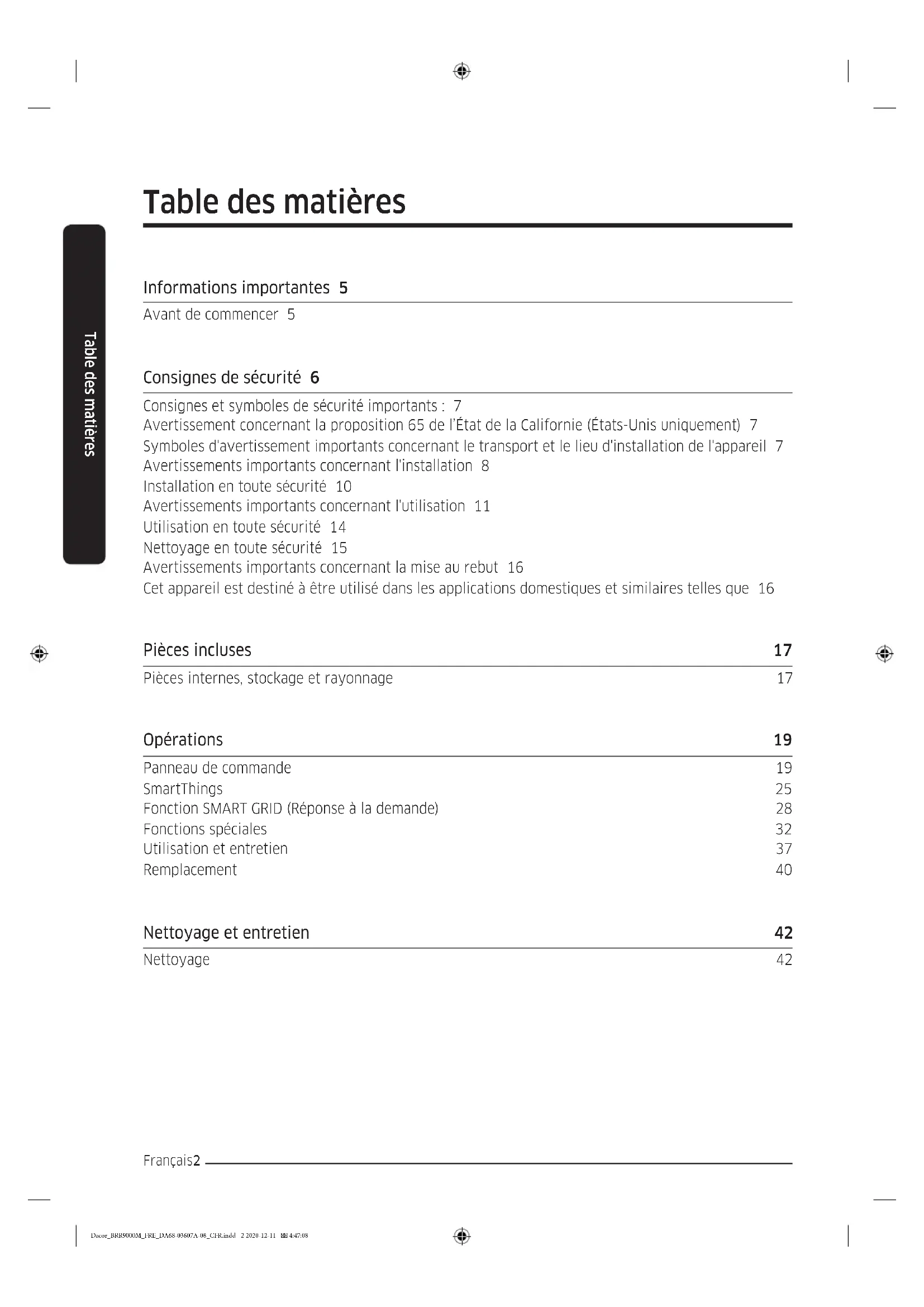 DRZ30990*** / DRZ36980*** Dacor_BRR9000M_FRE_DA68-03607A-08_CFR.indd 1 2020-12-11 4:47:08Français2 Table des matières Table des matières Informations importantes 5 Avant de commencer 5 Consignes de sécurité 6 Consignes et symboles de sécurité importants : 7 Avertissement concernant la proposition 65 de l’État de la Californie (États-Unis uniquement) 7 Symboles d'avertissement importants concernant le transport et le lieu d'installation de l'appareil 7 Avertissements importants concernant l'installation 8 Installation en toute sécurité 10 Avertissements importants concernant l'utilisation 11 Utilisation en toute sécurité 14 Nettoyage en toute sécurité 15 Avertissements importants concernant la mise au rebut 16 Cet appareil est destiné à être utilisé dans les applications domestiques et similaires telles que 16 Pièces incluses 17 Pièces internes, stockage et rayonnage 17 Opérations 19 Panneau de commande 19 SmartThings 25 Fonction SMART GRID (Réponse à la demande) 28 Fonctions spéciales 32 Utilisation et entretien 37 Remplacement 40 Nettoyage et entretien 42 Nettoyage 42 Dacor_BRR9000M_FRE_DA68-03607A-08_CFR.indd 2 2020-12-11 4:47:08Français 3 Table des matières Dépannage 43 Généralités 43 Votre réfrigérateur émet un bruit anormal ? 46 Ouverture automatique de la porte (OAP) 48 SmartThings 49 Smart Grid (Réponse à la demande) 50 Garantie et service 52 Service client 52 Garantie 52 Avis d'application de la réglementation 56 Norme FCC 56 Norme IC 57 Dacor_BRR9000M_FRE_DA68-03607A-08_CFR.indd 3 2020-12-11 4:47:08Français4 Chers clients, Félicitations pour votre achat des produits Dacor® les plus récents ! Notre combinaison unique de caractéristiques, de style et de performances nous a permis de créer un produit essentiel pour votre foyer. Afin de vous familiariser avec les commandes, les fonctions et tout le potentiel de votre nouvel appareil Dacor, lisez attentivement ce manuel d'utilisation et d'entretien en commençant par la section des Consignes importantes de sécurité. Tous les appareils Dacor sont conçus et fabriqués avec qualité et fierté dans le respect de nos valeurs d'entreprise. Si vous rencontrez un problème avec votre produit, veuillez d'abord consulter la section Dépannage de ce manuel pour obtenir de l'aide. Il vous donnera des suggestions et des solutions avant de contacter le service d'assistance. Nos clients nous aident à améliorer nos produits et nos services de façon continue. N'hésitez pas à contacter notre équipe du service client pour obtenir de l'aide en cas de besoin. Équipe du service client Dacor 14425 Clark Avenue City of Industry, CA 91745 Téléphone : (833) 353-5483 Fax : (626) 403-3130 Horaires d'ouverture : du lundi au vendredi, de 05 h 00 à 17 h 00 (heure du Pacifique) Site web : www.Dacor.com Merci d'avoir choisi Dacor pour votre foyer. Nous sommes une entreprise créée par des familles pour des familles et nous nous mettons au service de la vôtre. Nous sommes convaincus que votre nouveau produit Dacor vous apportera plaisir et hautes performances pendant de nombreuses années. Sincères salutations, Dacor_BRR9000M_FRE_DA68-03607A-08_CFR.indd 4 2020-12-11 4:47:08Français 5 Informations importantes Informations importantes Avant de commencer