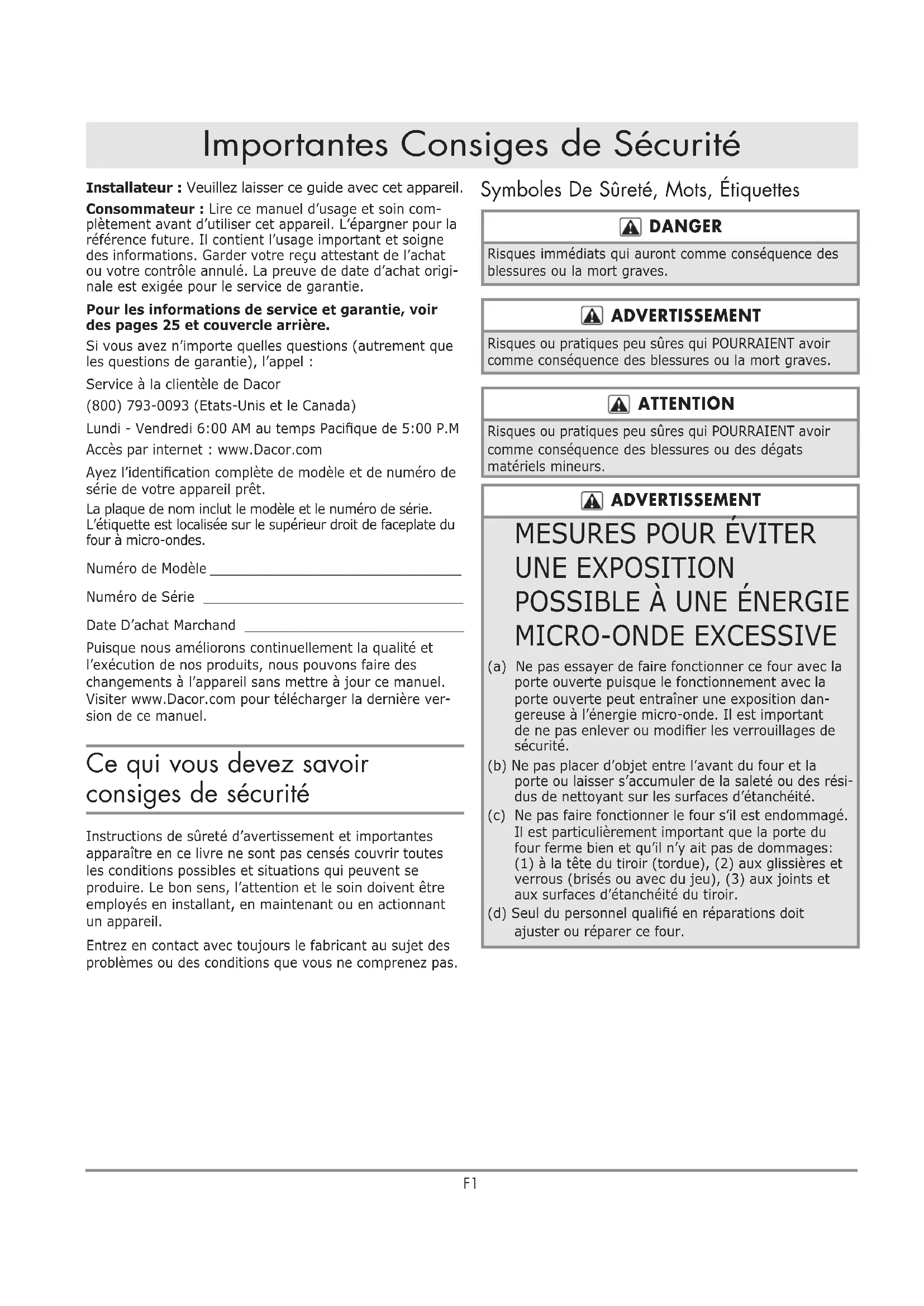 stallateur : Veuillez laisser ce guide avec cet appareil.Consommateur : Lire ce manuel d’usage et soin com-plètement avant d’utiliser cet appareil. L’épargner pour la référence future. Il contient l’usage important et soigne des informations. Garder votre reçu attestant de l’achat ou votre contrôle annulé. La preuve de date d’achat origi-nale est exigée pour le service de garantie.Pour les informations de service et garantie, voir des pages 25 et couvercle arrière.Si vous avez n’importe quelles questions (autrement que les questions de garantie), l’appel : Service à la clientèle de Dacor (800) 793-0093 (Etats-Unis et le Canada)Lundi - Vendredi 6:00 AM au temps Pacique de 5:00 P.MAccès par internet : www.Dacor.comAyez l’identication complète de modèle et de numéro de série de votre appareil prêt. La plaque de nom inclut le modèle et le numéro de série. L’étiquette est localisée sur le supérieur droit de faceplate du four à micro-ondes. Numéro de Modèle _______________________________Numéro de Série ________________________________Date D’achat Marchand ___________________________Puisque nous améliorons continuellement la qualité et l’exécution de nos produits, nous pouvons faire des changements à l’appareil sans mettre à jour ce manuel. Visiter www.Dacor.com pour télécharger la dernière ver-sion de ce manuel. Ce qui vous devez savoir consiges de sécurité Instructions de sûreté d’avertissement et importantes apparaître en ce livre ne sont pas censés couvrir toutes les conditions possibles et situations qui peuvent se produire. Le bon sens, l’attention et le soin doivent être employés en installant, en maintenant ou en actionnant un appareil.Entrez en contact avec toujours le fabricant au sujet des problèmes ou des conditions que vous ne comprenez pas. Importantes Consiges de Sécurité Symboles De Sûreté, Mots, Étiquettes DANGER Risques immédiats qui auront comme conséquence des blessures ou la mort graves. ADVERTISSEMENT Risques ou pratiques peu sûres qui POURRAIENT avoir comme conséquence des blessures ou la mort graves. ATTENTION Risques ou pratiques peu sûres qui POURRAIENT avoir comme conséquence des blessures ou des dégats matériels mineurs. ADVERTISSEMENT