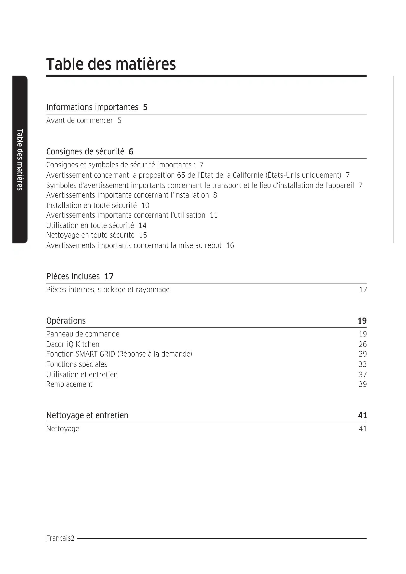 FDR_Dacor_BRF8000M_DA68-03574B-01_MES.indd 54 2017-03-31 12:53:21Notas FDR_Dacor_BRF8000M_DA68-03574B-01_MES.indd 55 2017-03-31 12:53:21Dacor ∙ 14425 Clark Avenue, City of Industry, CA 91745 ∙ Teléfono: (800) 793-0093 ∙ Fax: (626) 403-3130 ∙ www.dacor.com DA68-03574B-01 FDR_Dacor_BRF8000M_DA68-03574B-01_MES.indd 56 2017-03-31 12:53:21Guide d’utilisation Réfrigérateur encastré Heritage DRF36* FDR_Dacor_BRF8000M_DA68-03574B-01_CFR.indd 1 2017-03-31 12:52:55Français2 Table des matières Table des matières Informations importantes 5 Avant de commencer 5 Consignes de sécurité 6 Consignes et symboles de sécurité importants : 7 Avertissement concernant la proposition 65 de l’État de la Californie (États-Unis uniquement) 7 Symboles d'avertissement importants concernant le transport et le lieu d'installation de l'appareil 7 Avertissements importants concernant l'installation 8 Installation en toute sécurité 10 Avertissements importants concernant l'utilisation 11 Utilisation en toute sécurité 14 Nettoyage en toute sécurité 15 Avertissements importants concernant la mise au rebut 16 Pièces incluses 17 Pièces internes, stockage et rayonnage 17 Opérations 19 Panneau de commande 19 Dacor iQ Kitchen 26 Fonction SMART GRID (Réponse à la demande) 29 Fonctions spéciales 33 Utilisation et entretien 37 Remplacement 39 Nettoyage et entretien 41 Nettoyage 41 FDR_Dacor_BRF8000M_DA68-03574B-01_CFR.indd 2 2017-03-31 12:52:55Français 3 Table des matières Dépannage 42 Généralités 42 Votre réfrigérateur émet un bruit anormal ? 45 Dacor iQ Kitchen 47 Smart Grid (Réponse à la demande) 48 Garantie et service 50 Service client 50 Garantie 50 Avis d'application de la réglementation 54 Norme FCC 54 Norme IC 55 FDR_Dacor_BRF8000M_DA68-03574B-01_CFR.indd 3 2017-03-31 12:52:55Français4 Chers clients, Félicitations pour votre achat des produits Dacor® les plus récents ! Notre combinaison unique de caractéristiques, de style et de performances nous a permis de créer The Life of the Kitchen™, un produit essentiel pour votre foyer. An de vous familiariser avec les commandes, les fonctions et tout le potentiel de votre nouvel appareil Dacor, lisez attentivement ce manuel d'utilisation et d'entretien en commençant par la section des Consignes importantes de sécurité. Tous les appareils Dacor sont conçus et fabriqués avec qualité et erté dans le respect de nos valeurs d'entreprise. Si vous rencontrez un problème avec votre produit, veuillez d'abord consulter la section Dépannage de ce manuel pour obtenir de l'aide. Il vous donnera des suggestions et des solutions avant de contacter le service d'assistance. Nos clients nous aident à améliorer nos produits et nos services de façon continue. N'hésitez pas à contacter notre équipe du service client pour obtenir de l'aide en cas de besoin. Équipe du service client Dacor 14425 Clark Avenue City of Industry, CA 91745 Téléphone : (800) 793-0093 Fax : (626) 403-3130 Horaires d'ouverture : du lundi au vendredi, de 06 h 00 à 17 h 00 (heure du Pacique) Site web : www.Dacor.com Merci d'avoir choisi Dacor pour votre foyer. Nous sommes une entreprise créée par des familles pour des familles et nous nous mettons au service de la vôtre. Nous sommes convaincus que votre nouveau produit Dacor vous apportera plaisir et hautes performances pendant de nombreuses années. Sincères salutations, FDR_Dacor_BRF8000M_DA68-03574B-01_CFR.indd 4 2017-03-31 12:52:55Français 5 Informations importantes Informations importantes Avant de commencer Installateur