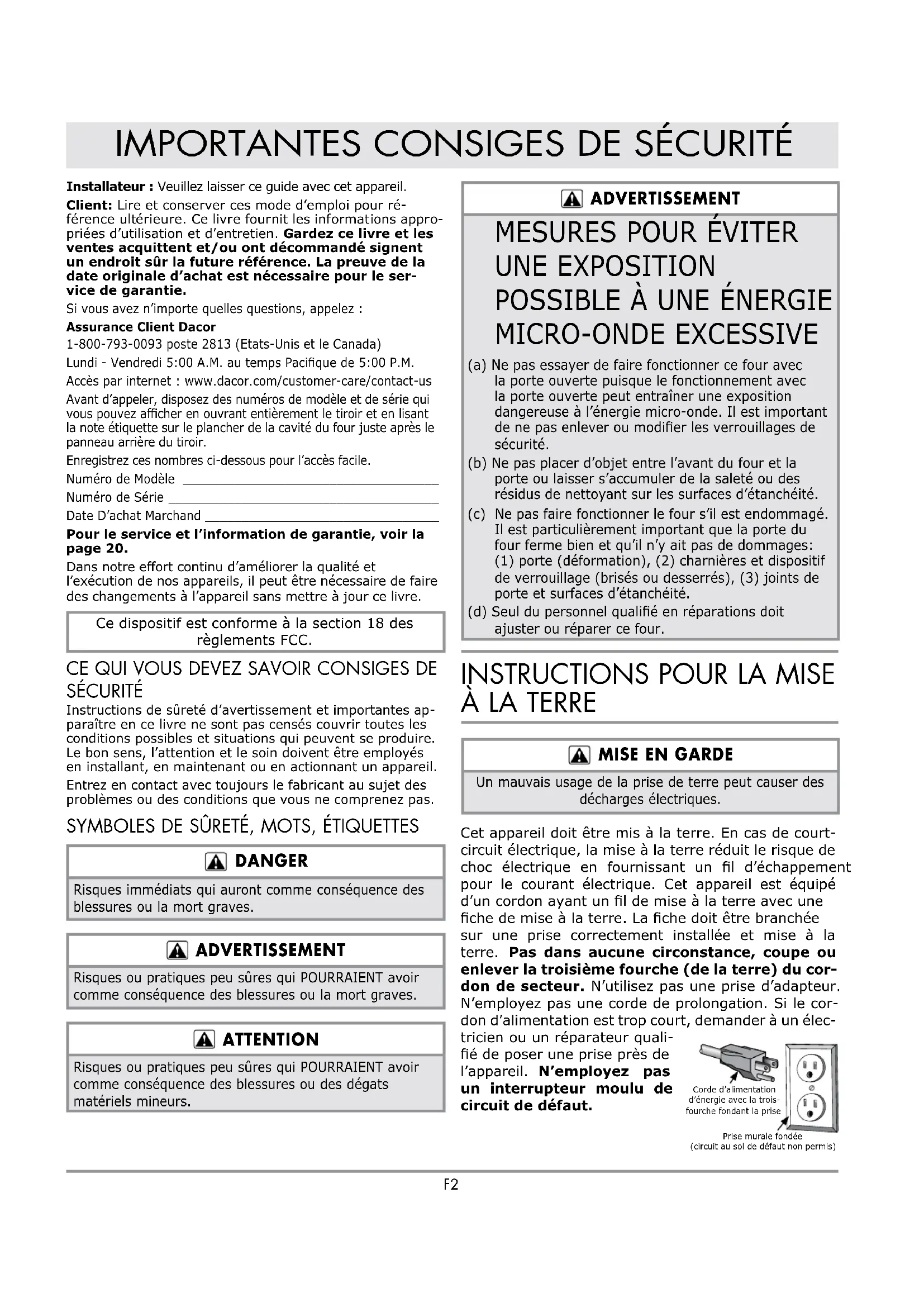 RATEUR DACOR AUTORISÉ. Lors de l’utilisation l’appareil, il faut prendre des mesures de sécurité élémentaires, y compris les suivantes : ADVERTISSEMENT Pour réduire le risque de brûlures, de choc électrique, de blessures personnelles et d’exposition excessive à l’énergie micro-onde :F4 Ce Que Vous Devez Savoir À Propos Du Déballage Et De L’inspection De Votre Microwave In-A-Drawer