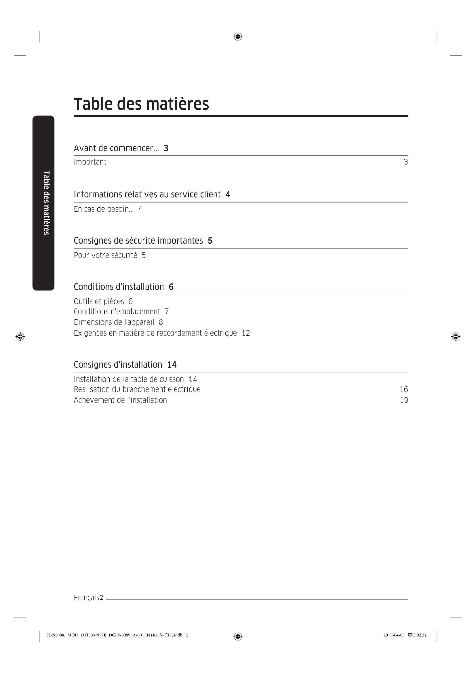 /8” (80,5) NZ9500K_MOD_DTI30M977B_DG68-00898A-00_EN+MES+CFR.indb 8 2017-04-05 3:02:32Français 9 Conditions d'installation IMPORTANT : Si vous installez une hotte pour cuisinière/pour micro-ondes au-dessus de la table de cuisson, suivez les instructions d'installation de la hotte pour cuisinière ou de la hotte pour micro-ondes concernant les dimensions et les dégagements requis au-dessus de la surface de la table de cuisson.