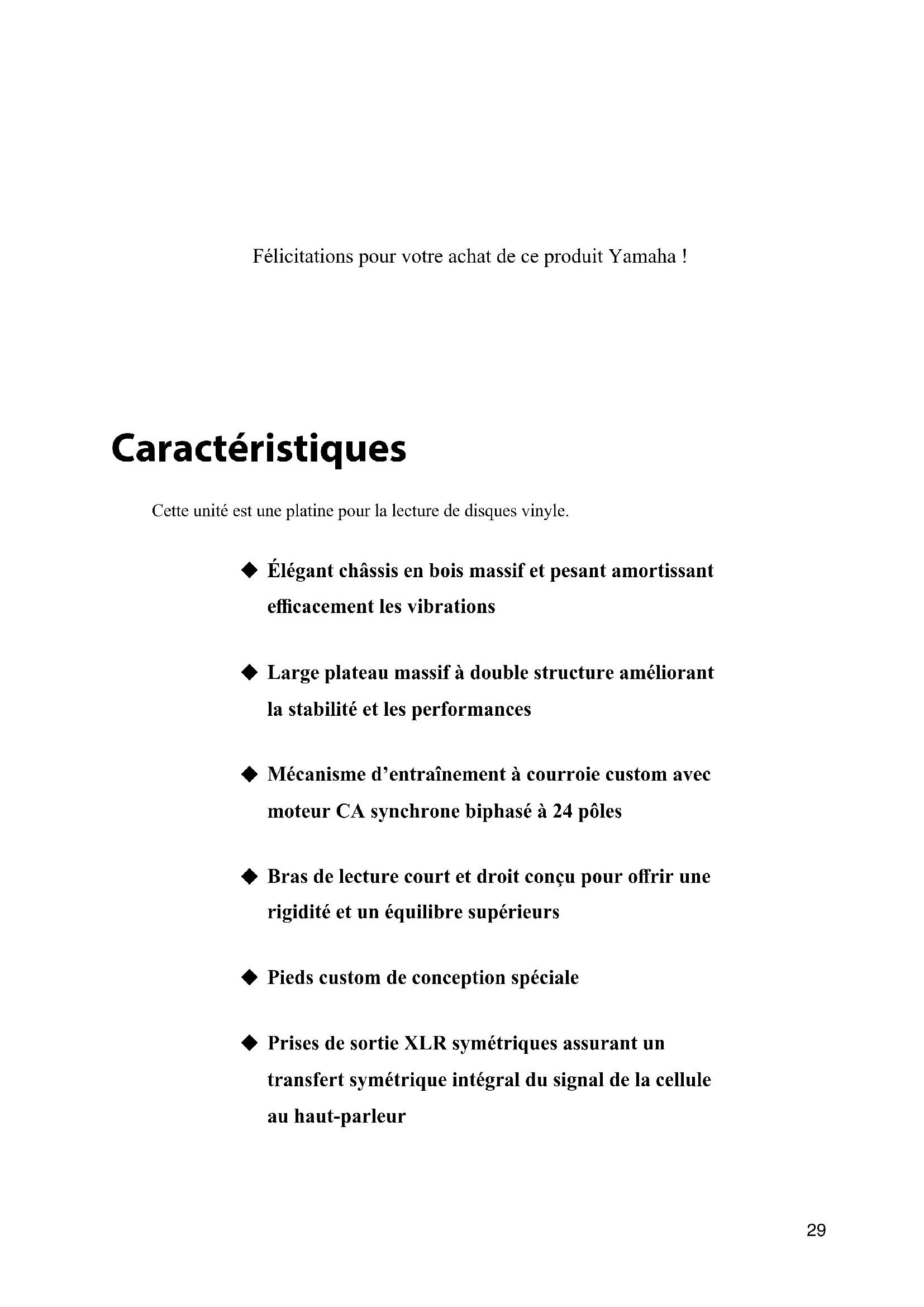 - The contents of this manual apply to the latest specicationsasofthepublishingdate.Toobtain the latest manual, access the Yamaha website then downloadthemanualle.29 Félicitations pour votre achat de ce produit Yamaha ! Caractéristiques Cette unité est une platine pour la lecture de disques vinyle.