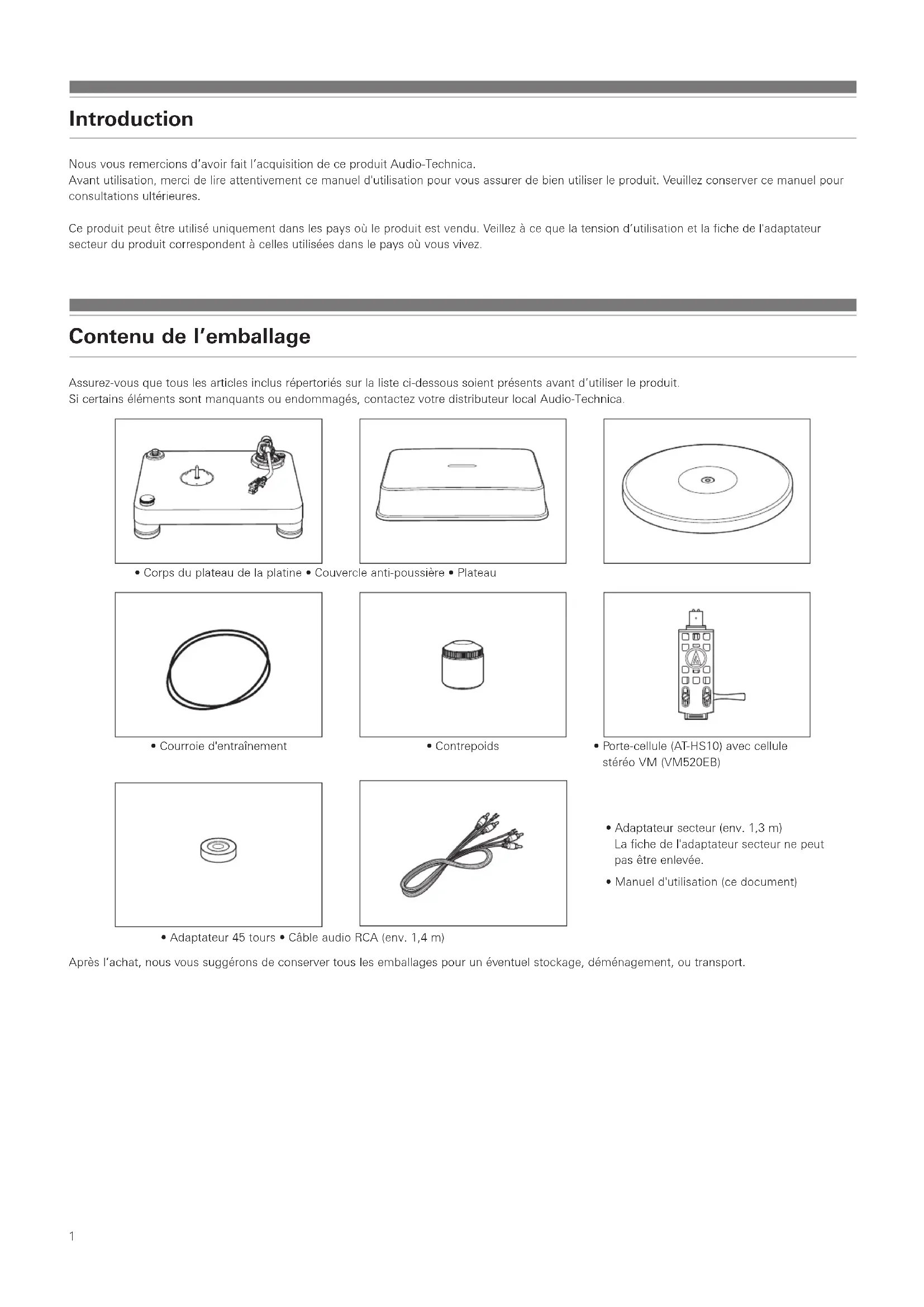 Memo1 Introduction Nous vous remercions d’avoir fait l’acquisition de ce produit Audio-Technica. Avant utilisation, merci de lire attentivement ce manuel d'utilisation pour vous assurer de bien utiliser le produit. Veuillez conserver ce manuel pour consultations ultérieures. Ce produit peut être utilisé uniquement dans les pays où le produit est vendu. Veillez à ce que la tension d’utilisation et la fiche de l'adaptateur secteur du produit correspondent à celles utilisées dans le pays où vous vivez. Contenu de l’emballage Assurez-vous que tous les articles inclus répertoriés sur la liste ci-dessous soient présents avant d’utiliser le produit. Si certains éléments sont manquants ou endommagés, contactez votre distributeur local Audio-Technica.