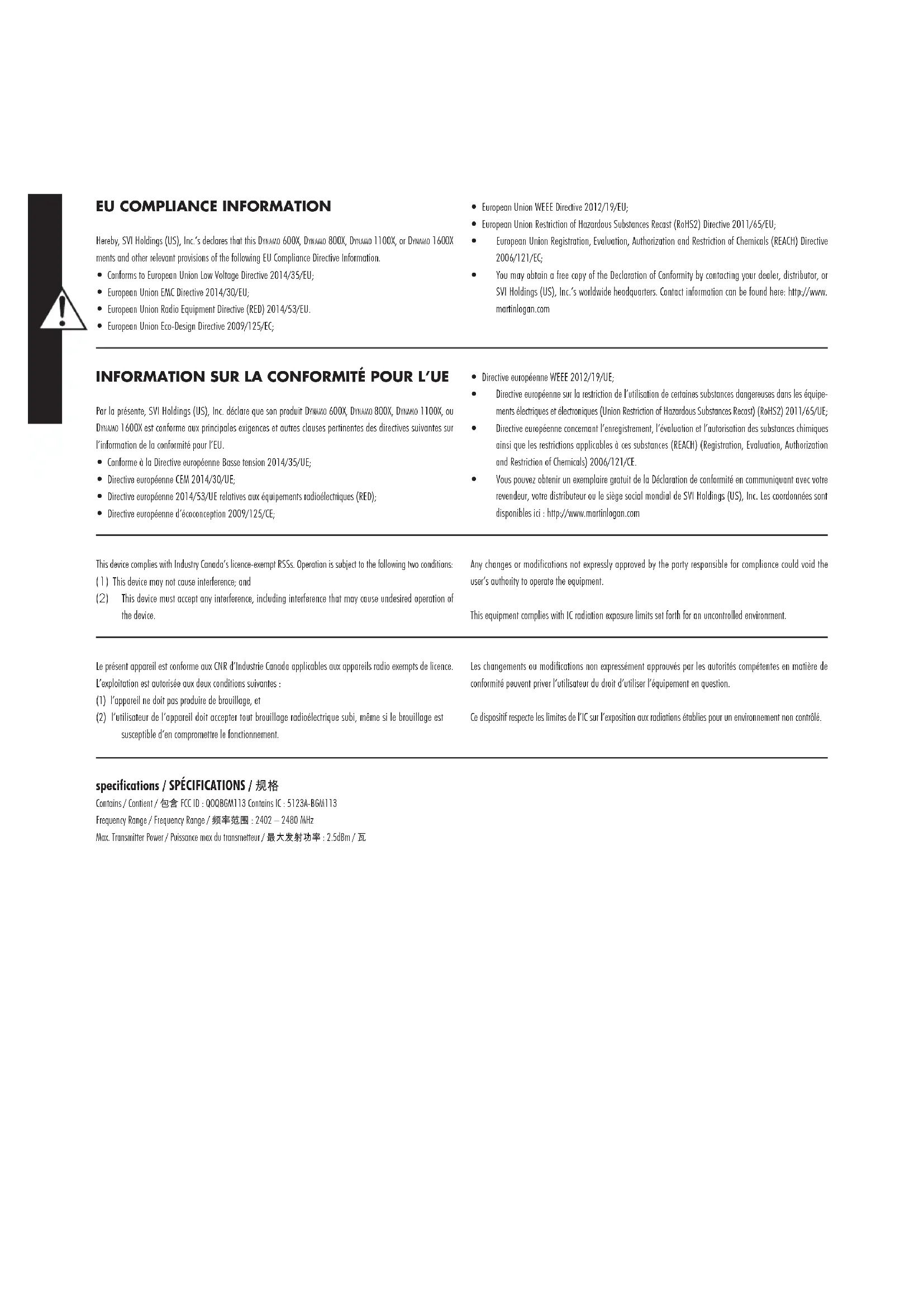 - Vous pouvez obtenir un exemplaire gratuit de la Déclaration de conformité en communiquant avec votre revendeur, votre distributeur ou le siège social mondial de SVI Holdings (US), Inc. Les coordonnées sont disponibles ici : http://www.martinlogan.com This device complies with Industry Canada’s licence-exempt RSSs. Operation is subject to the following two conditions: (1) This device may not cause interference; and (2) This device must accept any interference, including interference that may cause undesired operation of the device. Any changes or modifications not expressly approved by the party responsible for compliance could void the user’s authority to operate the equipment. This equipment complies with IC radiation exposure limits set forth for an uncontrolled environment. Le présent appareil est conforme aux CNR d’Industrie Canada applicables aux appareils radio exempts de licence. L’exploitation est autorisée aux deux conditions suivantes : (1) l’appareil ne doit pas produire de brouillage, et (2) l’utilisateur de l’appareil doit accepter tout brouillage radioélectrique subi, même si le brouillage est susceptible d’en compromettre le fonctionnement. Les changements ou modifications non expressément approuvés par les autorités compétentes en matière de conformité peuvent priver l’utilisateur du droit d’utiliser l’équipement en question. Ce dispositif respecte les limites de l’IC sur l’exposition aux radiations établies pour un environnement non contrôlé. specifications / SPÉCIFICATIONS / 规格 Contains / Contient / 包含 FCC ID : QOQBGM113 Contains IC : 5123A-BGM113 Frequency Range / Frequency Range / 频率范围 : 2402 – 2480 MHz Max. Transmitter Power / Puissance max du transmetteur / 最大发射功率 : 2.5dBm / 瓦This device complies with part 15 of the FCC Rules. Operation is subject to the following two conditions: (1) This device may not cause harmful interference, and (2) this device must accept any interference received, including interference that may cause undesired operation. Cet appareil est conforme à la partie 15 des règles du FCC. L’utilisation est assujettie aux deux conditions suivantes : (1) cet appareil ne doit pas causer d’interférence nuisible, et (2) cet appareil doit accepter l’interférence reçue, notamment l’interférence qui peut causer un mauvais fonctionnement. In accordance with the European Union WEEE (Waste Electrical and Electronic Equipment) directive effective August 13, 2005, we would like to notify you that this product may contain regulated materials which upon disposal, according to the WEEE directive, require special reuse and recycling processing. For this reason MartinLogan has arranged with our distributors in European Union member nations to collect and recycle this product at no cost to you. To find your local distributor please contact the dealer from whom you purchased this product, email info@martinlogan.com or visit the distributor locator at www.martinlogan.com. Please note, only this product itself falls under the WEEE directive. When disposing of packaging and other related shipping materials we encourage you to recycle these items through the normal channels. En vertu de la directive WEEE de l’Union européenne (direc- tive sur les déchets électriques et électroniques) entrée en vigueur le 13 août 2005, nous vous avisons que ce produit pourrait renfermer des matériaux réglementés dont l’élimination doit faire l’objet de procédures de réutilisation et de recyclage particulières. À cette fin, MartinLogan a demandé à ses distributeurs dans les pays mem- bres de l’Union européenne de reprendre et recycler ce produit gratuitement. Pour trouver le distributeur le plus près, veuillez communiquer avec le revendeur auprès de qui vous avez acheté ce produit, envoyer un courriel à info@mar- tinlogan.com ou consulter le localisateur de distributeur sur le site Web www. martinlogan.com. Veuillez noter que seul le produit est régi par la directive WEEE. Nous vous encourageons à recycler les matériaux d’emballage et autres matériaux d’expédition selon les procédures normales. Dynamo 600X, Dynamo 800X, Dynamo 1100X, Dynamo 1600X Tested to Comply with FCC Standards