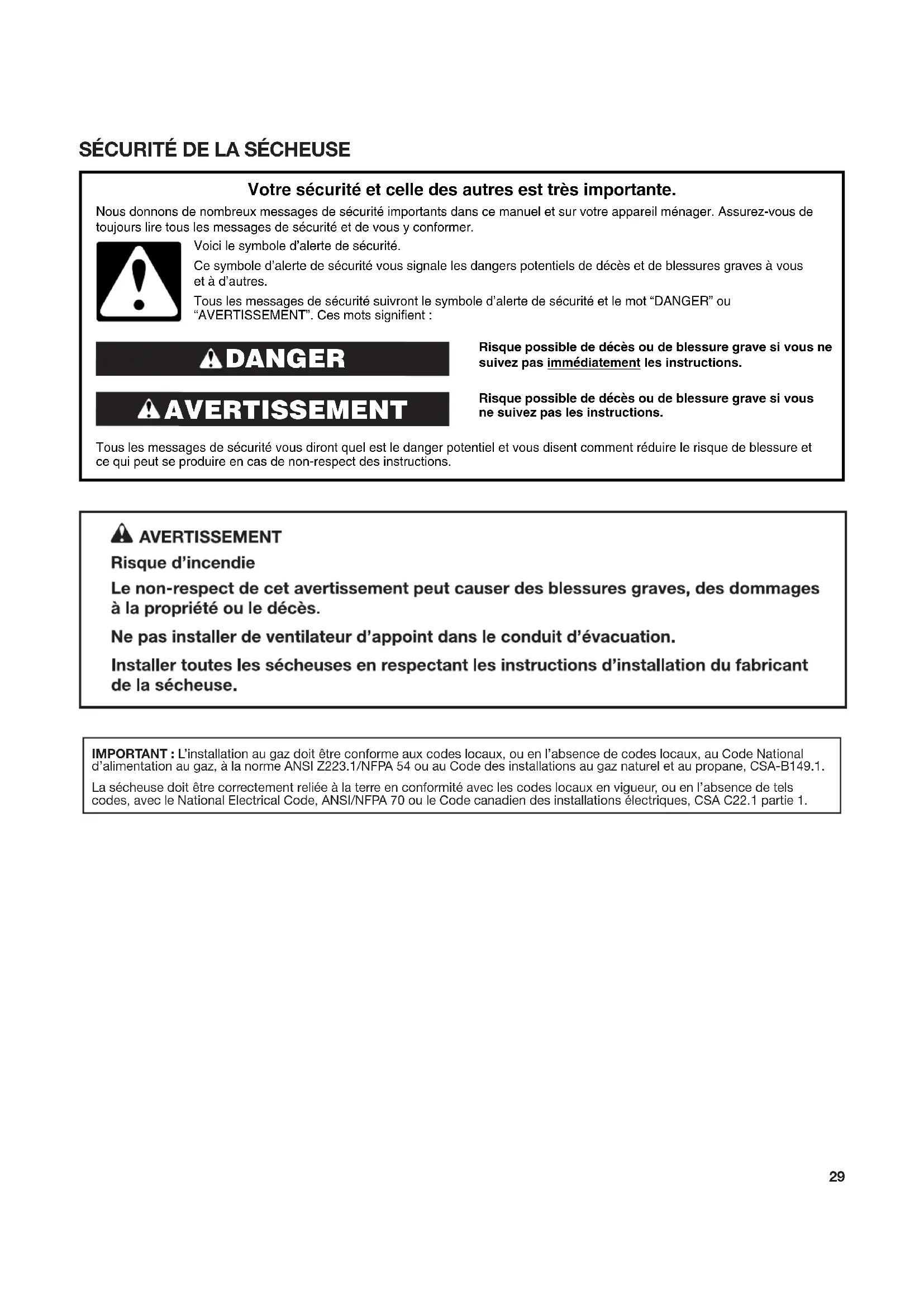IMPORTANT : L’installation au gaz doit être conforme aux codes locaux, ou en l’absence de codes locaux, au Code National d’alimentation au gaz, à la norme ANSI Z223.1/NFPA 54 ou au Code des installations au gaz naturel et au propane, CSA-B149.1. La sécheuse doit être correctement reliée à la terre en conformité avec les codes locaux en vigueur, ou en l’absence de tels codes, avec le National Electrical Code, ANSI/NFPA 70 ou le Code canadien des installations électriques, CSA C22.1 partie 1. Risque possible de décès ou de blessure grave si vous ne suivez pas immédiatement les instructions. Risque possible de décès ou de blessure grave si vous ne suivez pas les instructions. Tous les messages de sécurité vous diront quel est le danger potentiel et vous disent comment réduire le risque de blessure et ce qui peut se produire en cas de non-respect des instructions. Votre sécurité et celle des autres est très importante. Nous donnons de nombreux messages de sécurité importants dans ce manuel et sur votre appareil ménager. Assurez-vous de toujours lire tous les messages de sécurité et de vous y conformer. AVERTISSEMENT DANGER Voici le symbole d’alerte de sécurité. Ce symbole d’alerte de sécurité vous signale les dangers potentiels de décès et de blessures graves à vous et à d’autres. Tous les messages de sécurité suivront le symbole d’alerte de sécurité et le mot “DANGER” ou “AVERTISSEMENT”. Ces mots signifient :30 Dans l’État du Massachusetts, les instructions d’installation suivantes sont applicables : Les travaux d’installation et réparation doivent être exécutés par un plombier ou tuyauteur qualifié ou licencié, ou par le personnel qualifié d’une entreprise licenciée par l’État du Massachusetts. Remplacer par des dispositifs de fermeture acceptables : Les robinets de gaz et robinets à bille installés pour l'utilisation devraient être indiqués. Si un conduit de raccordement flexible est utilisé, sa longueur ne doit pas dépasser 4 pi (121,9 cm).31