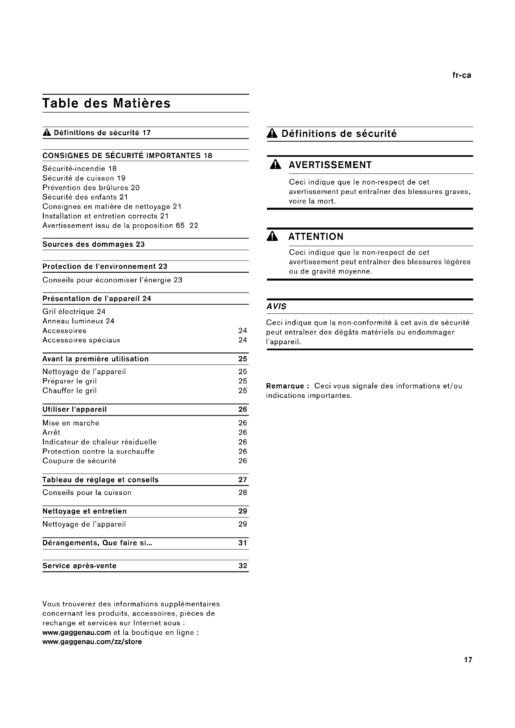 mande sur 0. Deux signaux sonores viennent confirmer la désactivation du mode démonstration. L'appareil ne chauffe pas, l'anneau lumineux s'allume en orange Sécurité anti-surchauffe L'appareil arrête automatiquement la résis- tance chauffante du gril, afin de protéger l'appareil et le meuble d'encastrement. Une fois que l'appareil a suffisamment refroidi, il remet en marche la résistance chauffante du gril. La durée de refroidissement peut aller jusqu'à 45 minutes. L'appareil s'éteint pendant le fonc- tionnement, l'anneau lumineux cli- gnote en alternance en orange et en blanc Coupure de sécurité : Aucune commande n'a été effec- tuée pendant une durée prolon- gée Tournez le bouton de commande sur 0, puis rallumez si nécessaire L'appareil reste éteint après une panne de courant Tournez le bouton de commande sur 0, puis rallumez si nécessaire32 fr-ca Service après-vente Service après-vente Service après-vente Si votre appareil doit être réparé, notre service après- vente est à votre disposition. Nous trouvons toujours une solution adaptée, y compris pour éviter les visites inutiles de techniciens. Lors de votre appel, indiquez le numéro du produit (n° E) et le numéro de série (n° FD) afin que nous puissions vous donner une réponse précise. La plaquette d'identification comportant ces numéros se trouve sur le dessous de l'appareil. Pour ne pas avoir à chercher en cas de besoin, vous pouvez inscrire ici les références de l'appareil et le numéro de téléphone du service après- vente. Veuillez lire le mode d'emploi et les directives d'entretien fournis avec l'appareil. Tout manquement à cette consigne pourrait entraîner une erreur à l'utilisation de l'appareil et des demandes de réparations inutiles, qui pourraient ne pas être sous garantie. 9 AVERTISSEMENT Risque de choc électrique ! Les réparations non-conformes sont source de danger. Les réparations doivent être faites exclusivement par un technicien après-vente formé par nos soins. Si l'appareil est défectueux, débranchez la fiche d'alimentation secteur ou désactivez le coupe-circuit concerné sur le tableau électrique. Appelez le service après-vente. Vous trouverez les données de contact pour tous les pays dans l'annuaire ci-joint du service après-vente. Demande de réparation et conseils en cas de dysfonctionnement N° E N° FD Service après-vente O CA 877 442 4436 toll-free33 es-mx Contenido Manual de instrucciones 9 Definiciones de seguridad 33INSTRUCCIONES DE SEGURIDAD IMPORTANTES 34Seguridad para evitar incendios 34Seguridad al cocinar 35Prevención de quemaduras 36Seguridad de los niños 37Seguridad en la limpieza 37Instalación y mantenimiento adecuados 37Advertencia en virtud de la Proposición 65 38Causas de daños 39Protección del medio ambiente 39Consejos para ahorrar energía 39Presentación del aparato 40Grill eléctrico 40Indicación en el anillo luminoso 40Accesorio 40Accesorios especiales 40Antes del primer uso 41Limpiar el aparato 41Preparar el grill 41Calentamiento del grill 41Manejo del electrodoméstico 42Conectar 42Apagar 42Visualización del calor restante 42Protección contra sobrecalentamiento 42Desconexión de seguridad: 42Tabla de ajustes y consejos 43Consejos para cocer y asar 43Cuidados y limpieza 44Limpiar el aparato 44¿Qué hacer en caso de avería? 46Servicio de atención al cliente 47 Encontrará más información sobre productos, accesorios, piezas de repuesto y servicios en internet: www.gaggenau.com y también en la tienda online: www.gaggenau.com/zz/store 9 Definiciones de seguridad Definiciones de seguri dad 9 ADVERTENCIA Esto indica que pueden producirse heridas graves o incluso la muerte si no se cumple con esta advertencia. 9 ATENCION Esto indica que pueden producirse heridas leves o moderadas si no se cumple con esta advertencia.AVISOEsto indica que pueden producirse daños en el aparato o en los bienes si no se cumple con este aviso.Nota: Esto alerta sobre información o sugerencias importantes.9 INSTRUCCIONES DE SEGURIDAD IMPORTANTES