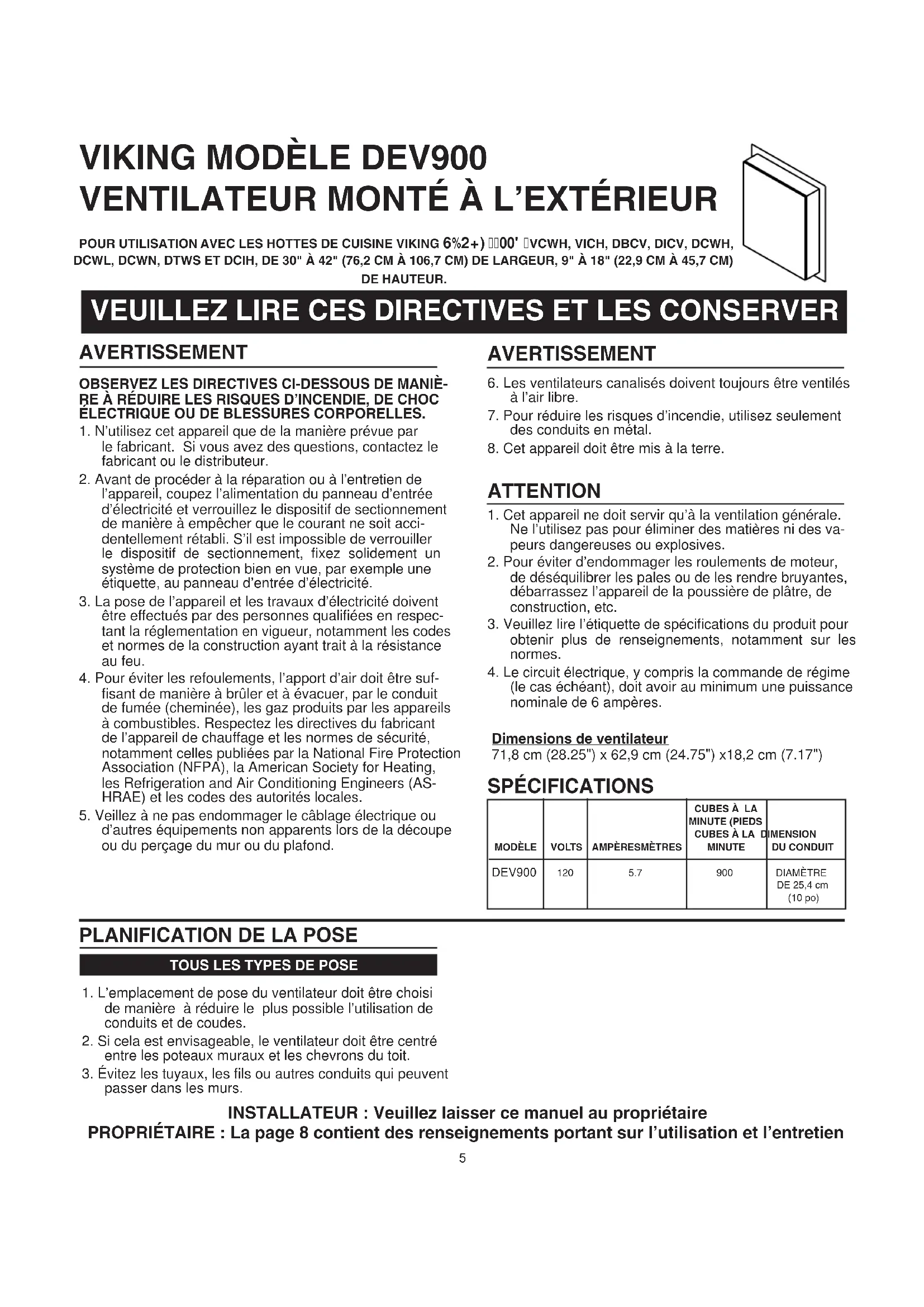 1. L’emplacement de pose du ventilateur doit être choiside manière à réduire le plus possible l’utilisation deconduits et de coudes.2. Si cela est envisageable, le ventilateur doit être centréentre les poteaux muraux et les chevrons du toit.3. Évitez les tuyaux, les fils ou autres conduits qui peuventpasser dans les murs.TOUS LES TYPES DE POSE SPÉCIFICATIONS INSTALLATEUR : Veuillez laisser ce manuel au propriétaire PROPRIÉTAIRE : La page 8 contient des renseignements portant sur l’utilisation et l’entretien 6. Les ventilateurs canalisés doivent toujours être ventilésà l’air libre.7. Pour réduire les risques d’incendie, utilisez seulementdes conduits en métal.8. Cet appareil doit être mis à la terre. VEUILLEZ LIRE CES DIRECTIVES ET LES CONSERVER