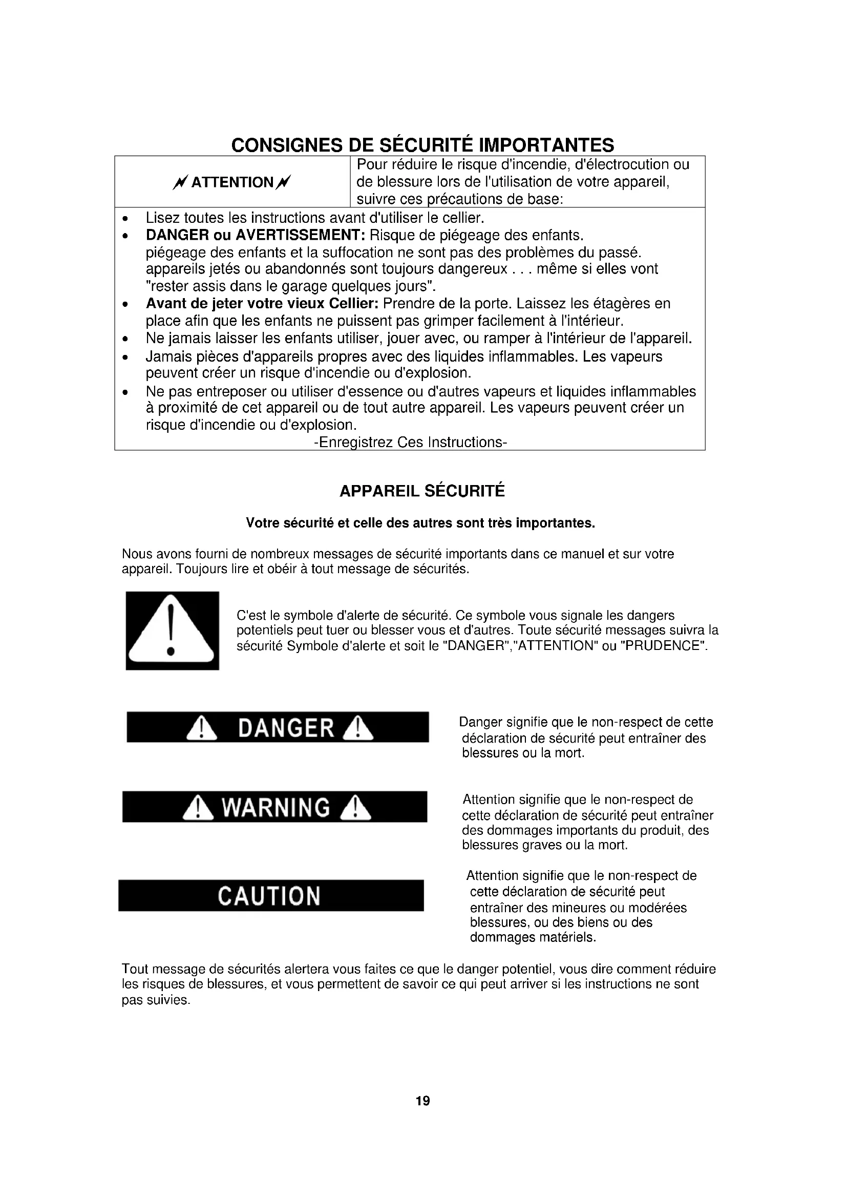 - DANGER ou AVERTISSEMENT: Risque de piégeage des enfants. piégeage des enfants et la suffocation ne sont pas des problèmes du passé. appareils jetés ou abandonnés sont toujours dangereux . . . même si elles vont "rester assis dans le garage quelques jours".