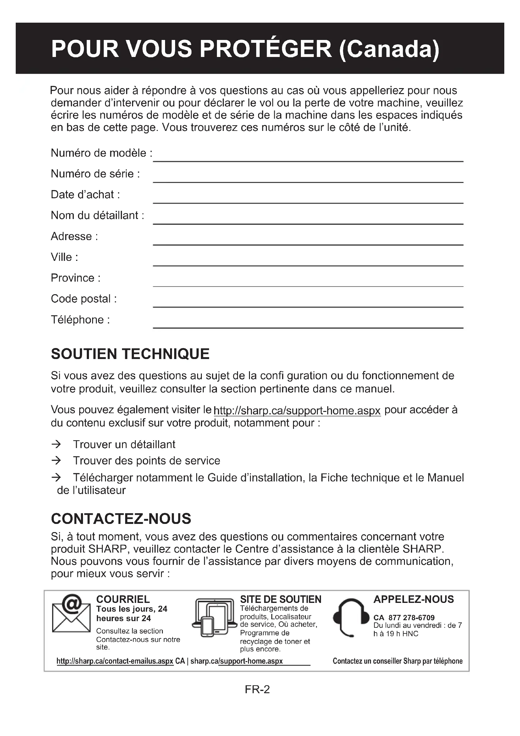 Téléchargements de produits, Localisateur de service, Où acheter, Programme de recyclage de toner et plus encore. Pour nous aider à répondre à vos questions au cas où vous appelleriez pour nous demander d’intervenir ou pour déclarer le vol ou la perte de votre machine, veuillez écrire les numéros de modèle et de série de la machine dans les espaces indiqués en bas de cette page. Vous trouverez ces numéros sur le côté de l’unité. http://sharp.ca/support-home.aspx http://sharp.ca/contact-emailus.aspx CA | sharp.ca/support-home.aspxOM_FP-K50U_FR.indd 2 2019/09/05 10:13:53FR-3 FRANÇAIS GARANTIE LIMITÉE (Canada) FRANÇAIS FR-3 FRANÇAIS