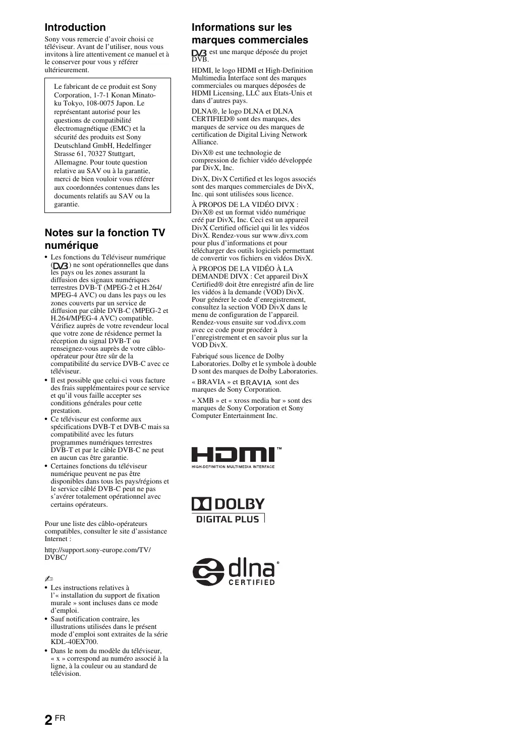 Sony offre une garantie de 2 ans minimum pour ce téléviseur LCD et 7 ans de disponibilité pour le remplacement de pièces électroniques. Introduction Sony vous remercie d’avoir choisi ce téléviseur. Avant de l’utiliser, nous vous invitons à lire attentivement ce manuel et à le conserver pour vous y référer ultérieurement. Le fabricant de ce produit est Sony Corporation, 1-7-1 Konan Minatoku Tokyo, 108-0075 Japon. Le représentant autorisé pour les questions de compatibilité électromagnétique (EMC) et la sécurité des produits est Sony Deutschland GmbH, Hedelfinger Strasse 61, 70327 Stuttgart, Allemagne. Pour toute question relative au SAV ou à la garantie, merci de bien vouloir vous référer aux coordonnées contenues dans les documents relatifs au SAV ou la garantie. Notes sur la fonction TV numérique