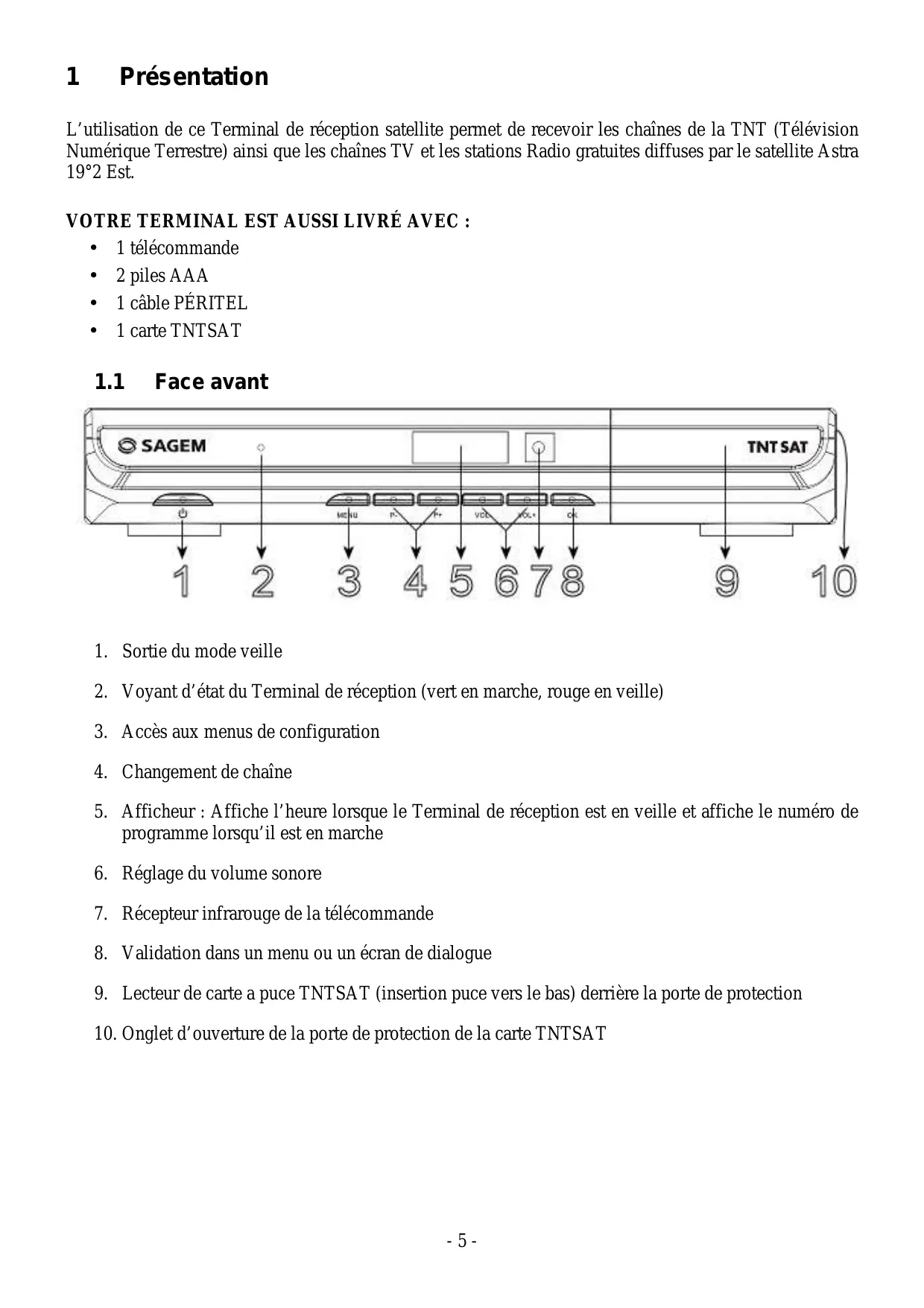 Ce pack satellite de réception pour le service TNTSAT de Sagem Communications SAS (dénommé ci-après Sagem Communications), dédiée à la réception des chaînes de TNT disponibles par satellite avec TNTSAT, permet de receivevoir les émissions en définition standard.