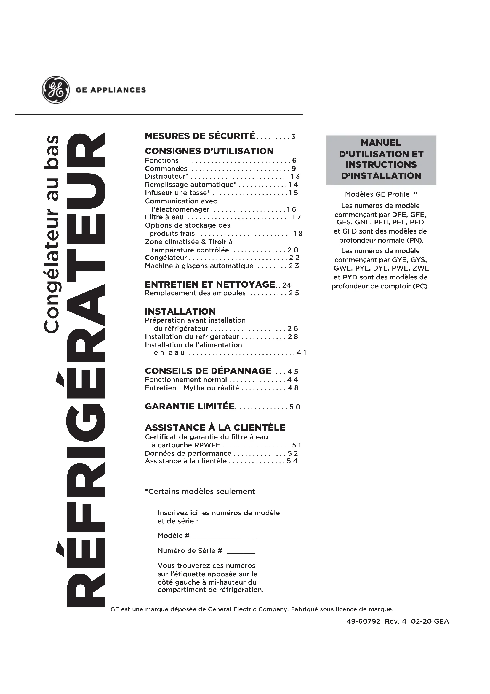 your phone number, or write to: ,QWKH86*HQHUDO0DQDJHU&XVWRPHU5HODWLRQV_*($SSOLDQFHV$SSOLDQFH3DUN_/RXLVYLOOH.< GEAppliances.com/contact ,Q&DQDGD'LUHFWRU&RQVXPHU5HODWLRQV0DEH&DQDGD,QF_6XLWH)DFWRU\/DQH_0RQFWRQ1%(&0 GEAppliances.ca/en/contact-us49-60792 Rev. 4 02-20 GEA *Certains modèles seulement Inscrivez ici les numéros de modèle et de série : Modèle # ________________ Numéro de Série # _______ Vous trouverez ces numéros sur l’étiquette apposée sur le côté gauche à mi-hauteur du compartiment de réfrigération. MANUEL