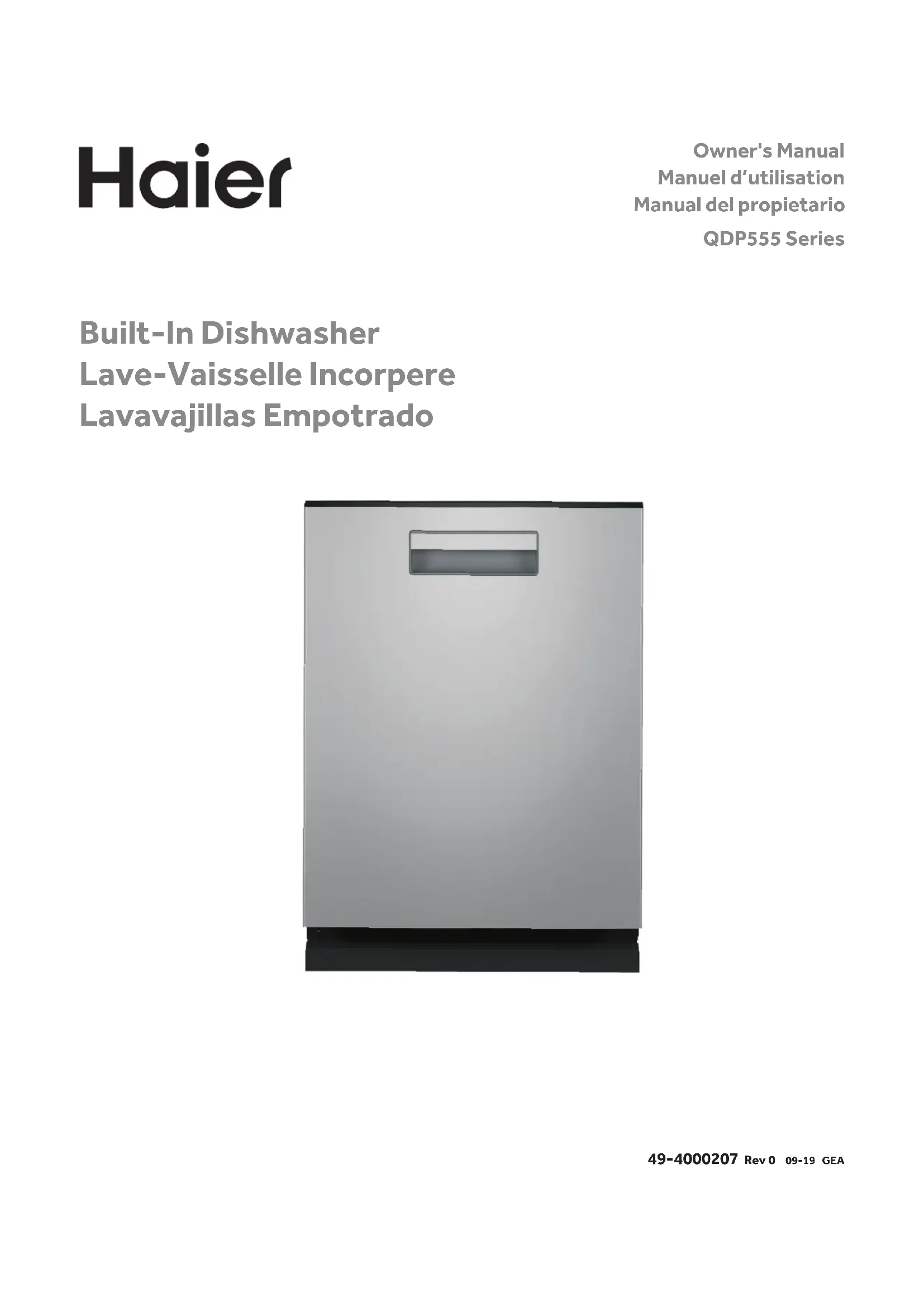 Imprimé aux Etats-Unis Site Web de Haier Appliances Vous avez une question ou vous avez besoin d’aide pour votre appareil électroménager? Visitez le site Web de Haier Appliances 24 heures par jour, tous les jours de l’année! Vous pouvez aussi y trouver d’autres formidables produits Haier Appliances et tirer avantage de tous nos services d’assistance en ligne. fr.haiercanada.ca Enregistrez votre électroménager Enregistrez votre nouvel appareil en ligne au moment qui vous convient le mieux! L’enregistrement de votre produit dans les délais prescrits permet une meilleure communication et un service rapide, selon les modalités de votre garantie, si besoin est. Vous pouvez également envoyer par courrier la carte d’enregistrement pré-imprimée qui se trouve dans l’emballage de votre appareil. Au Canada : prodsupport.mabe.ca/crm/Products/ProductRegistration.aspx Service de réparation Un service de réparation expert Haier Appliances se trouve à quelques pas de chez vous. Rendez-vous sur notre site et programmez, à votre convenance, une visite de réparation à n’importe quel jour de l’année. Au Canada : fr.haiercanada.ca/service Pièces et accessoires Les personnes ayant les compétences requises pour réparer elles-mêmes leurs appareils peuvent recevoir directement à la maison des pièces ou accessoires (les cartes VISA, MasterCard et Discover sont acceptées). Les instructions contenues dans le présent manuel comportent des procédures que tout utilisateur peut effectuer. Les autres types de réparation doivent généralement être confiés à un technicien qualifié. Usez de prudence : une réparation ou un entretien mal effectués peuvent rendre l’utilisation de l’appareil dangereuse. Les consommateurs au Canada doivent visitez notre site web à fr.haiercanada.ca/parts. Communiquez avec nous Si vous n’êtes pas satisfait du service de Haier Appliances, visitez notre site web à fr.haiercanada.ca/contact-us : Au Canada : Director, Consumer Relations, Mabe Canada Inc. | Suite 310, 1 Factory Lane | Moncton, N.B. E1C 9M3Manual del propietario QDP555 Serie Lavavajillas Empotrado 49-4000207 Rev 0 09-19 GEA2 49-4000207 Rev 0 ESPAÑOL