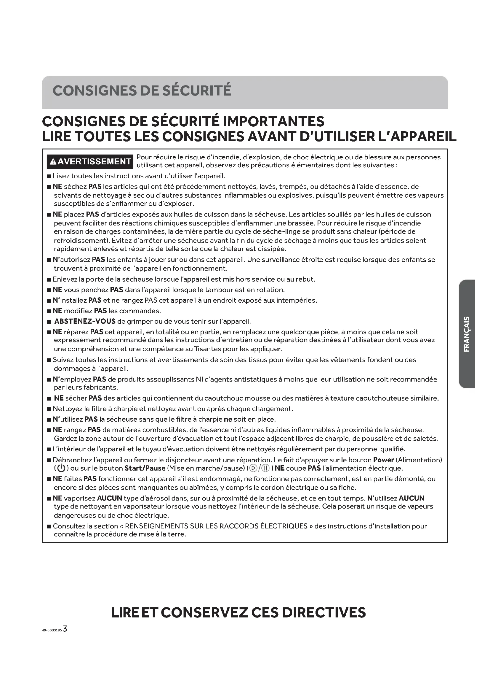 POUR ÉVITER LES CHOCS ÉLECTRIQUES, DÉBRANCHEZ L’ALIMENTATION ÉLECTRIQUE AVANT L’ENTRETIEN.Cette sécheuse doit être connectée à un circuit de dérivation individuel avec un fil de cuivre de calibre 10 minimum à travers un fusible de 30 ampères ou un disjoncteur. PA S de fusible sur le fil neutre. Utilisez uniquement des conducteurs en cuivre. AVERTISSEMENT - Risque d’électrocution POUR ÉVITER LES CHOCS ÉLECTRIQUES, DÉBRANCHEZ L’ALIMENTATION ÉLECTRIQUE AVANT L’ENTRETIEN.Cette sécheuse doit être connectée à un circuit de dérivation individuel avec un fil de cuivre de calibre 10 minimum à travers un fusible de 30 ampères ou un disjoncteur. PAS de fusible sur le fil neutre.Utilisez uniquement des conducteurs en cuivre. AVERTISSEMENT - Risque d’électrocution49-3000195 17 FRANÇAIS