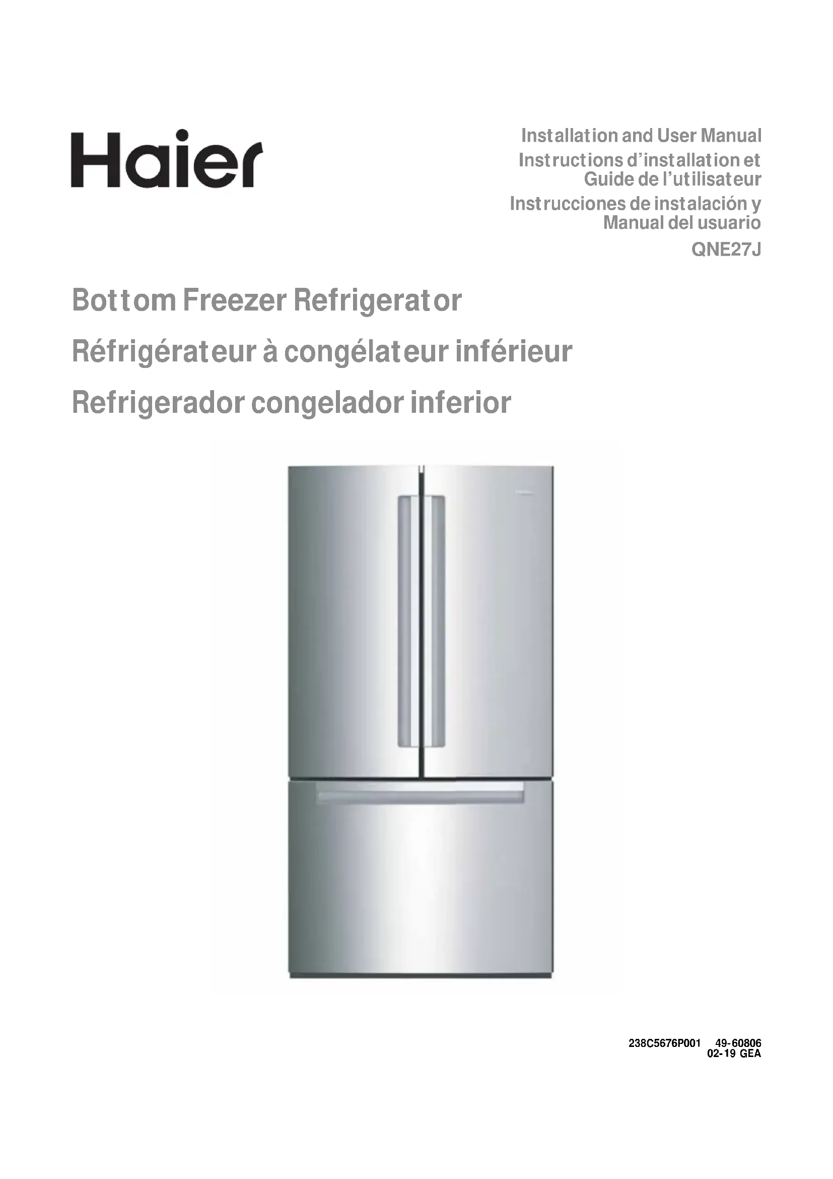 Installation and User Manual Instructions d’installation et Guide de l’utilisateur Instrucciones de instalación y Manual del usuario QNE27J Bottom Freezer Refrigerator Réfrigérateur à congélateur inférieur Refrigerador congelador inferior 238C5676P001 49-60806