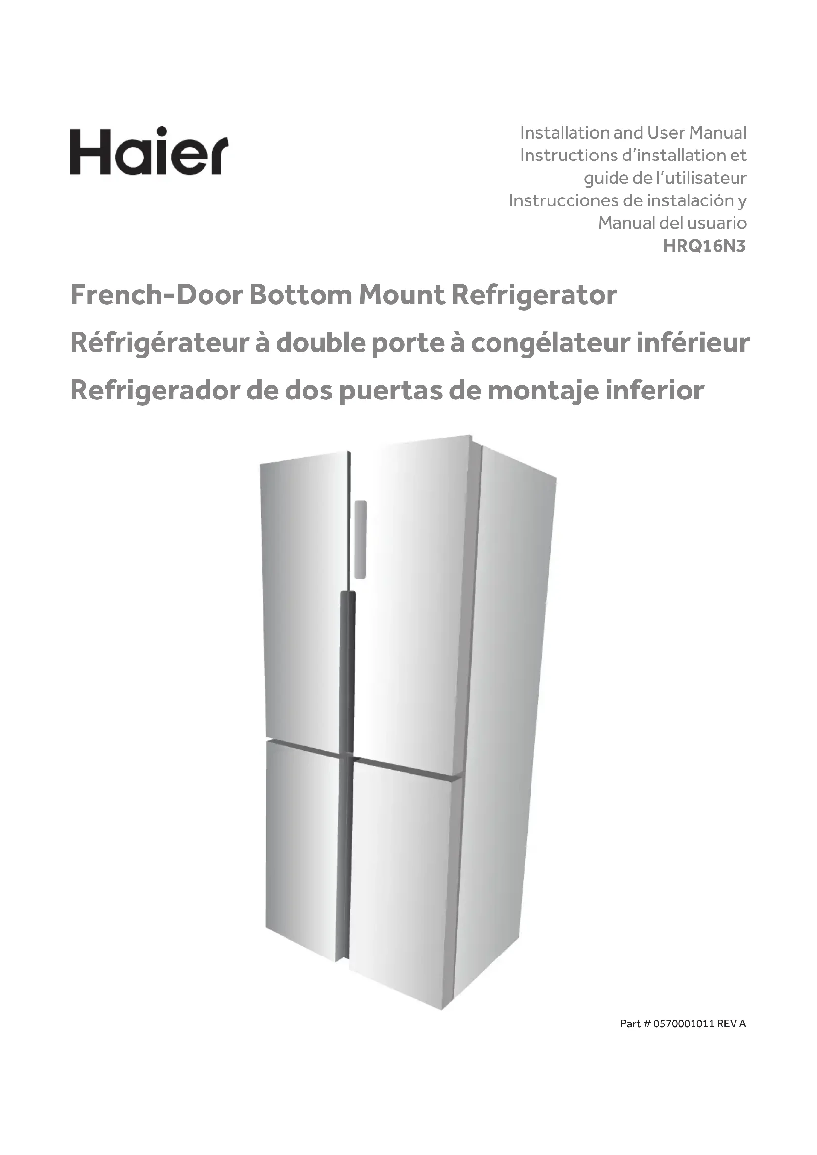 French-Door Bottom Mount Refrigerator Réfrigérateur à double porte à congélateur inférieur Refrigerador de dos puertas de montaje inferior Installation and User Manual Instructions d’installation et guide de l’utilisateur Instrucciones de instalación y Manual del usuario HRQ16N3 Part # 0570001011 REV A1