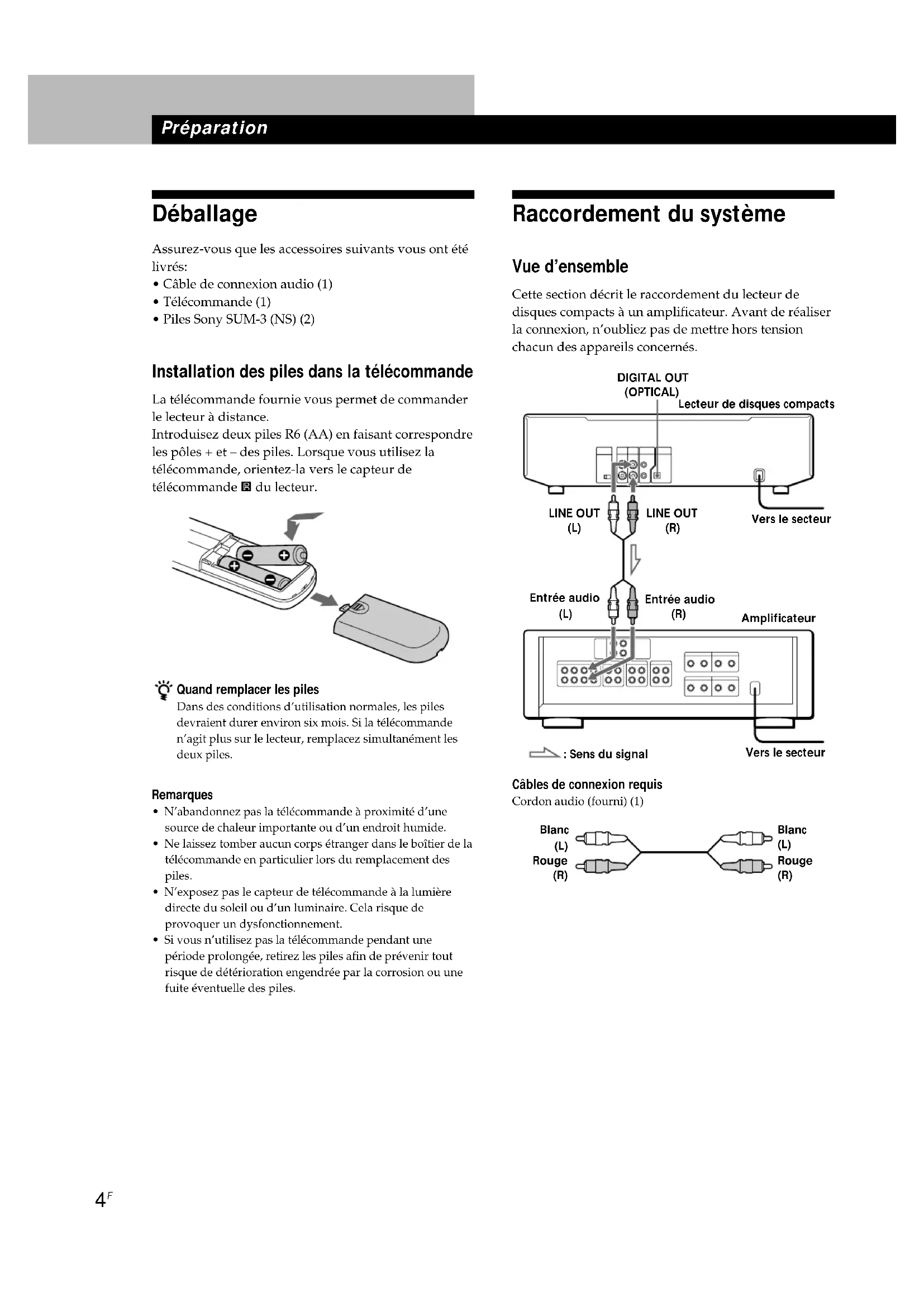 - Si vous n’utilisez pas la télécommande pendant une période prolongée, retirez les piles afin de prévenir tout risque de détérioration engendrée par la corrosion ou une fuite éventuelle des piles. Entrée audio (R) Amplificateur Vers le secteur LINE OUT (L) Vers le secteur Préparation Entrée audio (L) : Sens du signal Câbles de connexion requis Cordon audio (fourni) (1) Blanc (L) Rouge (R) Rouge (R) Blanc (L) Raccordement du système Vue d’ensemble Cette section décrit le raccordement du lecteur de disques compacts à un amplificateur. Avant de réaliser la connexion, n’oubliez pas de mettre hors tension chacun des appareils concernés. LINE OUT (R) DIGITAL OUT (OPTICAL)Préparation