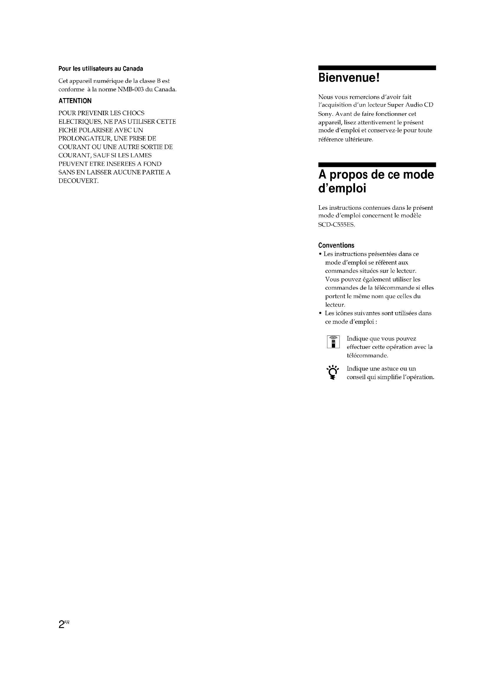Bienvenue! Nous vous remercions d’avoir fait l’acquisition d’un lecteur Super Audio CD Sony. Avant de faire fonctionner cet appareil, lisez attentivement le présent mode d’emploi et conservez-le pour toute référence ultérieure. A propos de ce mode d’emploi Les instructions contenues dans le présent mode d’emploi concernent le modèle SCD-C555ES. Conventions