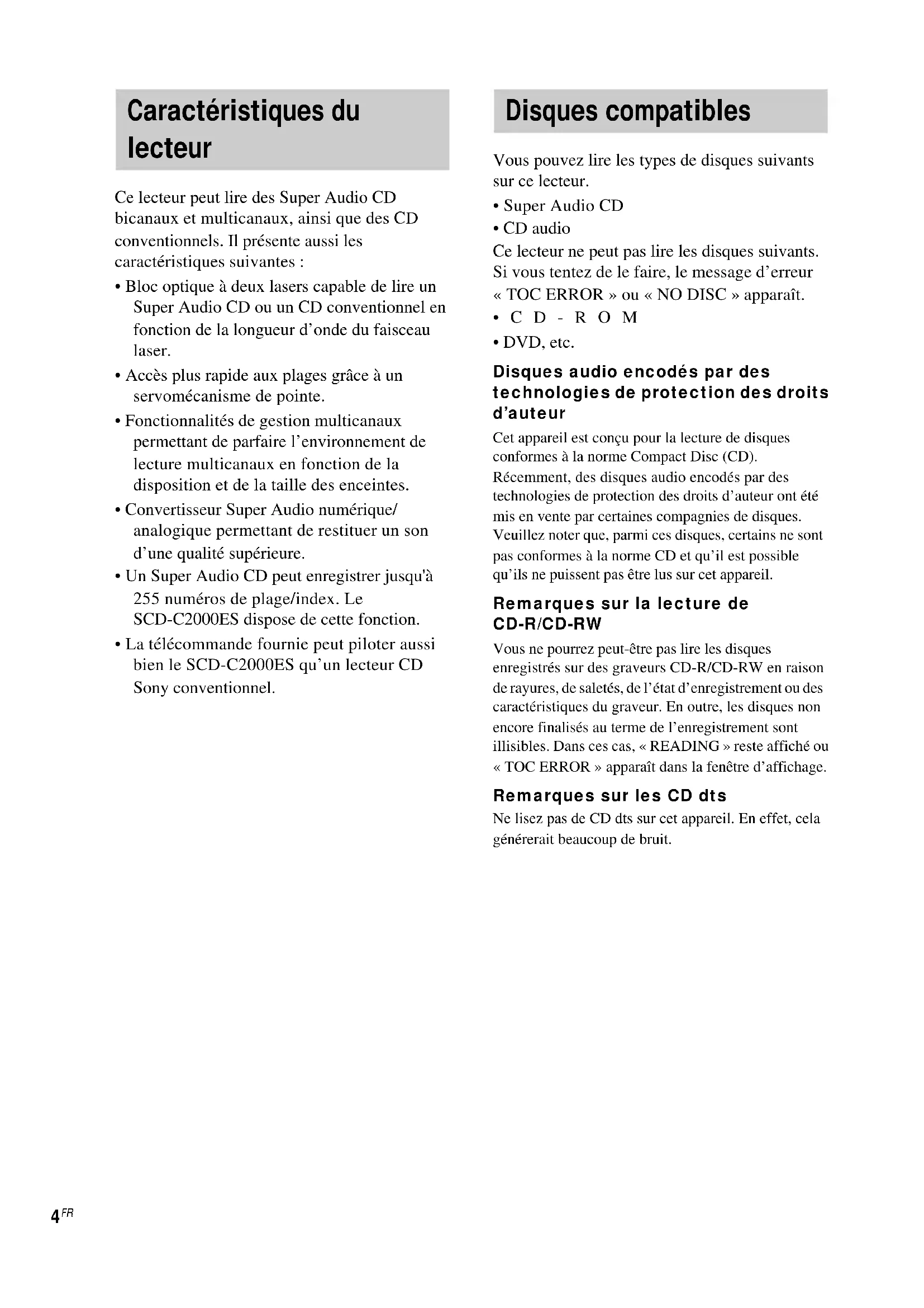 - DVD, etc. Disques audio encodés par des technologies de protection des droits d’auteur Cet appareil est conçu pour la lecture de disques conformes à la norme Compact Disc (CD). Récemment, des disques audio encodés par des technologies de protection des droits d’auteur ont été mis en vente par certaines compagnies de disques. Veuillez noter que, parmi ces disques, certains ne sont pas conformes à la norme CD et qu’il est possible qu’ils ne puissent pas être lus sur cet appareil. Remarques sur la lecture de CD-R/CD-RW Vous ne pourrez peut-être pas lire les disques enregistrés sur des graveurs CD-R/CD-RW en raison de rayures, de saletés, de l’état d’enregistrement ou des caractéristiques du graveur. En outre, les disques non encore finalisés au terme de l’enregistrement sont illisibles. Dans ces cas, « READING » reste affiché ou « TOC ERROR » apparaît dans la fenêtre d’affichage. Remarques sur les CD dts Ne lisez pas de CD dts sur cet appareil. En effet, cela générerait beaucoup de bruit. Caractéristiques du lecteur Disques compatibles5