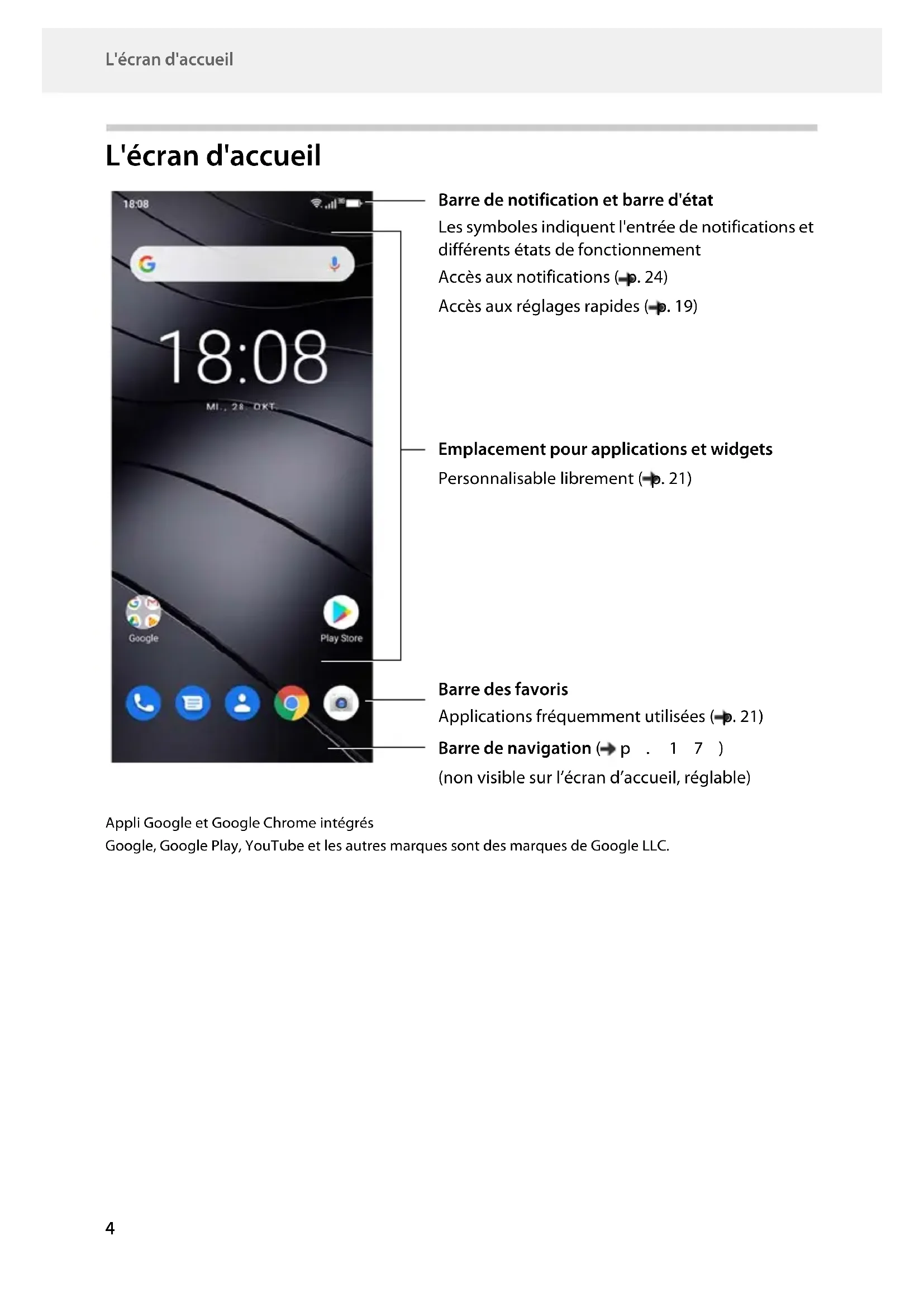 L'écran d'accueil Appli Google et Google Chrome intégrés Google, Google Play, YouTube et les autres marques sont des marques de Google LLC. Barre de notification et barre d'état Les symboles indiquent l'entrée de notifications et différents états de fonctionnement Accès aux notifications ( p. 24) Accès aux réglages rapides ( p. 19) Barre de navigation ( p. 17) (non visible sur l’écran d’accueil, réglable) Barre des favoris Applications fréquemment utilisées ( p. 21) Emplacement pour applications et widgets Personnalisable librement ( p. 21)Gigaset GX290 / LUG FR fr / A31008-XXXXX-XXXX-X-XXXX / user_guide_operating_steps.fm / 1/5/21 Template Module, Version 2.1, 11.08.2020 / Template Basiseinstellungen: Version 3.1 - 07.07.2020 Présentation dans le manuel d'utilisation