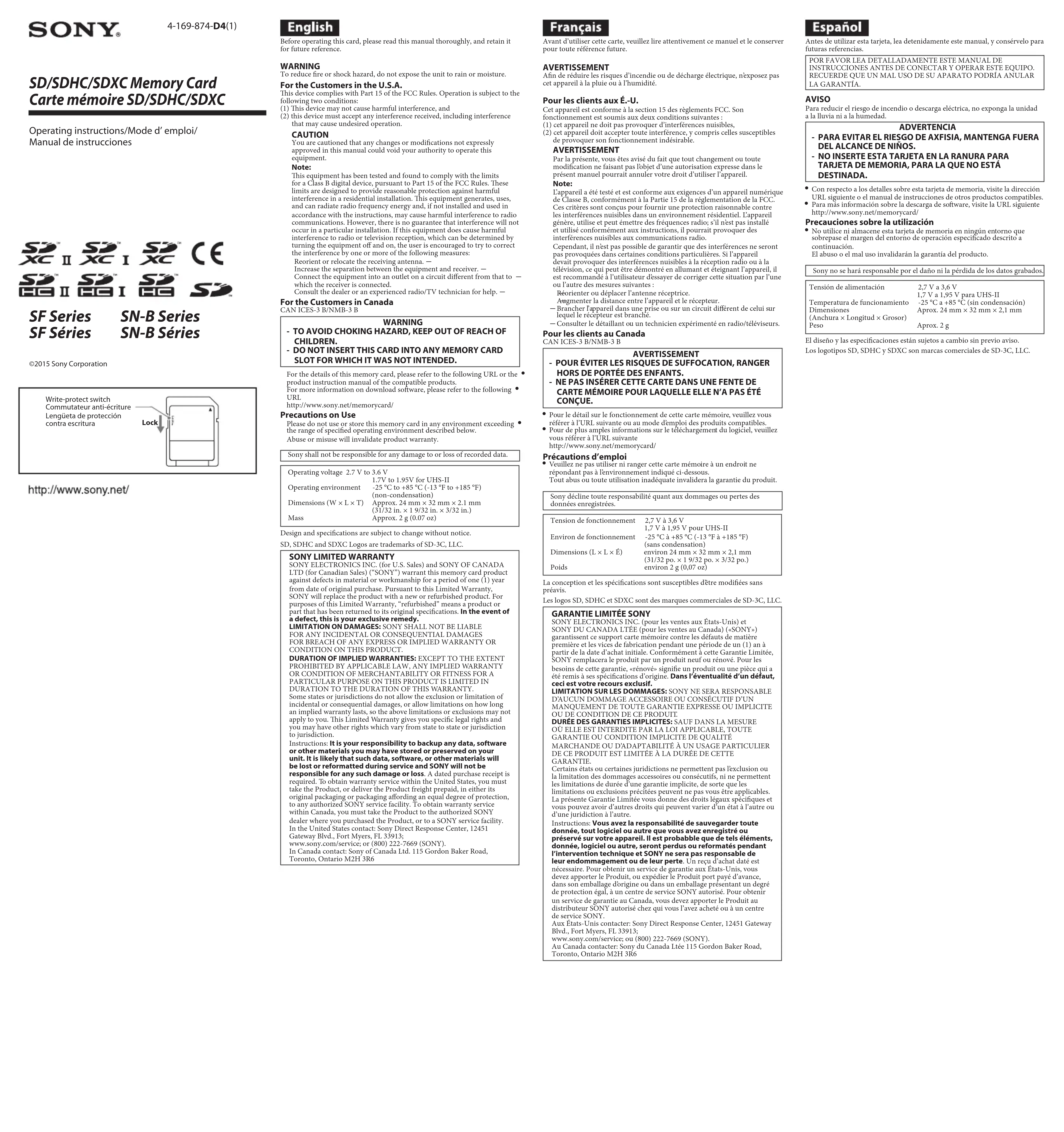 FOR BREACH OF ANY EXPRESS OR IMPLIED WARRANTY OR CONDITION ON THIS PRODUCT. DURATION OF IMPLIED WARRANTIES: EXCEPT TO THE EXTENT PROHIBITED BY APPLICABLE LAW, ANY IMPLIED WARRANTY OR CONDITION OF MERCHANTABILITY OR FITNESS FOR A PARTICULAR PURPOSE ON THIS PRODUCT IS LIMITED IN DURATION TO THE DURATION OF THIS WARRANTY. Some states or jurisdictions do not allow the exclusion or limitation of incidental or consequential damages, or allow limitations on how long an implied warranty lasts, so the above limitations or exclusions may not apply to you. is Limited Warranty gives you specic legal rights and you may have other rights which vary from state to state or jurisdiction to jurisdiction. Instructions: It is your responsibility to backup any data, software or other materials you may have stored or preserved on your unit. It is likely that such data, software, or other materials will be lost or reformatted during service and SONY will not be responsible for any such damage or loss. A dated purchase receipt is required. To obtain warranty service within the United States, you must take the Product, or deliver the Product freight prepaid, in either its original packaging or packaging aording an equal degree of protection, to any authorized SONY service facility. To obtain warranty service within Canada, you must take the Product to the authorized SONY dealer where you purchased the Product, or to a SONY service facility. In the United States contact: Sony Direct Response Center, 12451 Gateway Blvd., Fort Myers, FL 33913; www.sony.com/service; or (800) 222-7669 (SONY). In Canada contact: Sony of Canada Ltd. 115 Gordon Baker Road, Toronto, Ontario M2H 3R6 SF Series SN-B Series SF Séries SN-B Séries 4-169-874-D4(1) ©2015 Sony Corporation SD/SDHC/SDXC Memory Card Carte mémoire SD/SDHC/SDXC Avant d’utiliser cette carte, veuillez lire attentivement ce manuel et le conserver pour toute référence future. AVERTISSEMENT An de réduire les risques d’incendie ou de décharge électrique, n’exposez pas cet appareil à la pluie ou à l’humidité. Pour les clients aux É.-U. Cet appareil est conforme à la section 15 des règlements FCC. Son fonctionnement est soumis aux deux conditions suivantes : (1) cet appareil ne doit pas provoquer d’interférences nuisibles, (2) cet appareil doit accepter toute interférence, y compris celles susceptibles de provoquer son fonctionnement indésirable. AVERTISSEMENT Par la présente, vous êtes avisé du fait que tout changement ou toute modication ne faisant pas l’objet d’une autorisation expresse dans le présent manuel pourrait annuler votre droit d’utiliser l’appareil. Note: L’appareil a été testé et est conforme aux exigences d’un appareil numérique de Classe B, conformément à la Partie 15 de la réglementation de la FCC. Ces critères sont conçus pour fournir une protection raisonnable contre les interférences nuisibles dans un environnement résidentiel. L’appareil génère, utilise et peut émettre des fréquences radio; s’il n’est pas installé et utilisé conformément aux instructions, il pourrait provoquer des interférences nuisibles aux communications radio. Cependant, il n’est pas possible de garantir que des interférences ne seront pas provoquées dans certaines conditions particulières. Si l’appareil devait provoquer des interférences nuisibles à la réception radio ou à la télévision, ce qui peut être démontré en allumant et éteignant l’appareil, il est recommandé à l’utilisateur d’essayer de corriger cette situation par l’une ou l’autre des mesures suivantes : Réorienter ou déplacer l’antenne réceptrice. ˋ Augmenter la distance entre l’appareil et le récepteur. ˋ Brancher l’appareil dans une prise ou sur un circuit diérent de celui sur ˋ lequel le récepteur est branché. Consulter le détaillant ou un technicien expérimenté en radio/téléviseurs. ˋ Pour les clients au Canada