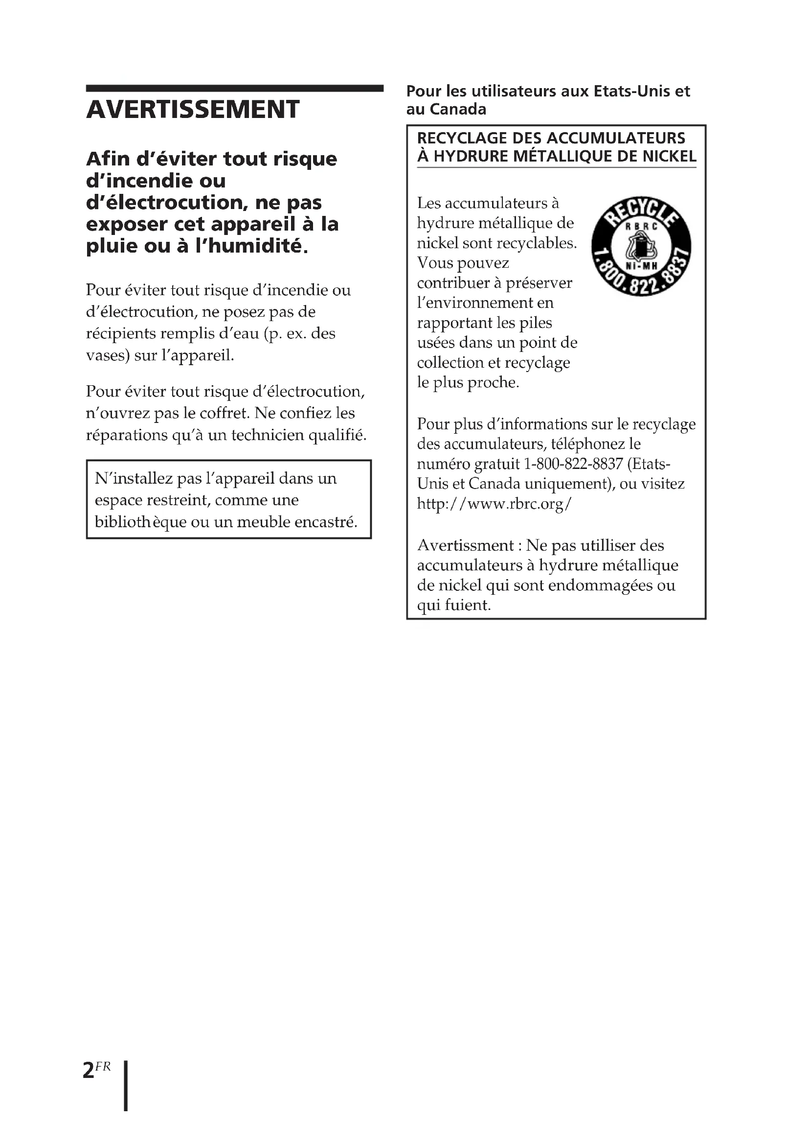 Les accumulateurs à hydrure métallique de nickel sont recyclables. Vous pouvez contribuer à préserver l’environnement en rapportant les piles usées dans un point de collection et recyclage le plus proche. Pour plus d’informations sur le recyclage des accumulateurs, téléphonez le numéro gratuit 1-800-822-8837 (Etats- Unis et Canada uniquement), ou visitez http://www.rbrc.org/ Avertissment : Ne pas utilliser des accumulateurs à hydrure métallique de nickel qui sont endommagées ou qui fuient. AVERTISSEMENT Afin d’éviter tout risque d’incendie ou d’électrocution, ne pas exposer cet appareil à la pluie ou à l’humidité