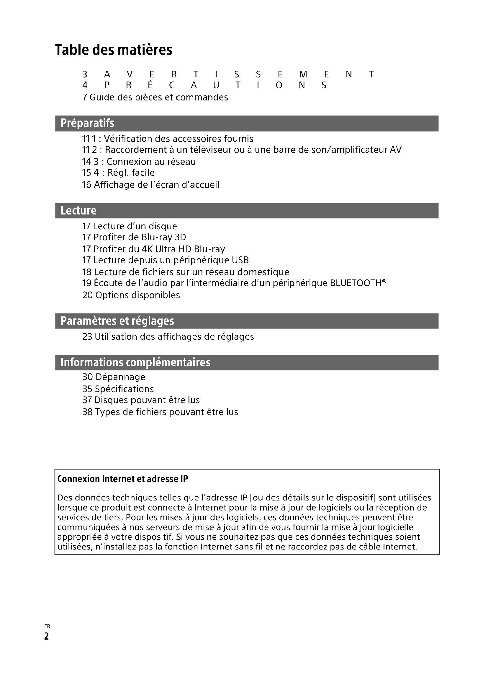 Table des matières 3AVERTISSEMENT 4PRÉCAUTIONS 7 Guide des pièces et commandes Préparatifs 11 1 : Vérification des accessoires fournis 11 2 : Raccordement à un téléviseur ou à une barre de son/amplificateur AV 14 3 : Connexion au réseau 15 4 : Régl. facile 16 Affichage de l’écran d’accueil Lecture 17 Lecture d’un disque 17 Profiter de Blu-ray 3D 17 Profiter du 4K Ultra HD Bluray 17 Lecture depuis un périphérique USB 18 Lecture de fichiers sur un réseau domestique 19 Écoute de l’audio par l’intermédiaire d’un périphérique BLUETOOTH® 20 Options disponibles Paramètres et réglages 23 Utilisation des affichages de réglages Informations complémentaires 30 Dépannage 35 Spécifications 37 Disques pouvant être lus 38 Types de fichiers pouvant être lus Connexion Internet et adresse IP Des données techniques telles que l’adresse IP [ou des détails sur le dispositif] sont utilisées lorsque ce produit est connecté à Internet pour la mise à jour de logiciels ou la réception de services de tiers. Pour les mises à jour des logiciels, ces données techniques peuvent être communiquées à nos serveurs de mise à jour afin de vous fournir la mise à jour logicielle appropriée à votre dispositif. Si vous ne souhaitez pas que ces données techniques soient utilisées, n’installez pas la fonction Internet sans fil et ne raccordez pas de câble Internet.3