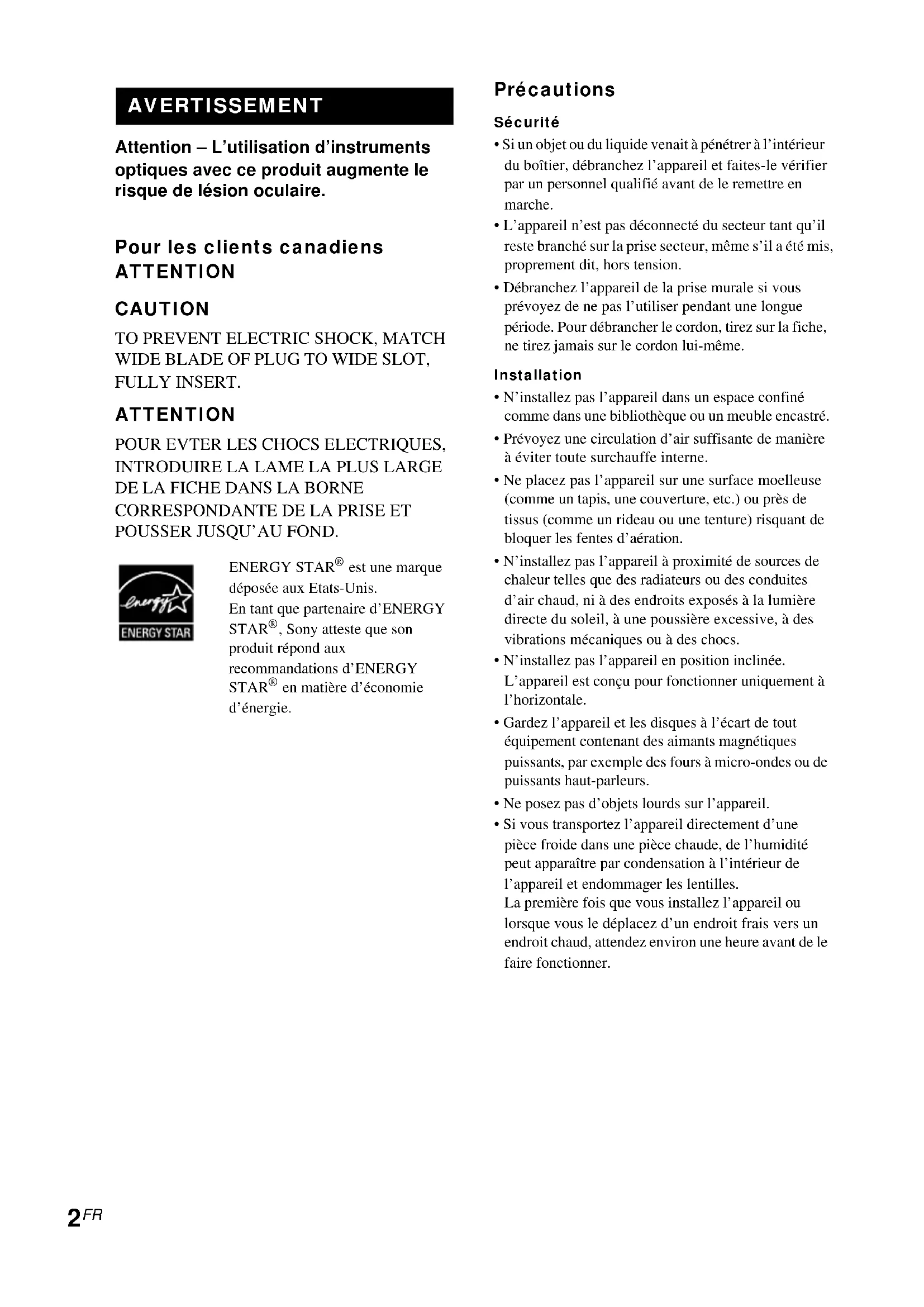 - Par souci d’économie d’énergie, le système peut être mis complètement hors tension à l’aide de l’interrupteur POWER de l’appareil principal. Bien que le voyant reste allumé pendant quelques temps, le système est complètement hors tension. Réglage du volume N’augmentez pas le volume lorsque vous écoutez un passage avec de très faibles niveaux d’entrée ou sans signal audio. Vous risqueriez d’endommager les enceintes au moment du passage caractérisé par un niveau sonore de crête. Entretien Nettoyez le boîtier, le panneau et les commandes avec un chiffon doux légèrement imprégné d’une solution détergente neutre. N’utilisez pas de tampons abrasifs, de poudre à récurer ou de solvant tel que l’alcool ou la benzine. Pour toute question ou tout problème concernant votre ampli-tuner, n’hésitez pas à consulter votre revendeur Sony le plus proche. Entretien des disques N’utilisez pas les disques de nettoyage CD/DVD disponibles dans le commerce. Ils risquent d’endommager votre ampli-tuner. Couleurs de votre écran de téléviseur Si les enceintes entraînent des irrégularités de couleur sur votre écran de téléviseur, mettez ce dernier hors tension, puis remettez-le sous tension 15 à 30 minutes après. Si les irrégularités de couleurs persistent, éloignez les enceintes du téléviseur. L’étiquette est située à l’arrière de l’appareil. Transport de l’ampli-tuner Lorsque vous transportez l’ampli-tuner, appliquez la procédure ci-dessous afin de protéger le mécanisme interne. Retirez le disque. « NO DISC » s’affiche dans la fenêtre d’affichage du panneau frontal. Mettez l’ampli- tuner hors tension et débranchez son cordon d’alimentation de la prise secteur. Félicitations ! Précautions IMPORTANT Attention : Cette ampli-tuner est capable de maintenir indéfiniment l’affichage d’une image vidéo fixe ou d’un menu sur l’écran de votre téléviseur. En laissant une image vidéo fixe ou un menu affiché sur votre téléviseur pendant une période prolongée, vous risquez de provoquer des dommages irréversibles au niveau de votre écran. Les téléviseurs de projection sont particulièrement sensibles à ce phénomène.4