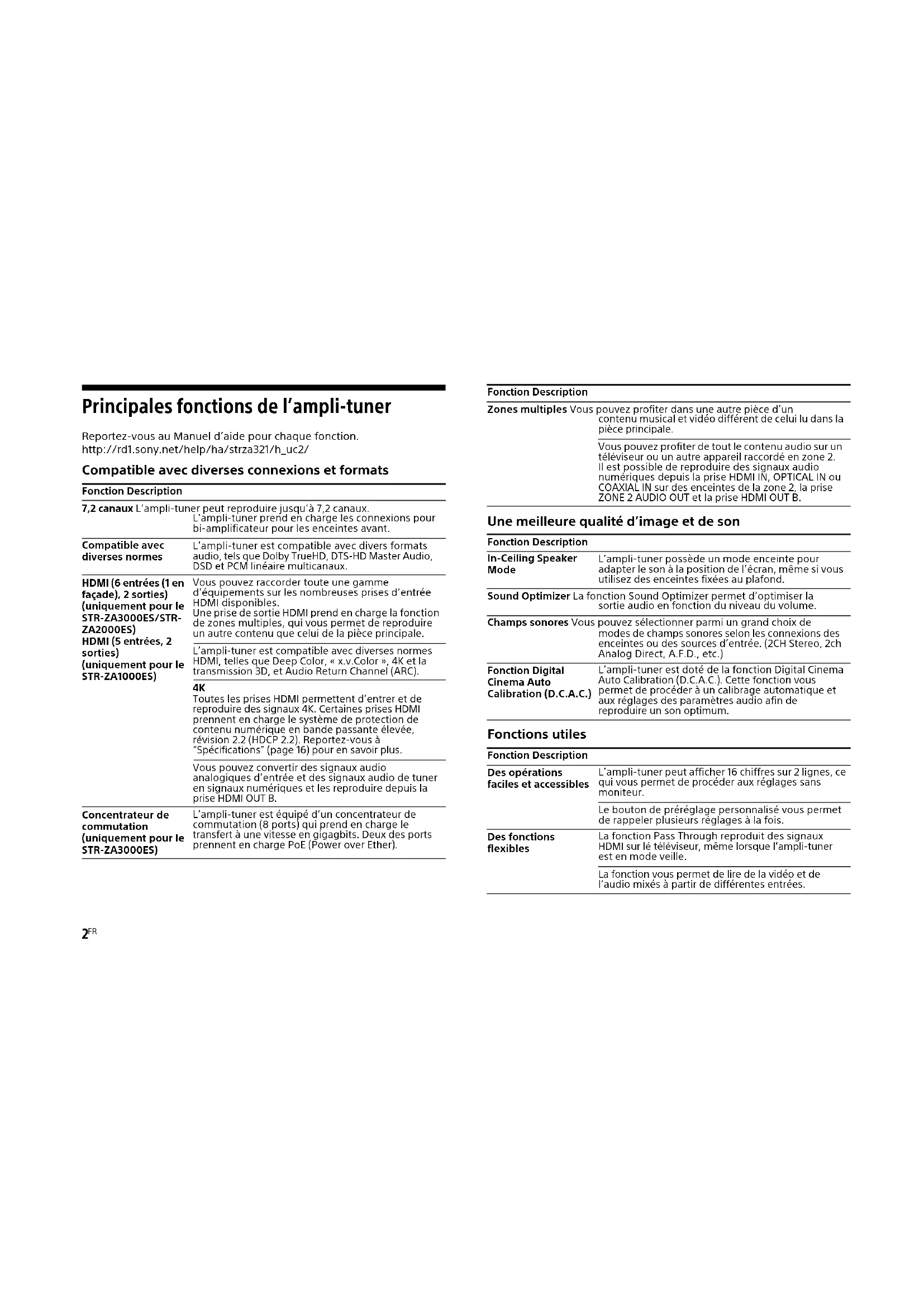Toutes les prises HDMI permettent d’entrer et de reproduire des signaux 4K. Certaines prises HDMI prennent en charge le système de protection de contenu numérique en bande passante élevée, révision 2.2 (HDCP 2.2). Reportez-vous à “Spécifications” (page 16) pour en savoir plus. Vous pouvez convertir des signaux audio analogiques d’entrée et des signaux audio de tuner en signaux numériques et les reproduire depuis la prise HDMI OUT B. Concentrateur de commutation (uniquement pour le STR-ZA3000ES) L’ampli-tuner est équipé d’un concentrateur de commutation (8 ports) qui prend en charge le transfert à une vitesse en gigagbits. Deux des ports prennent en charge PoE (Power over Ether). Zones multiples Vous pouvez profiter dans une autre pièce d’un contenu musical et vidéo différent de celui lu dans la pièce principale. Vous pouvez profiter de tout le contenu audio sur un téléviseur ou un autre appareil raccordé en zone 2. Il est possible de reproduire des signaux audio numériques depuis la prise HDMI IN, OPTICAL IN ou COAXIAL IN sur des enceintes de la zone 2, la prise ZONE 2 AUDIO OUT et la prise HDMI OUT B. Fonction Description In-Ceiling Speaker Mode L’ampli-tuner possède un mode enceinte pour adapter le son à la position de l’écran, même si vous utilisez des enceintes fixées au plafond. Sound Optimizer La fonction Sound Optimizer permet d’optimiser la sortie audio en fonction du niveau du volume. Champs sonores Vous pouvez sélectionner parmi un grand choix de modes de champs sonores selon les connexions des enceintes ou des sources d’entrée. (2CH Stereo, 2ch Analog Direct, A.F.D., etc.) Fonction Digital Cinema Auto Calibration (D.C.A.C.) L’ampli-tuner est doté de la fonction Digital Cinema Auto Calibration (D.C.A.C.). Cette fonction vous permet de procéder à un calibrage automatique et aux réglages des paramètres audio afin de reproduire un son optimum. Fonction Description Des opérations faciles et accessibles L’ampli-tuner peut afficher 16 chiffres sur 2 lignes, ce qui vous permet de procéder aux réglages sans moniteur. Le bouton de préréglage personnalisé vous permet de rappeler plusieurs réglages à la fois. Des fonctions flexibles La fonction Pass Through reproduit des signaux HDMI sur lé téléviseur, même lorsque l’ampli-tuner est en mode veille. La fonction vous permet de lire de la vidéo et de l’audio mixés à partir de différentes entrées. Fonction Description3