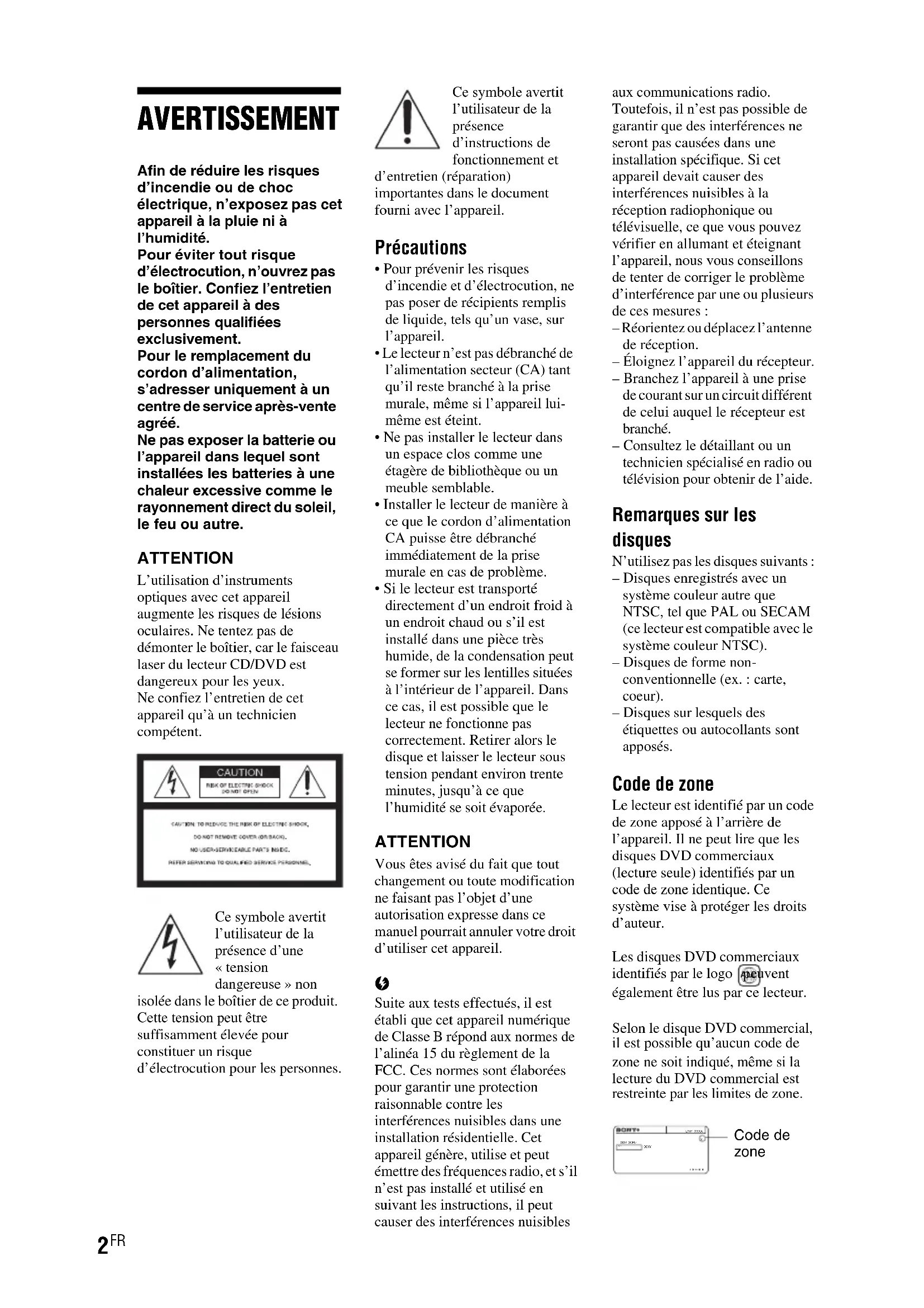 AVERTISSEMENT Afin de réduire les risques d’incendie ou de choc électrique, n’exposez pas cet appareil à la pluie ni à l’humidité.Pour éviter tout risque d’électrocution, n’ouvrez pas le boîtier. Confiez l’entretien de cet appareil à des personnes qualifiées exclusivement.Pour le remplacement du cordon d’alimentation, s’adresser uniquement à un centre de service après-vente agréé.Ne pas exposer la batterie ou l’appareil dans lequel sont installées les batteries à une chaleur excessive comme le rayonnement direct du soleil, le feu ou autre. ATTENTION L’utilisation d’instruments optiques avec cet appareil augmente les risques de lésions oculaires. Ne tentez pas de démonter le boîtier, car le faisceau laser du lecteur CD/DVD est dangereux pour les yeux.Ne confiez l’entretien de cet appareil qu’à un technicien compétent.Ce symbole avertit l’utilisateur de la présence d’une « tension dangereuse » non isolée dans le boîtier de ce produit. Cette tension peut être suffisamment élevée pour constituer un risque d’électrocution pour les personnes.Ce symbole avertit l’utilisateur de la présence d’instructions de fonctionnement et d’entretien (réparation) importantes dans le document fourni avec l’appareil. Précautions