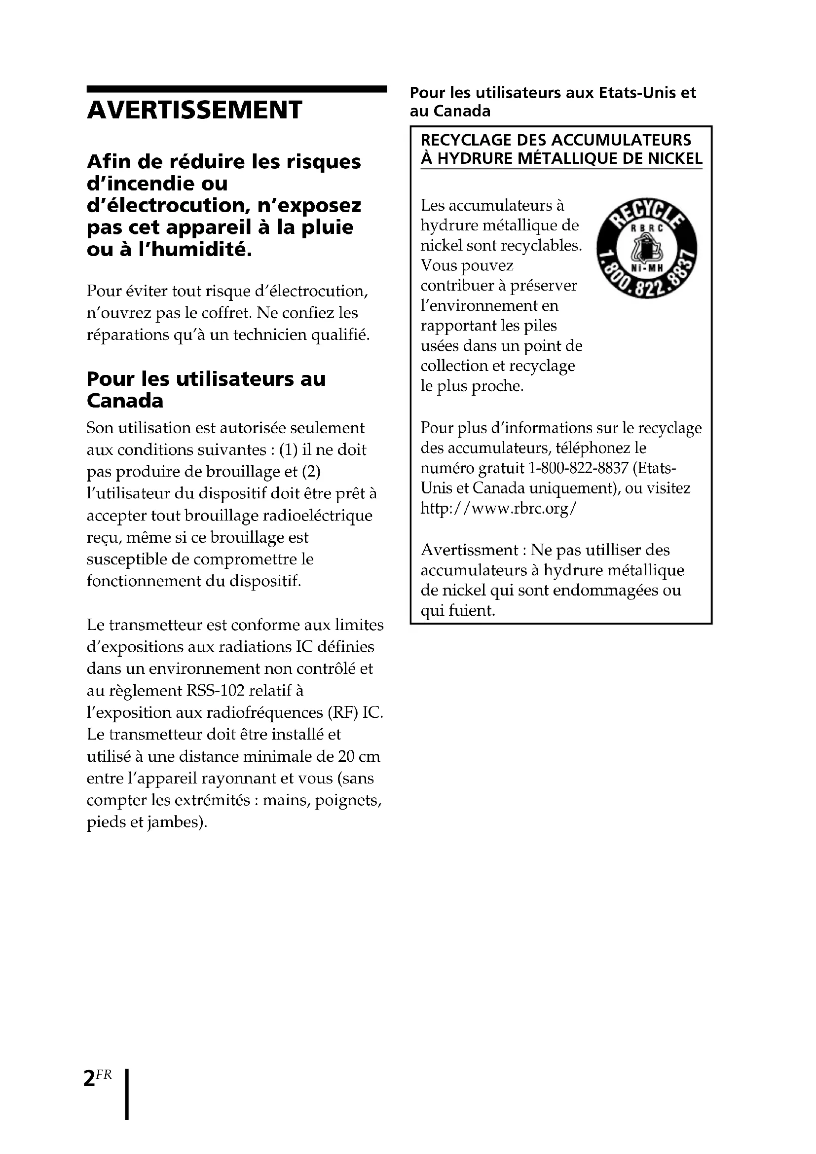 Les accumulateurs à hydrure métallique de nickel sont recyclables. Vous pouvez contribuer à préserver l’environnement en rapportant les piles usées dans un point de collection et recyclage le plus proche. Pour plus d’informations sur le recyclage des accumulateurs, téléphonez le numéro gratuit 1-800-822-8837 (Etats- Unis et Canada uniquement), ou visitez http://www.rbrc.org/ Avertissment : Ne pas utilliser des accumulateurs à hydrure métallique de nickel qui sont endommagées ou qui fuient. AVERTISSEMENT Afin de réduire les risques d’incendie ou d’électrocution, n’exposez pas cet appareil à la pluie ou à l’humidité. Pour éviter tout risque d’électrocution, n’ouvrez pas le coffret. Ne confiez les réparations qu’à un technicien qualifié. Pour les utilisateurs au Canada Son utilisation est autorisée seulement aux conditions suivantes : (1) il ne doit pas produire de brouillage et (2) l’utilisateur du dispositif doit être prêt à accepter tout brouillage radioeléctrique reçu, même si ce brouillage est susceptible de compromettre le fonctionnement du dispositif. Le transmetteur est conforme aux limites d’expositions aux radiations IC définies dans un environnement non contrôlé et au règlement RSS-102 relatif à l’exposition aux radiofréquences (RF) IC. Le transmetteur doit être installé et utilisé à une distance minimale de 20 cm entre l’appareil rayonnant et vous (sans compter les extrémités : mains, poignets, pieds et jambes).3