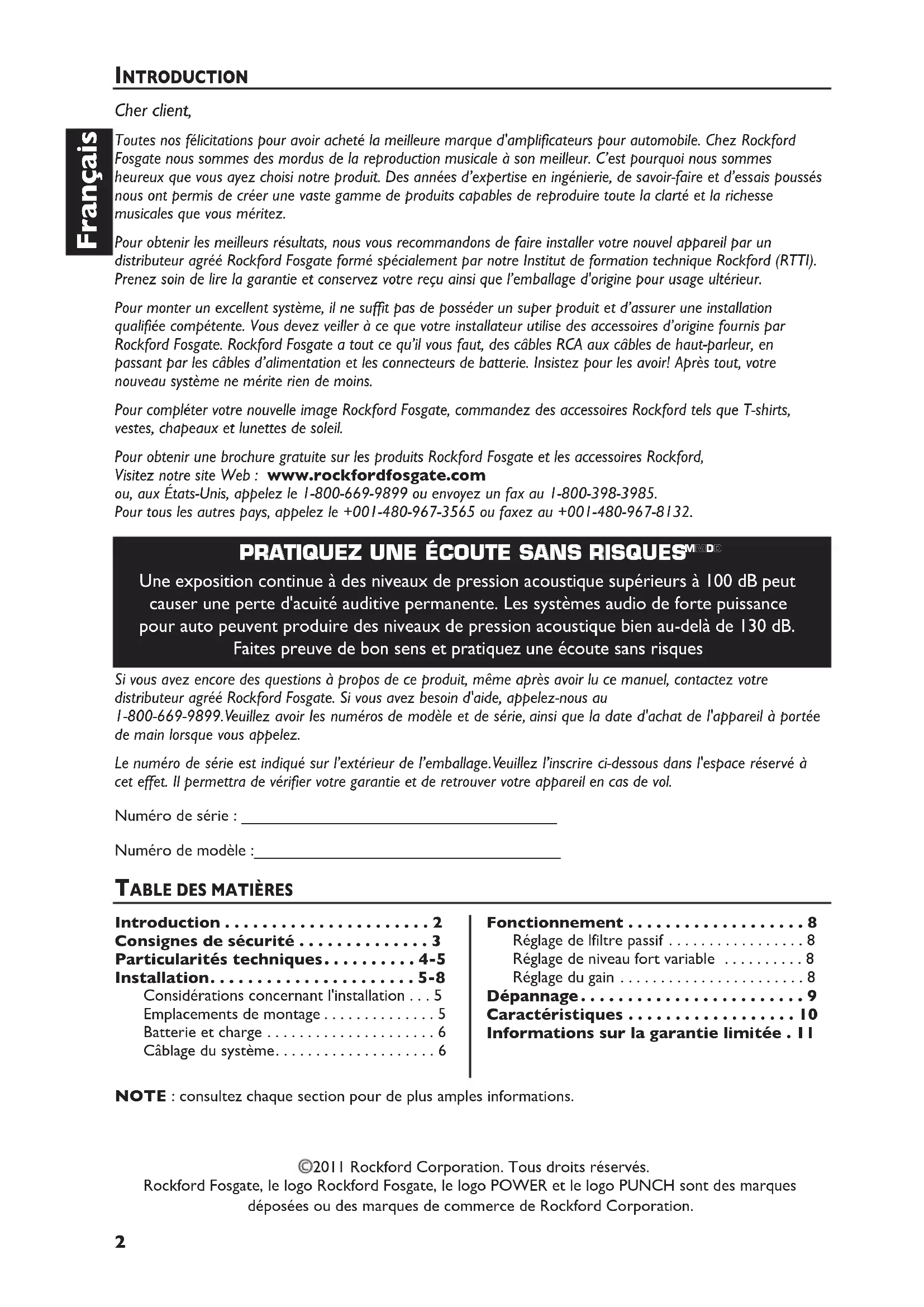 Cher client, Toutes nos félicitations pour avoir acheté la meilleure marque d'amplificateurs pour automobile. Chez Rockford Fosgate nous sommes des mordus de la reproduction musicale à son meilleur. C’est pourquoi nous sommes heureux que vous ayez choisi notre produit. Des années d’expertise en ingénierie, de savoir-faire et d’essais poussés nous ont permis de créer une vaste gamme de produits capables de reproduire toute la clarté et la richesse musicales que vous méritez. Pour obtenir les meilleurs résultats, nous vous recommandons de faire installer votre nouvel appareil par un distributeur agréé Rockford Fosgate formé spécialement par notre Institut de formation technique Rockford (RTTI). Prenez soin de lire la garantie et conservez votre reçu ainsi que l’emballage d'origine pour usage ultérieur. Pour monter un excellent système, il ne suffit pas de posséder un super produit et d’assurer une installation qualifiée compétente. Vous devez veiller à ce que votre installateur utilise des accessoires d’origine fournis par Rockford Fosgate. Rockford Fosgate a tout ce qu’il vous faut, des câbles RCA aux câbles de haut-parleur, en passant par les câbles d’alimentation et les connecteurs de batterie. Insistez pour les avoir! Après tout, votre nouveau système ne mérite rien de moins. Pour compléter votre nouvelle image Rockford Fosgate, commandez des accessoires Rockford tels que T-shirts, vestes, chapeaux et lunettes de soleil. Pour obtenir une brochure gratuite sur les produits Rockford Fosgate et les accessoires Rockford, Visitez notre site Web : www.rockfordfosgate.com ou, aux États-Unis, appelez le 1-800-669-9899 ou envoyez un fax au 1-800-398-3985. Pour tous les autres pays, appelez le +001-480-967-3565 ou faxez au +001-480-967-8132.