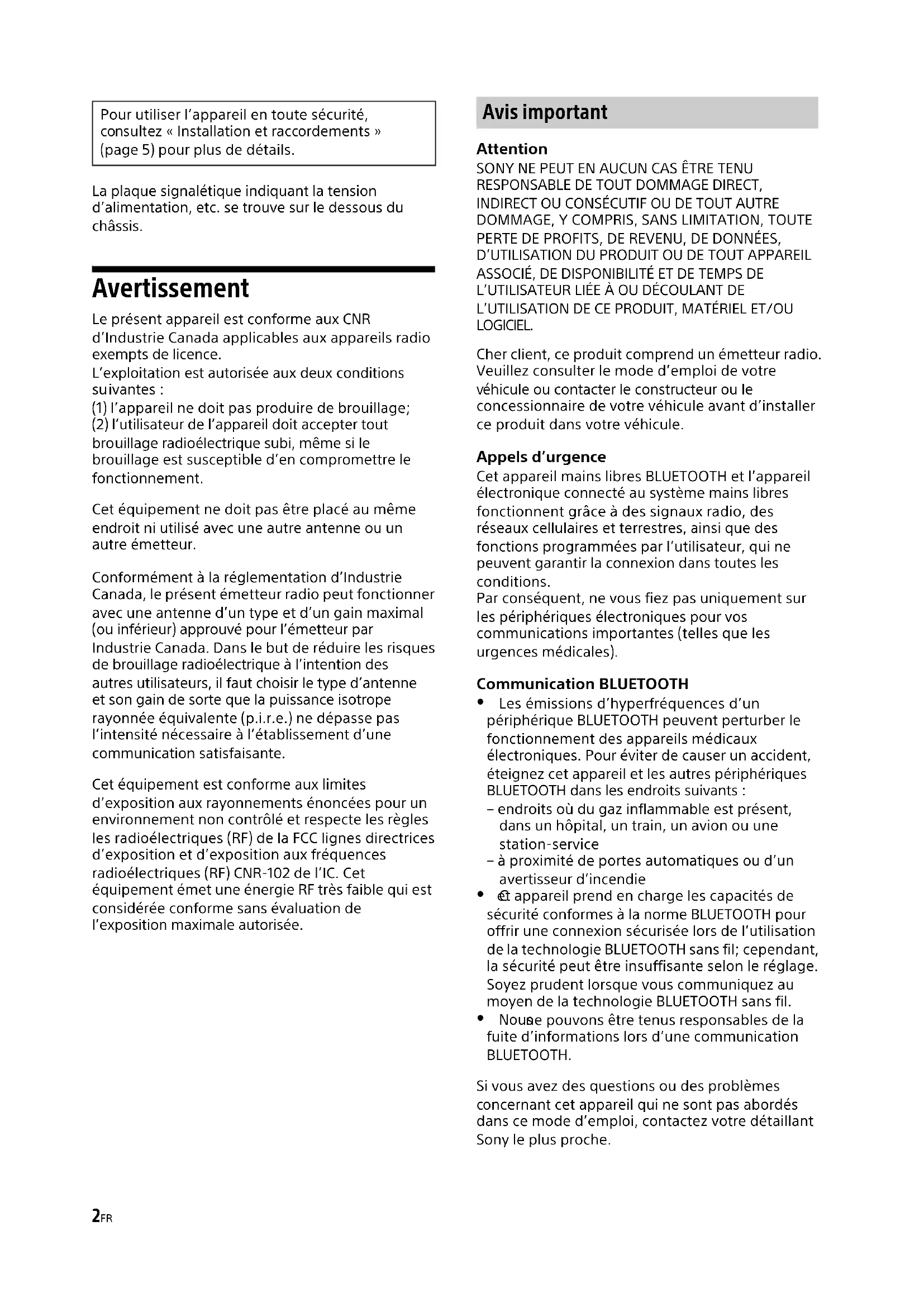 oncernant cet appareil qui ne sont pas abordés dans ce mode d’emploi, contactez votre détaillant Sony le plus proche. Pour utiliser l’appareil en toute sécurité,