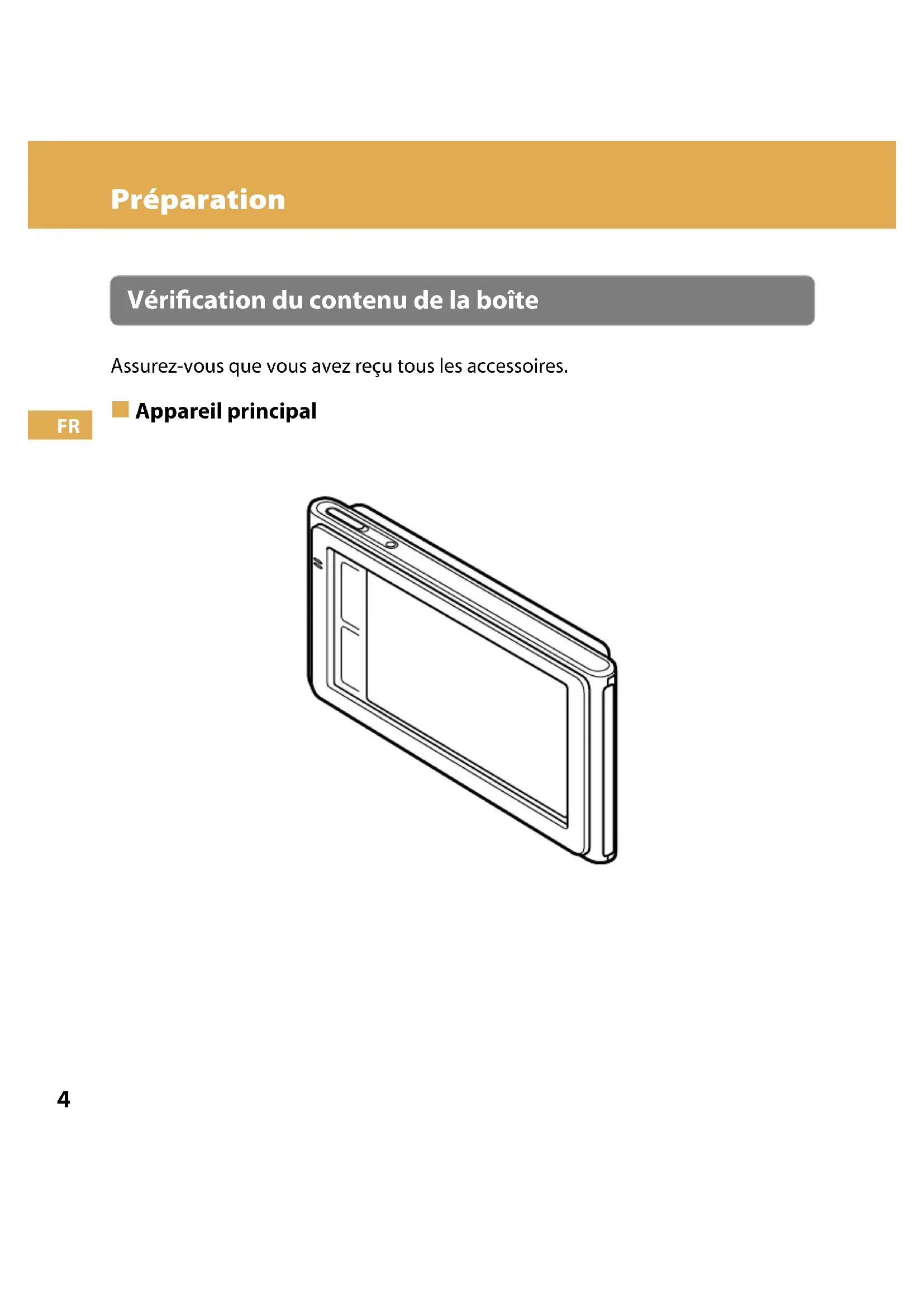 Préparation Vérification du contenu de la boîte Assurez-vous que vous avez reçu tous les accessoires. Appareil principalSONY NV-U94T/U84 (US,FR,ES) 4-107-848-11 (1)
