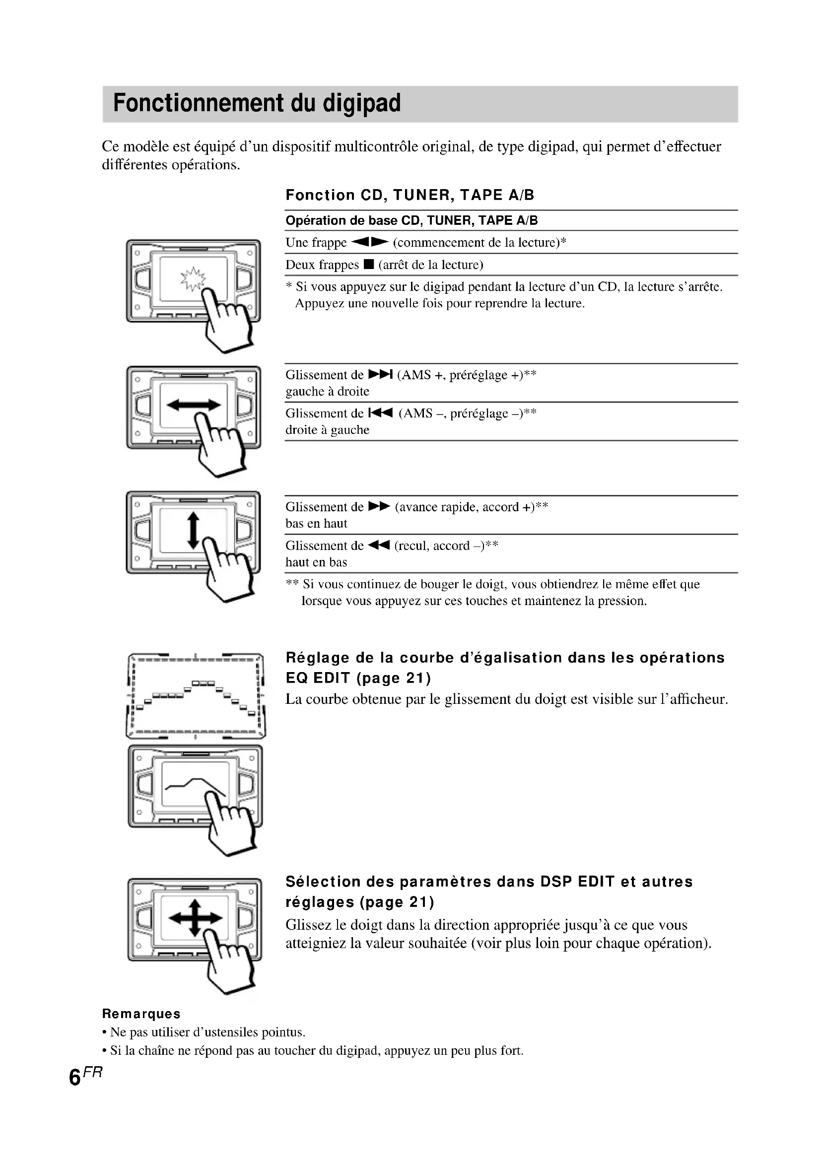 Fonctionnement du digipad Ce modèle est équipé d’un dispositif multicontrôle original, de type digipad, qui permet d’effectuer différentes opérations. Fonction CD, TUNER, TAPE A/B Opération de base CD, TUNER, TAPE A/BUne frappe nN (commencement de la lecture)*Deux frappes x (arrêt de la lecture)* Si vous appuyez sur le digipad pendant la lecture d’un CD, la lecture s’arrête.Appuyez une nouvelle fois pour reprendre la lecture.Glissement de > (AMS +, préréglage +)**gauche à droiteGlissement de . (AMS –, préréglage –)**droite à gaucheGlissement de M (avance rapide, accord +)**bas en hautGlissement de m (recul, accord –)**haut en bas** Si vous continuez de bouger le doigt, vous obtiendrez le même effet que lorsque vous appuyez sur ces touches et maintenez la pression. Réglage de la courbe d’égalisation dans les opérations EQ EDIT (page 21) La courbe obtenue par le glissement du doigt est visible sur l’afficheur. Sélection des paramètres dans DSP EDIT et autres réglages (page 21) Glissez le doigt dans la direction appropriée jusqu’à ce que vous atteigniez la valeur souhaitée (voir plus loin pour chaque opération). Remarques• Ne pas utiliser d’ustensiles pointus.• Si la chaîne ne répond pas au toucher du digipad, appuyez un peu plus fort.7