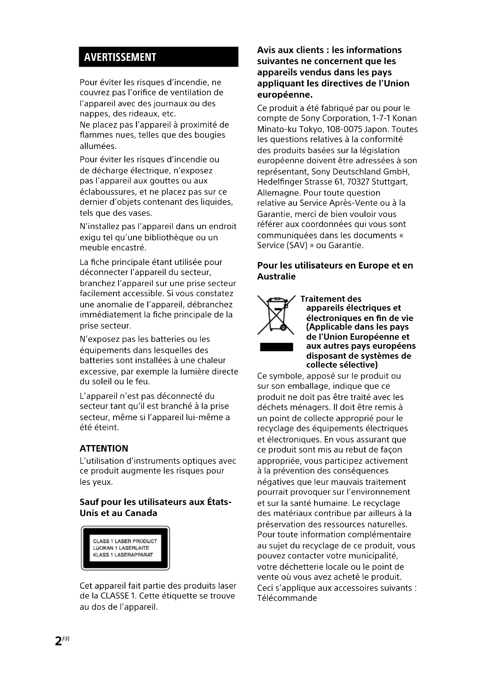 MHC-EC619iP.4-467-785-52(1) AVERTISSEMENT Pour éviter les risques d’incendie, ne couvrez pas l’orice de ventilation de l’appareil avec des journaux ou des nappes, des rideaux, etc. Ne placez pas l’appareil à proximité de ammes nues, telles que des bougies allumées. Pour éviter les risques d’incendie ou de décharge électrique, n’exposez pas l’appareil aux gouttes ou aux éclaboussures, et ne placez pas sur ce dernier d’objets contenant des liquides, tels que des vases. N’installez pas l’appareil dans un endroit exigu tel qu’une bibliothèque ou un meuble encastré. La che principale étant utilisée pour déconnecter l’appareil du secteur, branchez l’appareil sur une prise secteur facilement accessible. Si vous constatez une anomalie de l’appareil, débranchez immédiatement la che principale de la prise secteur. N’exposez pas les batteries ou les équipements dans lesquelles des batteries sont installées à une chaleur excessive, par exemple la lumière directe du soleil ou le feu. L’appareil n’est pas déconnecté du secteur tant qu’il est branché à la prise secteur, même si l’appareil lui-même a été éteint. ATTENTION L’utilisation d’instruments optiques avec ce produit augmente les risques pour les yeux. Sauf pour les utilisateurs aux États- Unis et au Canada Cet appareil fait partie des produits laser de la CLASSE 1. Cette étiquette se trouve au dos de l’appareil. Avis aux clients : les informations suivantes ne concernent que les appareils vendus dans les pays appliquant les directives de l’Union européenne. Ce produit a été fabriqué par ou pour le compte de Sony Corporation, 1-7-1 Konan Minato-ku Tokyo, 108-0075 Japon. Toutes les questions relatives à la conformité des produits basées sur la législation européenne doivent être adressées à son représentant, Sony Deutschland GmbH, Hedelnger Strasse 61, 70327 Stuttgart, Allemagne. Pour toute question relative au Service Après-Vente ou à la Garantie, merci de bien vouloir vous référer aux coordonnées qui vous sont communiquées dans les documents « Service (SAV) » ou Garantie. Pour les utilisateurs en Europe et en Australie Traitement des appareils électriques et électroniques en n de vie (Applicable dans les pays de l’Union Européenne et aux autres pays européens disposant de systèmes de collecte sélective) Ce symbole, apposé sur le produit ou sur son emballage, indique que ce produit ne doit pas être traité avec les déchets ménagers. Il doit être remis à un point de collecte approprié pour le recyclage des équipements électriques et électroniques. En vous assurant que ce produit sont mis au rebut de façon appropriée, vous participez activement à la prévention des conséquences négatives que leur mauvais traitement pourrait provoquer sur l’environnement et sur la santé humaine. Le recyclage des matériaux contribue par ailleurs à la préservation des ressources naturelles. Pour toute information complémentaire au sujet du recyclage de ce produit, vous pouvez contacter votre municipalité, votre déchetterie locale ou le point de vente où vous avez acheté le produit. Ceci s’applique aux accessoires suivants : Télécommande3