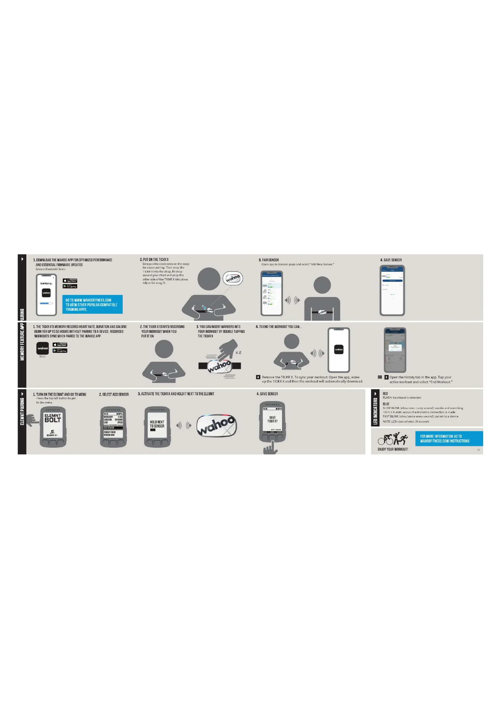 LE TICKR X // 4. À LA FIN DE LA SÉANCE, VOUS POUVEZ ...A. supprimer le TICKR X, ou B. ouvrir l'appli et sélectionner "arrêter l'entraînement" // 5. RÉVEILLEZ TICKR X ET OUVREZ L'APPLI WAHOO POUR ASSOCIER ET AUTOMATIQUEMENT SYNCHRONISER VOS ENTRAÎNEMENTS ASSOCIATION DU ELEMNT 1. ACTIVEZ L'ELEMNT ET ALLEZ DANS MENU. Appuyez sur le bouton en haut à gauche pour obtenir le menu. // 2. SÉLECTIONNEZ AJOUTER UN CAPTEUR // 3. ACTIVEZ LE TICKR ET TENEZ-LE PRÈS DE L'ELEMNT // 4. ENREGISTREZ LE CAPTEUR INDICATEURS LUMINEUX ROUGE - FLASH : à chaque pulsation cardiaque détectée // BLEU - CLIGNOTEMENT LENT (à peu près chaque seconde) : activé mais pas synchronisé. 3 CLIGNOTEMENTS : se produit dès qu’une connexion est établie. CLIGNOTEMENT RAPIDE (à peu près 2 par seconde) : associé à un appareil. // Note : les indicateurs lumineux s'arrêtent après 30 secondes FRENCH ABBINAMENTO DELL'APP 1. SCARICARE L'APP WAHOO PER PRESTAZIONI OTTIMIZZATE E AGGIORNAMENTI DEL FIRMWARE ESSENZIALI. Verificare che il Bluetooth sia acceso. // 2. INDOSSARE IL TICKR X. Per un abbinamento più semplice inumidire gli elettrodi sulla fascia. Fissare poi TICKR X sulla fascia, adattarla attorno al torace e fissare l'altro lato del TICKR X nella sua sede. Regolare la lunghezza per un'aderenza perfetta. // 3. ABBINARE TICKR X. Aprire l'app sulla pagina Sensori e selezionare Abbina sensore. //
