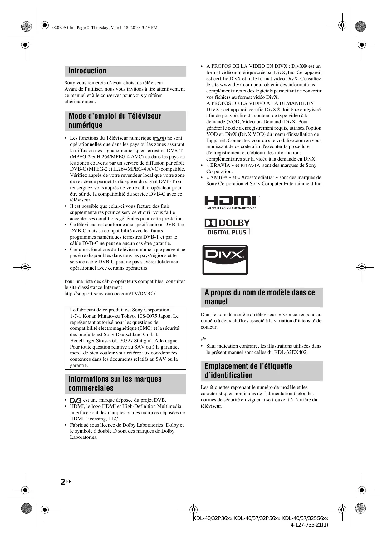 - Certaines fonctions du Téléviseur numérique peuvent ne pas être disponibles dans tous les pays/régions et le service câblé DVB-C peut ne pas s'avérer totalement opérationnel avec certains opérateurs. Pour une liste des câblo-opérateurs compatibles, consulter le site d'assistance Internet : http://support.sony-europe.com/TV/DVBC/ Le fabricant de ce produit est Sony Corporation, 1-7-1 Konan Minato-ku Tokyo, 108-0075 Japon. Le représentant autorisé pour les questions de compatibilité électromagnétique (EMC) et la sécurité des produits est Sony Deutschland GmbH, Hedelfinger Strasse 61, 70327 Stuttgart, Allemagne. Pour toute question relative au SAV ou à la garantie, merci de bien vouloir vous référer aux coordonnées contenues dans les documents relatifs au SAV ou la garantie. Informations sur les marques commerciales est une marque déposée du projet DVB.