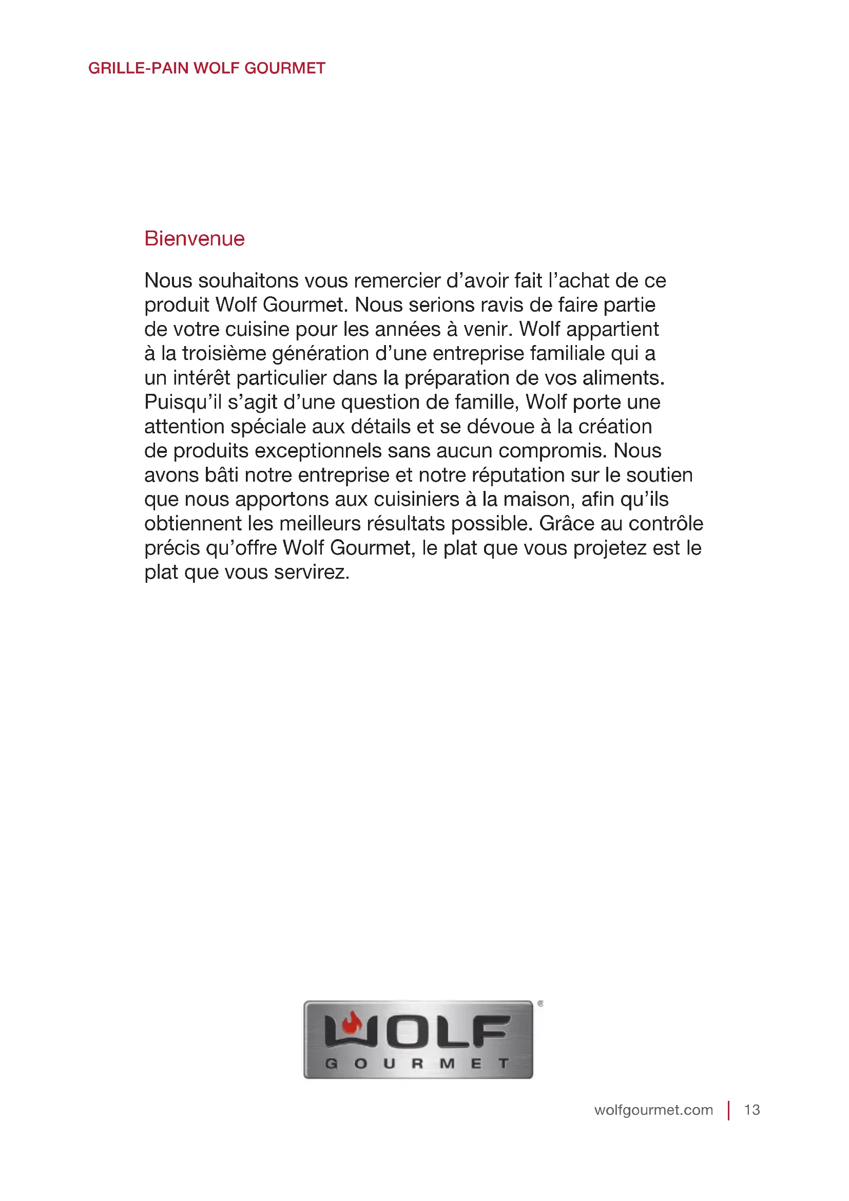 En tant que propriété d'un apparil Wolf Goumet, vous pouvez compter sur notre appui. Notre centre de service à la clientèle est ouvert à toute heures du jour et de la nuit, et ce, toute la semaine. En outre, il compte sur des experts des produits se trouvant à notre siège de Madison au Wisconsin. Si le besoin se fait sentir, vous n'avez qu'à composer le 800.222.7820 pour parler à un de nos experts. Nous sommes certains que le présente manuel répondra aux interrogations que vous pourriez avoir concernant les fonctions, l'utilisation et l'entretien de votre produit Wolf Gourmet. Toutefois, si vous avez d'autres questions, veuillez nous contacter par téléphone ou nous visitor en ligne sur wolfgourmet.com.