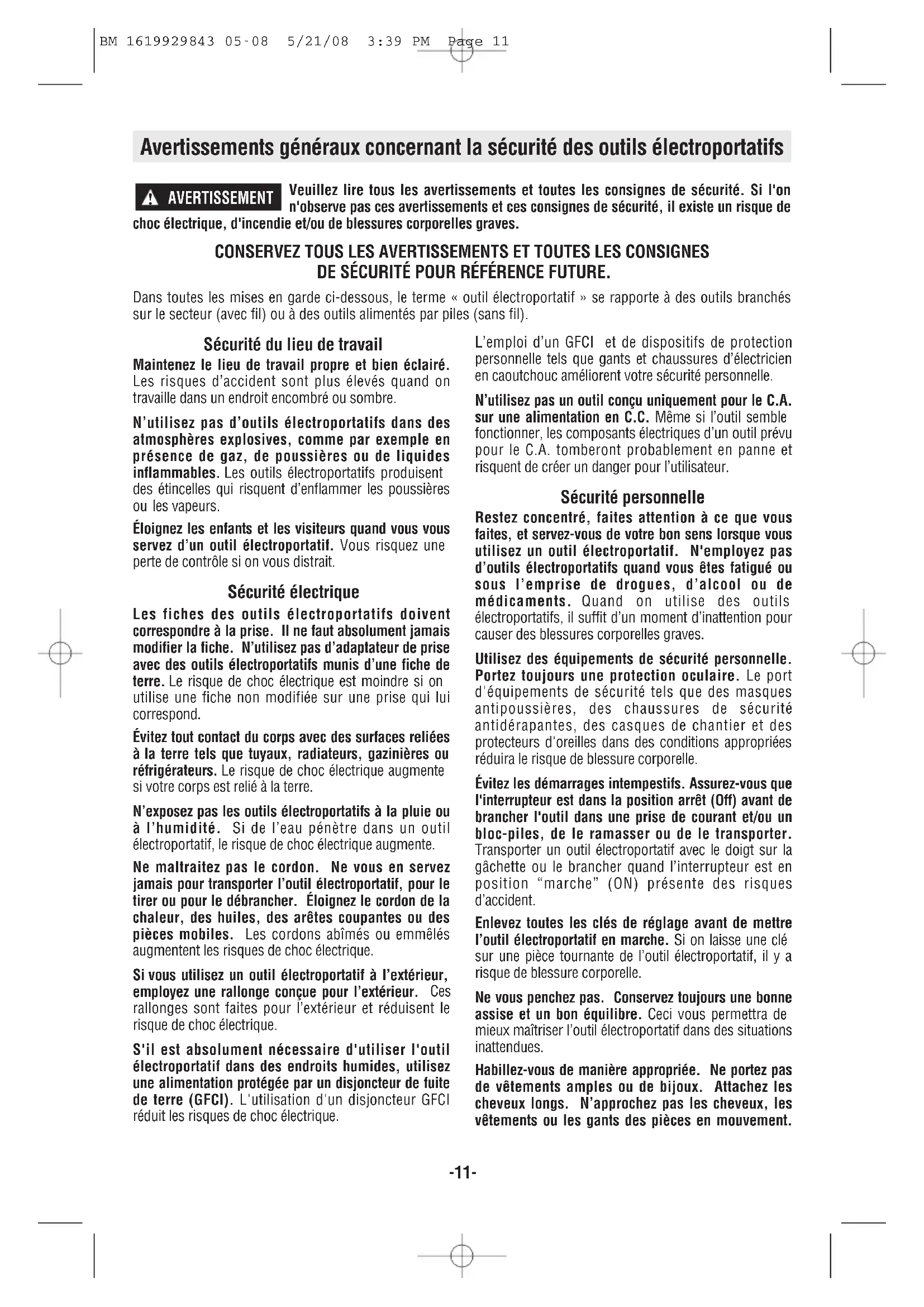 12 — — — — — — 5 50 100 150 15 30 60 120Cord Length in Feet Cord Length in Meters BM 1619929843 05-08 5/21/08 3:39 PM Page 10-11- Veuillez lire tous les avertissements et toutes les consignes de sécurité. Si l'on n'observe pas ces avertissements et ces consignes de sécurité, il existe un risque de choc électrique, d'incendie et/ou de blessures corporelles graves. CONSERVEZ TOUS LES AVERTISSEMENTS ET TOUTES LES CONSIGNES DE SÉCURITÉ POUR RÉFÉRENCE FUTURE. Dans toutes les mises en garde ci-dessous, le terme « outil électroportatif » se rapporte à des outils branchés sur le secteur (avec fil) ou à des outils alimentés par piles (sans fil). Avertissements généraux concernant la sécurité des outils électroportatifs AVERTISSEMENT