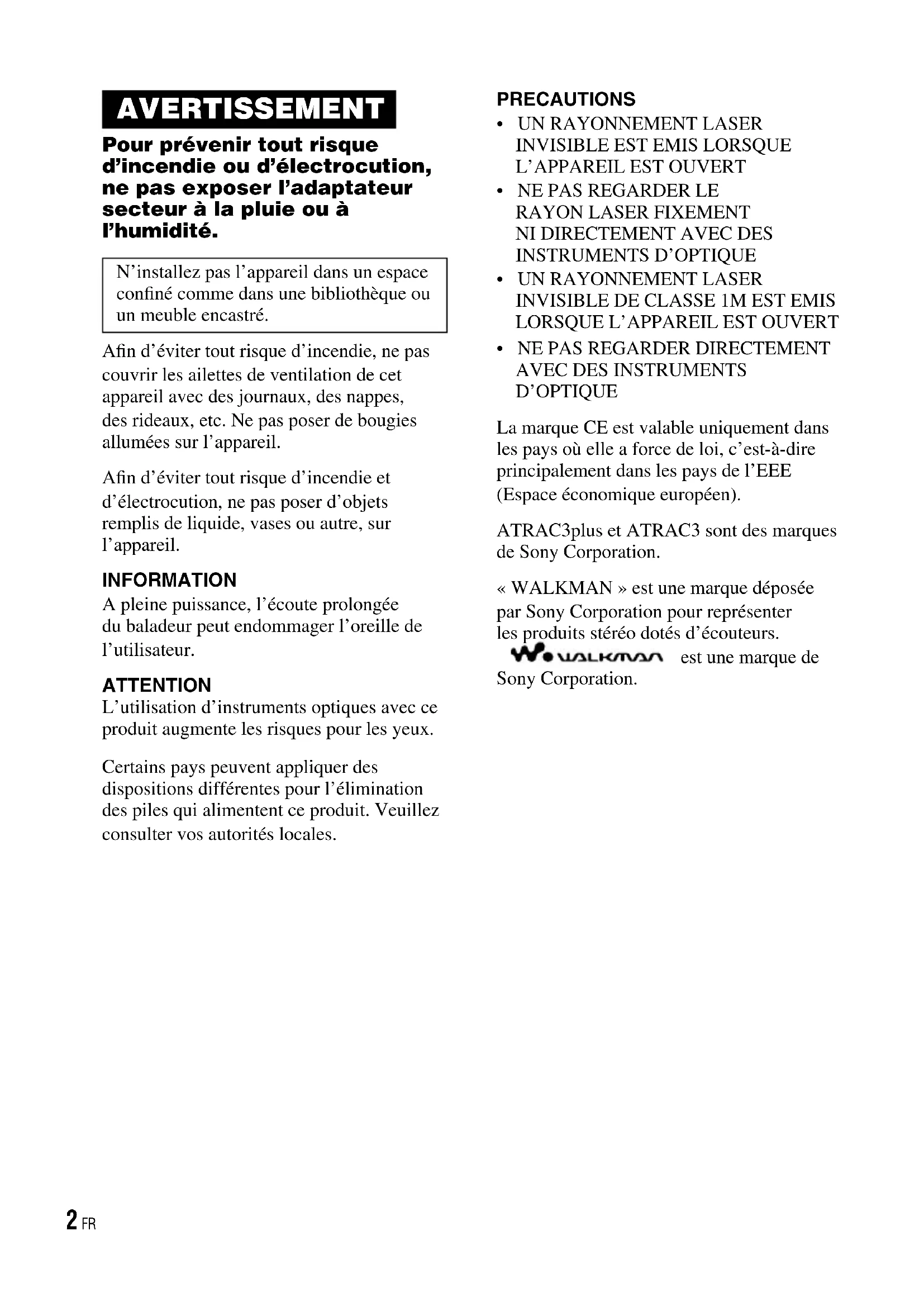- Si des chiers ATRAC3plus/ATRAC3 et MP3 sont enregistrés sur le même CD, le lecteur CD lit les chiers ATRAC3plus/ATRAC3 en premier. • La capacité de lecture du lecteur CD peut varier suivant la qualité du disque et l’état du matériel d’enregistrement.• Les caractères utilisables sont les suivants : A à Z, a à z, 0 à 9, et _ (tiret bas).• N’enregistrez pas de chiers d’un format différent et ne créez pas de dossiers inutiles sur un disque qui contient des chiers ATRAC3plus/ATRAC3/ MP3. A propos des ATRAC CD• Les CD-R/CD-RW enregistrés au format ATRAC3plus/ATRAC3 ne peuvent pas être lus par votre ordinateur.A propos des CD MP3• N’oubliez pas d’ajouter l’extension « mp3 » au nom du chier. Cependant, si vous ajoutez l’extension « mp3 » à un chier autre qu’un chier MP3, le lecteur ne reconnaîtra pas le chier correctement. • Ce lecteur CD peut lire à une vitesse comprise entre 16 et 320 Kbit/s et à des fréquences d’échantillonnage de 32, 44,1 ou 48 kHz. Les chiers à débit binaire variable (VBR, Variable Bit Rate) peuvent également être lus. • Pour compresser une source dans un chier MP3, nous vous recommandons de régler les paramètres de compression sur « 44,1 kHz », « 128 Kbit/s », et « débit binaire constant ».• Pour enregistrer jusqu’à la capacité maximale, réglez le logiciel de gravure sur « interruption de la gravure ».• Pour enregistrer jusqu’à la capacité maximale en une seule fois sur un support vierge, réglez le logiciel de gravure sur « un seul disque ». D-NS707F.US.3-267-208-11(1) 6 FR D-NS707F.US.3-267-208-11(1) 7 FRPrécautions Sécurité