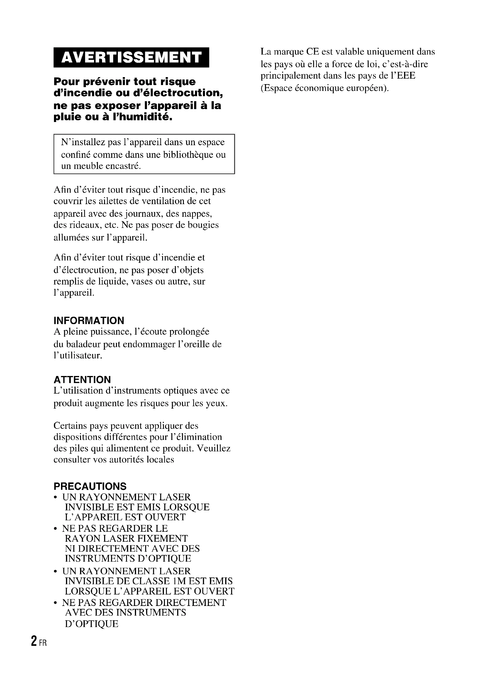 - D’OPTIQUE La marque CE est valable uniquement dans les pays où elle a force de loi, c’est-à-dire principalement dans les pays de l’EEE (Espace économique européen). D-NF420.FR.2-318-768-22(1) 2 FRLe mode d’emploi décrit l’utilisation du lecteur CD. Pour l’utilisation du logiciel SonicStage fourni, référez-vous au « Guide d’installation/utilisation ». Remarques à l’attention des utilisateurs Concernant le logiciel fourniEn fonction du type de texte et des caractères, il se peut que le texte affiché sur SonicStage ne s’affiche pas correctement sur le périphérique. Les causes de ce problème sont :– Les limites du lecteur connecté.– Un fonctionnement anormal du lecteur.ATRAC3plus est une marque déposée par Sony Corporation.« WALKMAN » est une marque déposée par Sony Corporation pour représenter les produits stéréo dotés d’écouteurs. est une marque de Sony Corporation. Table des matières Créez vos propres ATRAC CD p. 4