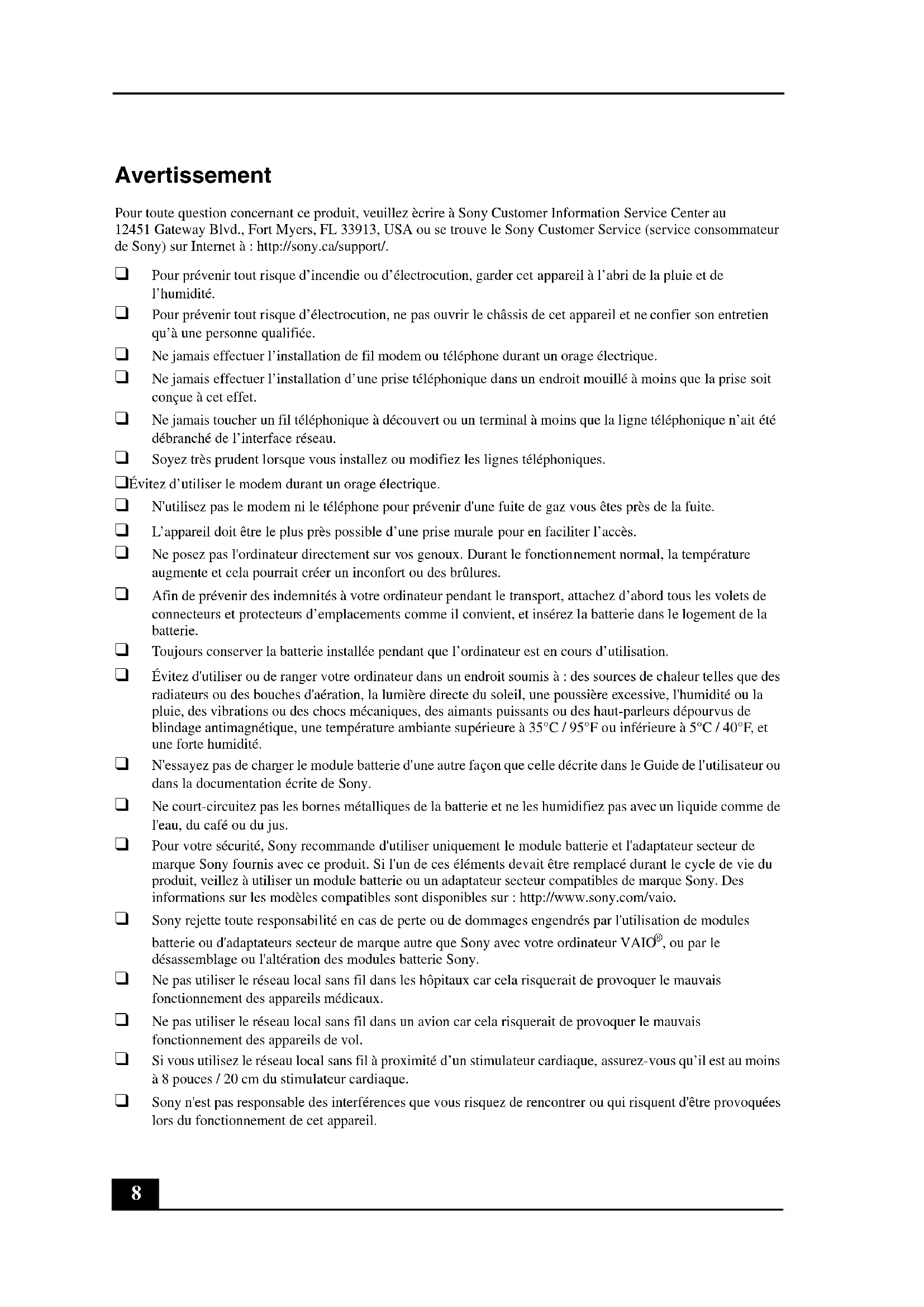 Wireless LAN Security Creating security settings for the Wireless LAN is extremely important. Sony assumes no responsibility for any security problems that may arise from the use of the Wireless LAN. For models with the wireless WAN function only To change the backup battery, please contact your nearest Sony Service Center. Caution - To reduce the risk of fire, use only No. 26 AWG or larger UL Listed or CSA certified telecommunication line cord. Only use Wireless LAN indoors when using it with IEEE 802.11a (5 GHz). High power radars are allocated as primary users (meaning they have priority) of 5250-5350 MHz and 5650- 5850 MHz and these radars could cause interference and/or damage to this device. This device uses the 5 GHz band for wireless LAN communication and the maximum gain of the antenna in this device is 5 dBi. Licensed by QUALCOMM Incorporated under one or more of the following Patents: 4,901,307 5,490,165 5,056,109 5,504,773 5,101,501 5,506,865 5,109,390 5,511,073 5,228,054 5,535,239 5,267,261 5,544,196 5,267,262 5,568,483 5,337,338 5,600,754 5,414,796 5,657,420 5,416,797 5,659,569 5,710,784 5,778,3388 Avertissement Pour toute question concernant ce produit, veuillez ècrire à Sony Customer Information Service Center au 12451 Gateway Blvd., Fort Myers, FL 33913, USA ou se trouve le Sony Customer Service (service consommateur de Sony) sur Internet à : http://sony.ca/support/. ❑ Pour prévenir tout risque d’incendie ou d’électrocution, garder cet appareil à l’abri de la pluie et de l’humidité. ❑ Pour prévenir tout risque d’électrocution, ne pas ouvrir le châssis de cet appareil et ne confier son entretien qu’à une personne qualifiée. ❑ Ne jamais effectuer l’installation de fil modem ou téléphone durant un orage électrique. ❑ Ne jamais effectuer l’installation d’une prise téléphonique dans un endroit mouillé à moins que la prise soit conçue à cet effet. ❑ Ne jamais toucher un fil téléphonique à découvert ou un terminal à moins que la ligne téléphonique n’ait été débranché de l’interface réseau. ❑ Soyez très prudent lorsque vous installez ou modifiez les lignes téléphoniques. ❑ Évitez d’utiliser le modem durant un orage électrique. ❑ N'utilisez pas le modem ni le téléphone pour prévenir d'une fuite de gaz vous êtes près de la fuite. ❑ L’appareil doit être le plus près possible d’une prise murale pour en faciliter l’accès. ❑ Ne posez pas l'ordinateur directement sur vos genoux. Durant le fonctionnement normal, la température augmente et cela pourrait créer un inconfort ou des brûlures. ❑ Afin de prévenir des indemnités à votre ordinateur pendant le transport, attachez d’abord tous les volets de connecteurs et protecteurs d’emplacements comme il convient, et insérez la batterie dans le logement de la batterie. ❑ Toujours conserver la batterie installée pendant que l’ordinateur est en cours d’utilisation. ❑ Évitez d'utiliser ou de ranger votre ordinateur dans un endroit soumis à : des sources de chaleur telles que des radiateurs ou des bouches d'aération, la lumière directe du soleil, une poussière excessive, l'humidité ou la pluie, des vibrations ou des chocs mécaniques, des aimants puissants ou des haut-parleurs dépourvus de blindage antimagnétique, une température ambiante supérieure à 35°C / 95°F ou inférieure à 5°C / 40°F, et une forte humidité. ❑ N'essayez pas de charger le module batterie d'une autre façon que celle décrite dans le Guide de l'utilisateur ou dans la documentation écrite de Sony. ❑ Ne court-circuitez pas les bornes métalliques de la batterie et ne les humidifiez pas avec un liquide comme de l'eau, du café ou du jus. ❑ Pour votre sécurité, Sony recommande d'utiliser uniquement le module batterie et l'adaptateur secteur de marque Sony fournis avec ce produit. Si l'un de ces éléments devait être remplacé durant le cycle de vie du produit, veillez à utiliser un module batterie ou un adaptateur secteur compatibles de marque Sony. Des informations sur les modèles compatibles sont disponibles sur : http://www.sony.com/vaio. ❑ Sony rejette toute responsabilité en cas de perte ou de dommages engendrés par l'utilisation de modules batterie ou d'adaptateurs secteur de marque autre que Sony avec votre ordinateur VAIO